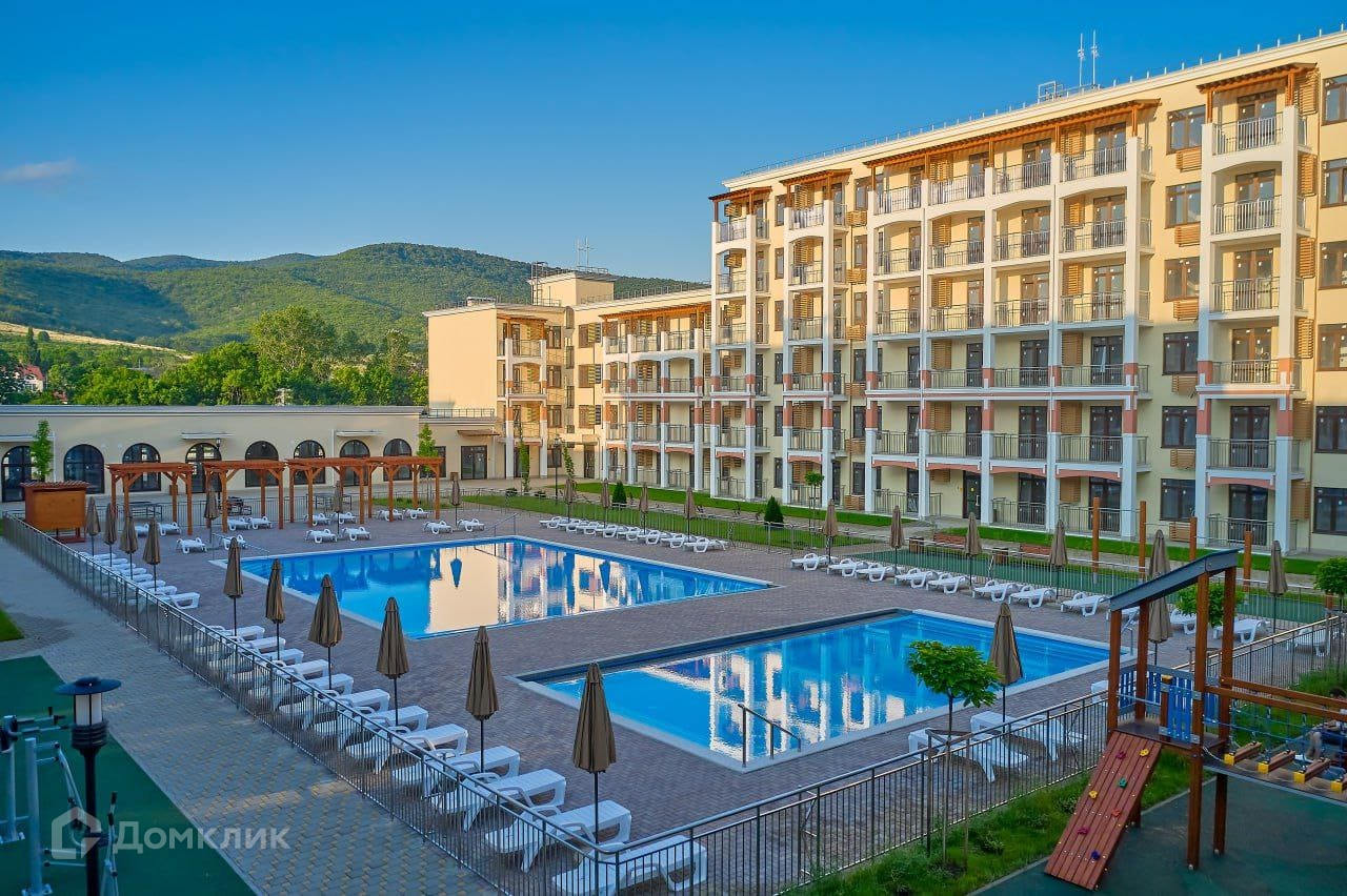 На огромной территории комплекса имеются бассейны (детский, взрослый), шезлонги, зонтики.