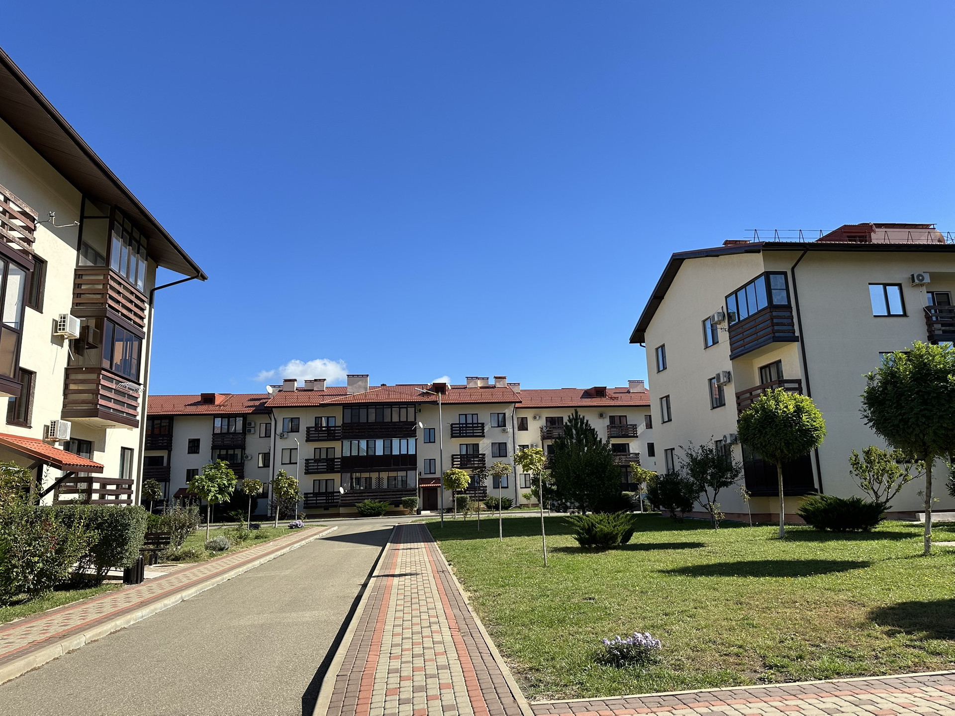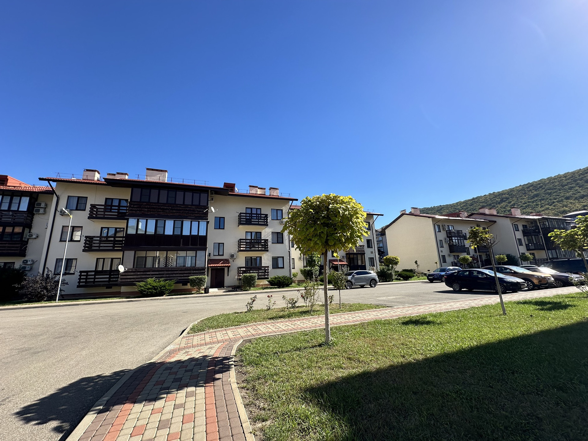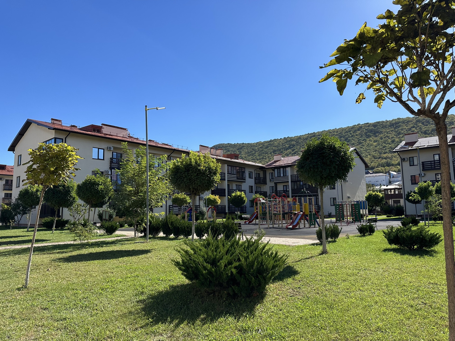 Охраняемая и благоустроенная территория, по всему комплексу имеется видеонаблюдение. На территории резиденции 3 детские игровые площадки, 1 спортивная, прогулочные зоны отдыха, 2 бассейна. Развитая инфраструктура в шаговой доступности. Жить в таком месте удовольствие. Пляж с мелкой галькой в 700 метрах.