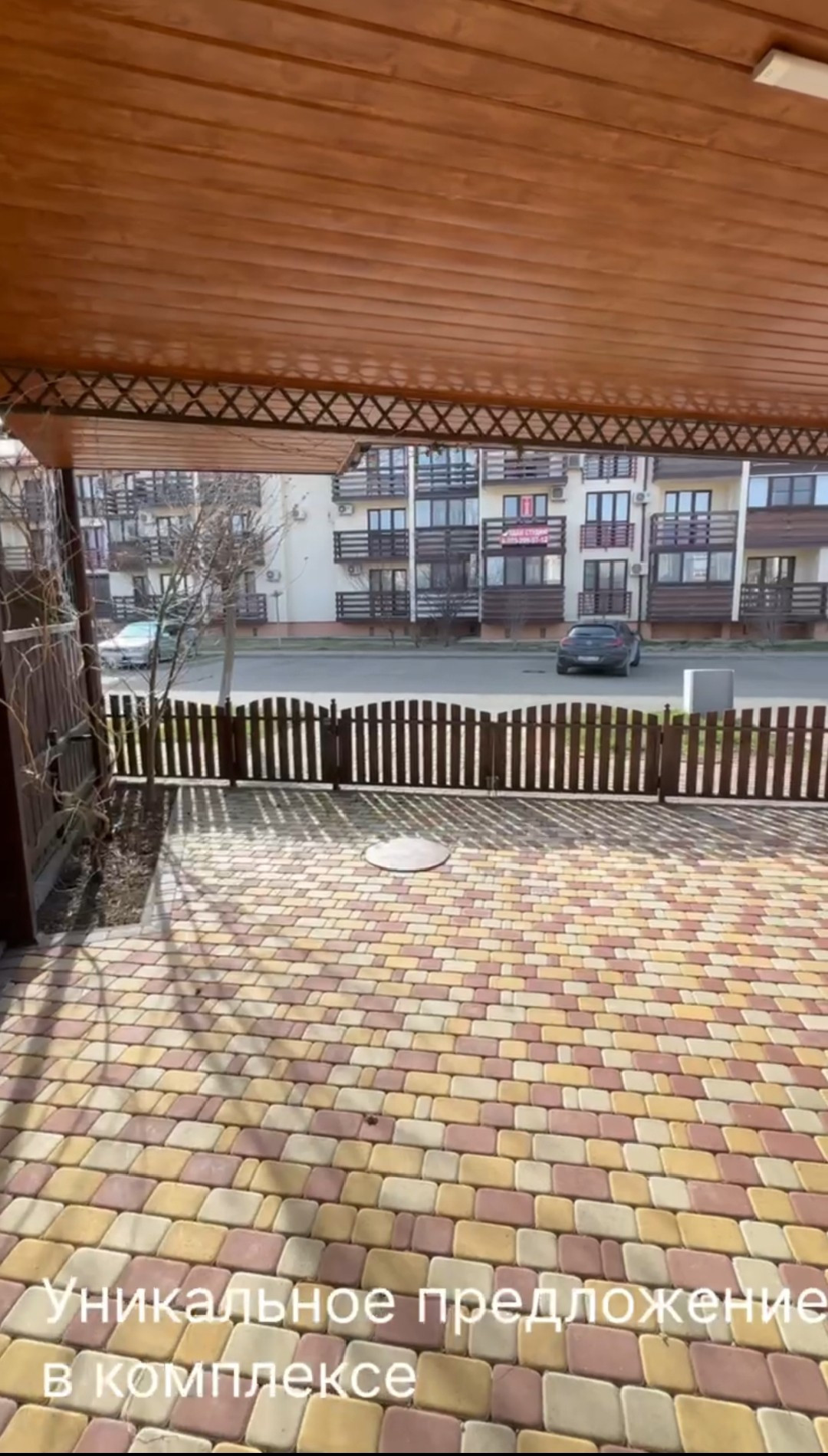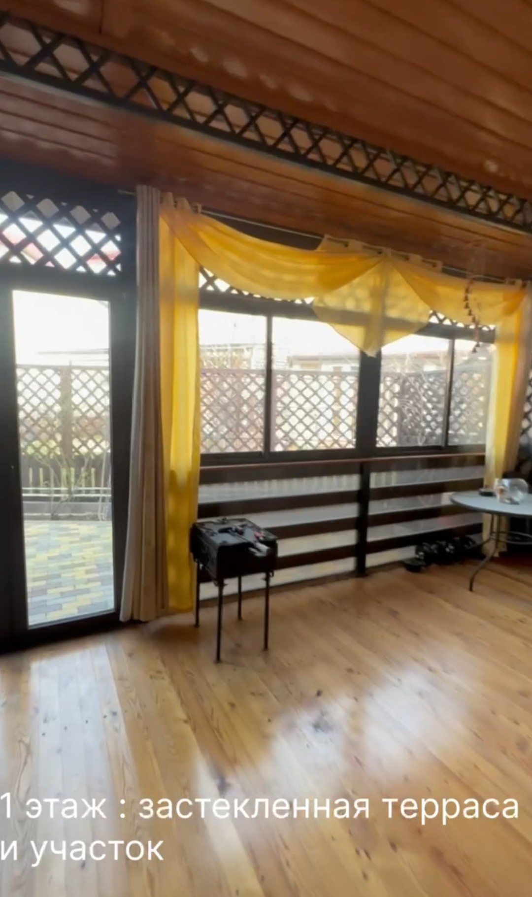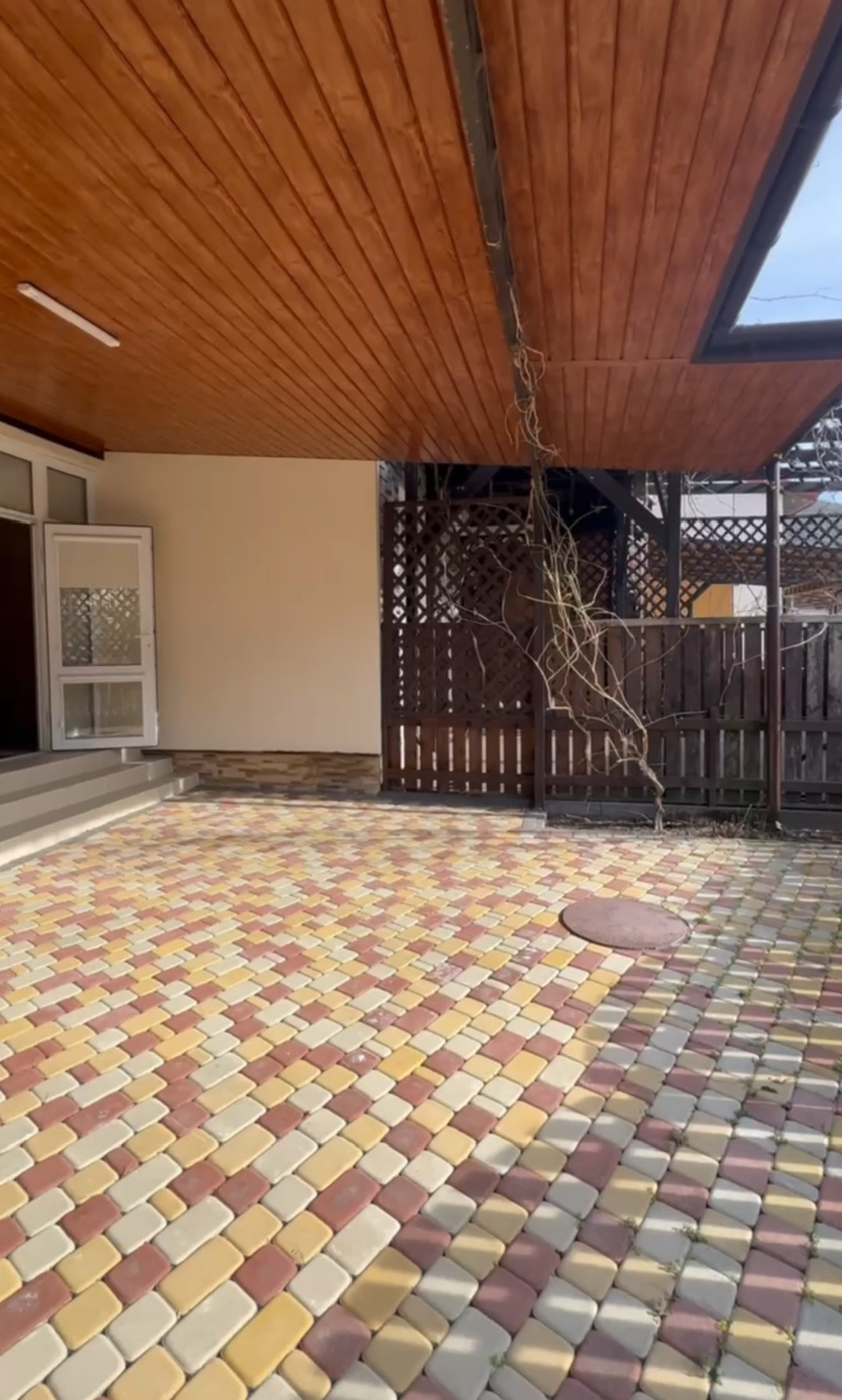 Большая застекленная терраса примыкает к зоне барбекю. Мангальная зона выложена плиткой. Широкое парковочное место на 1 машину , защищенное от солнечных лучей навесом.
