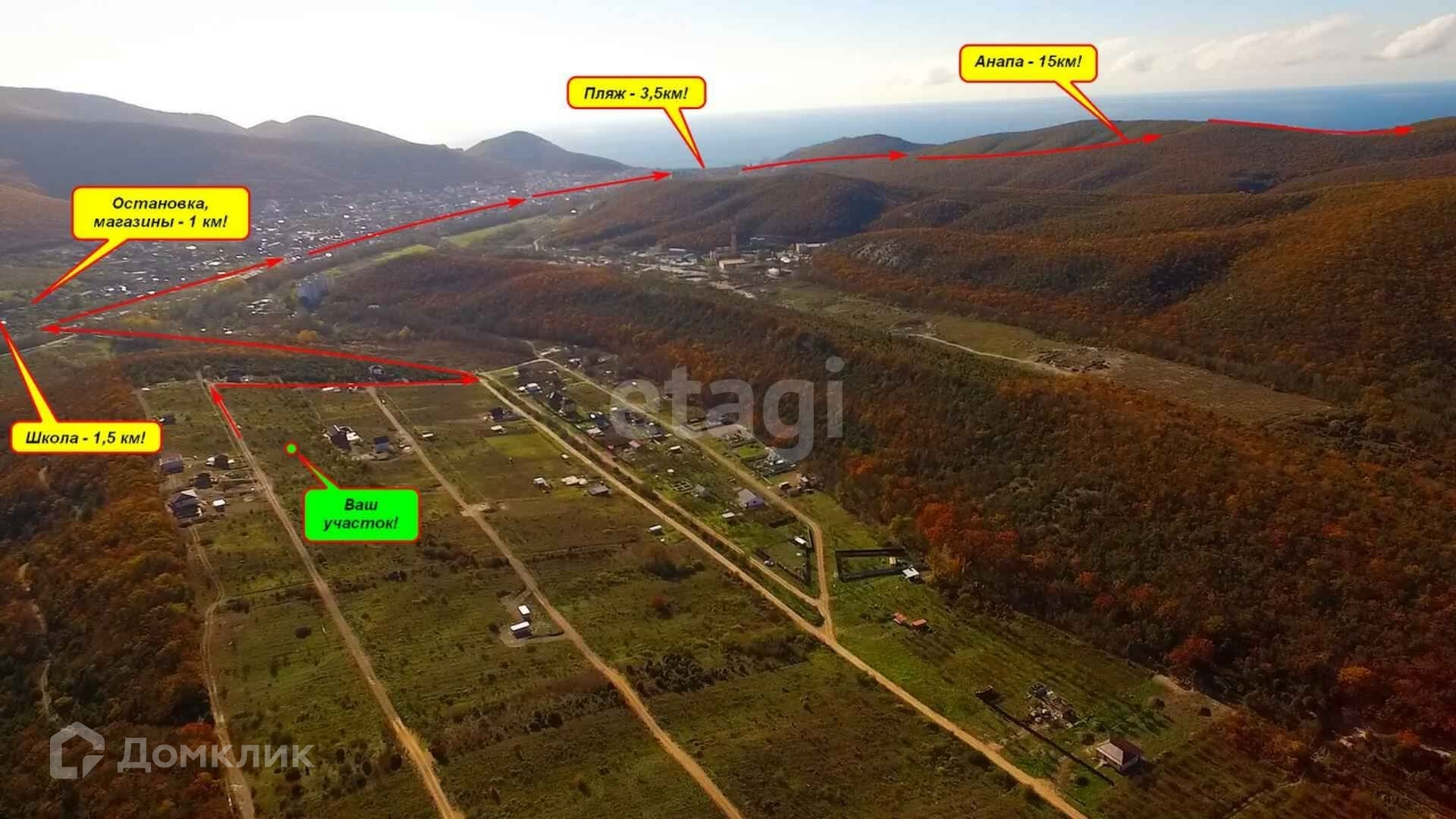 Благодаря удачному географическому расположению участок идеально подходит, как для круглогодичного, так и для сезонного проживания, в стороне от городской суеты. Участок расположен среди реликтовых можжевеловых лесов, в 3,5 км. от моря. В посёлке развитая инфраструктура: магазины, школа, детский сад в радиусе 5-15 минут. Регулярное автобусное сообщение с городом, маршрутное такси ходит с интервалом 15 минут, до остановки и магазина 900 метров.