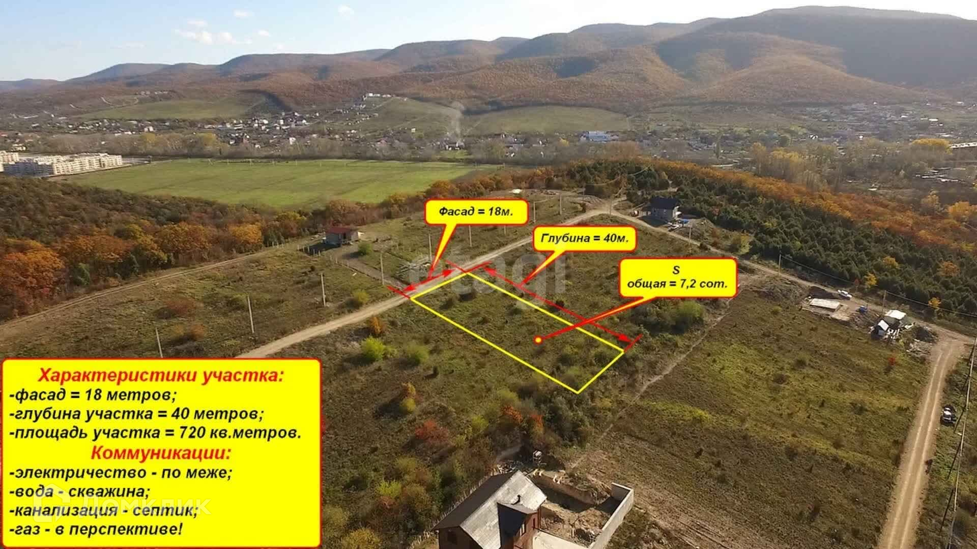 Фасад участка - 18 м., глубина - 40 м., общая площадь - 7,2 сот. К участку проложена хорошая дорога из твёрдых пород щебня, до асфальта - 700 м.
