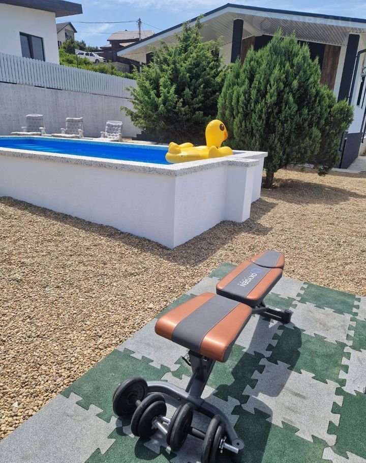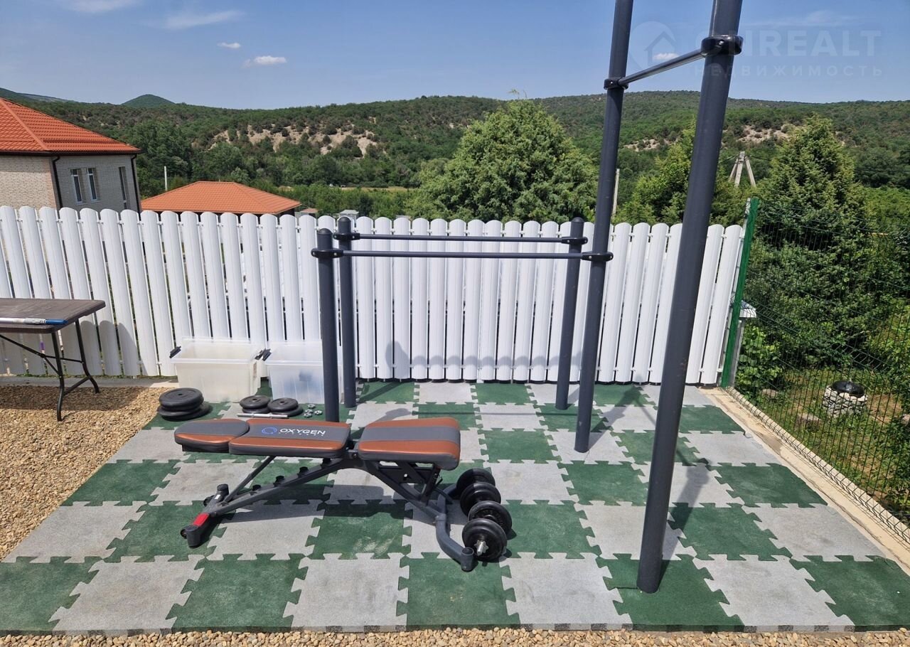 Спортивная зона: комплекс турников, грифы, блины для гантелей, упоры для отжиманий, скамья атлетическая
