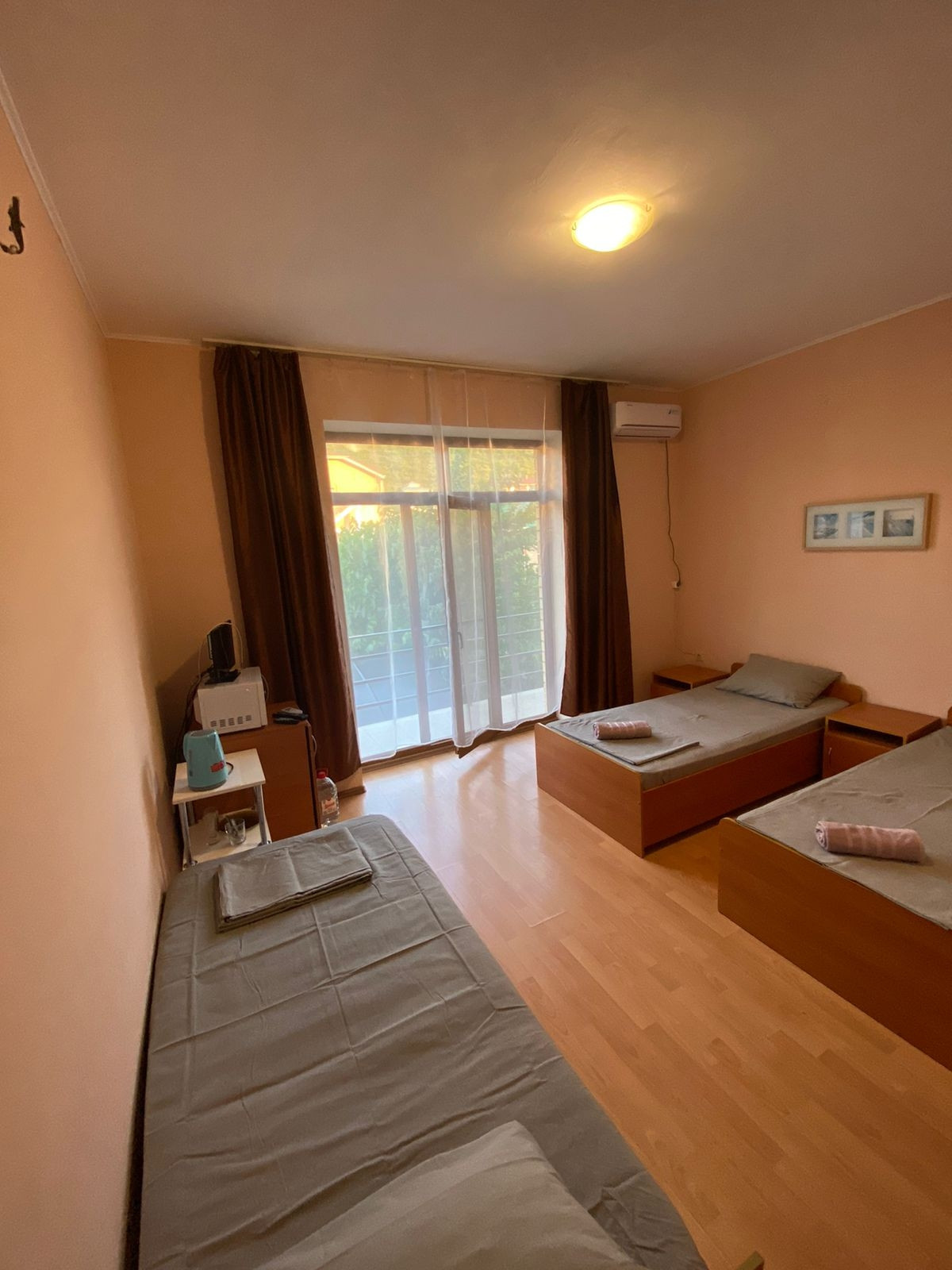Современная СВЧ., компактный холодильник, бойлер, телевизор , кондиционер,столовые приборы.
