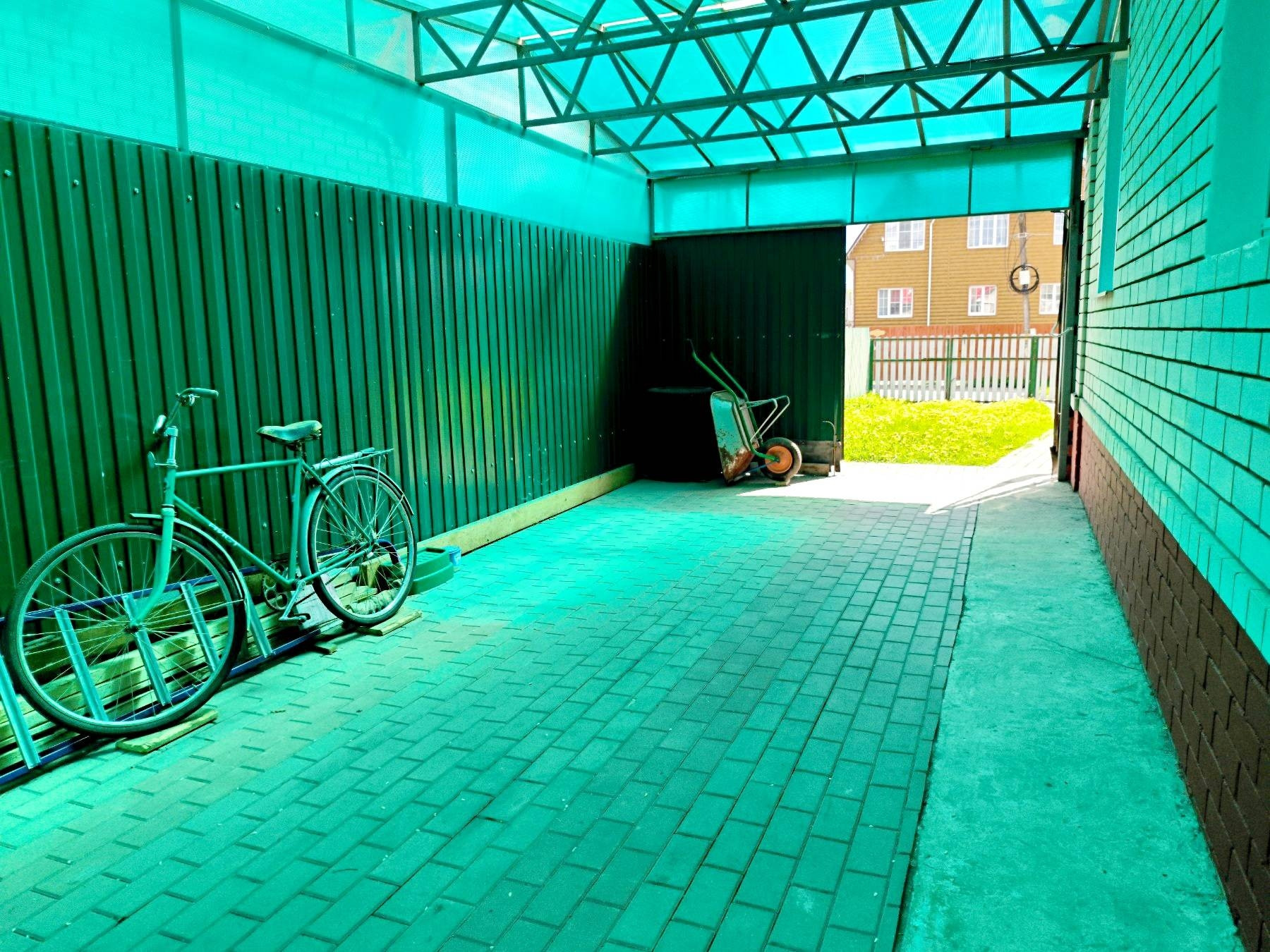 Возле дома есть благоустроенный навес для машин, кладовая для садового инвентаря.