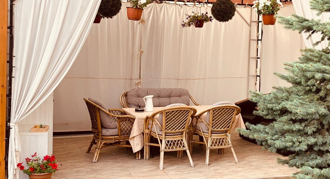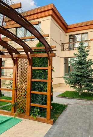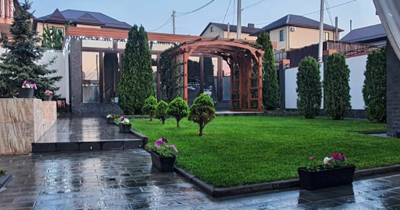 Двор благоустроен - есть мангальная зона, зона отдыха; построен и обустроен гостевой домик (c кухней) и большой гараж.