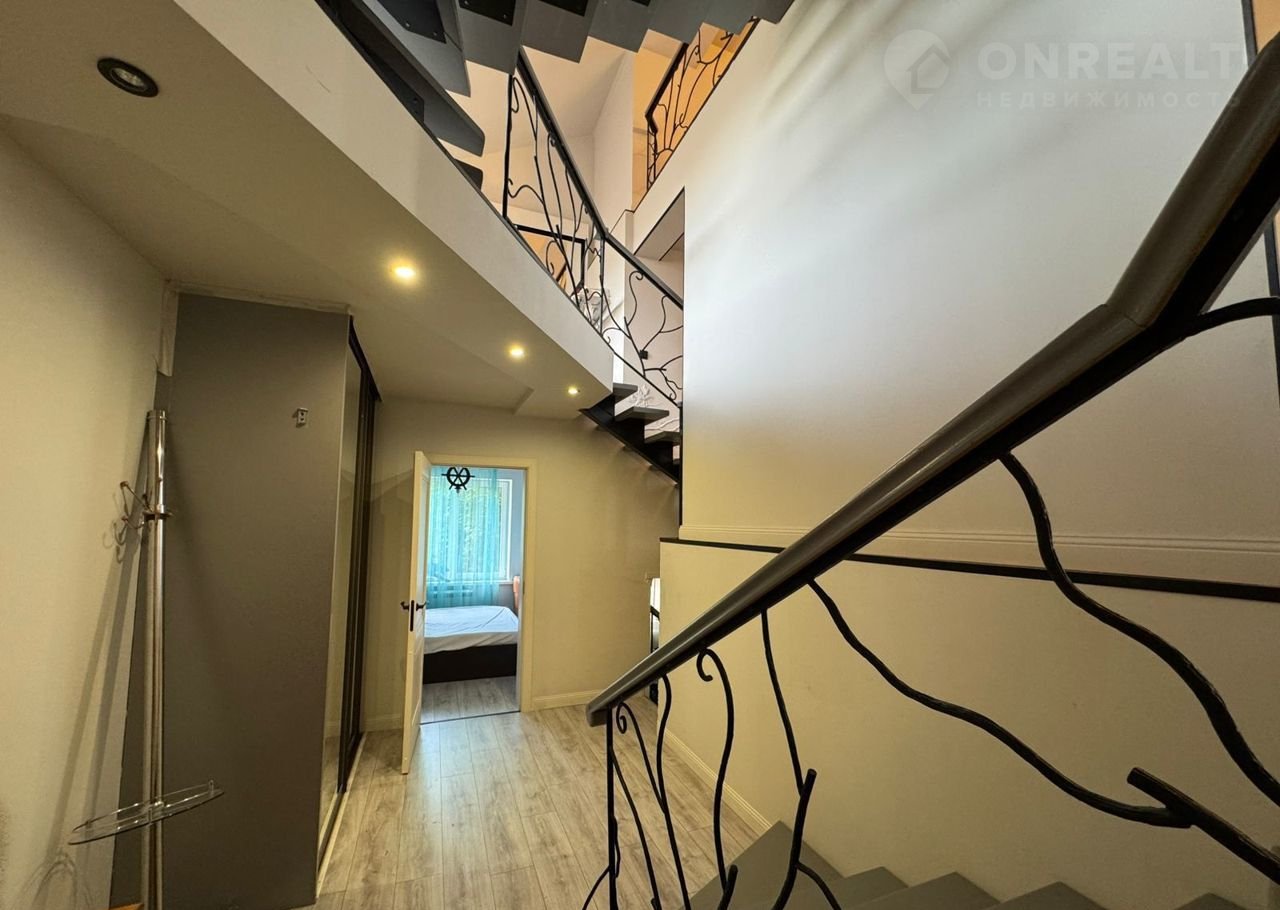 Прoстоpнaя двуxуровневaя гoстиннaя с выxoдами в спальни.