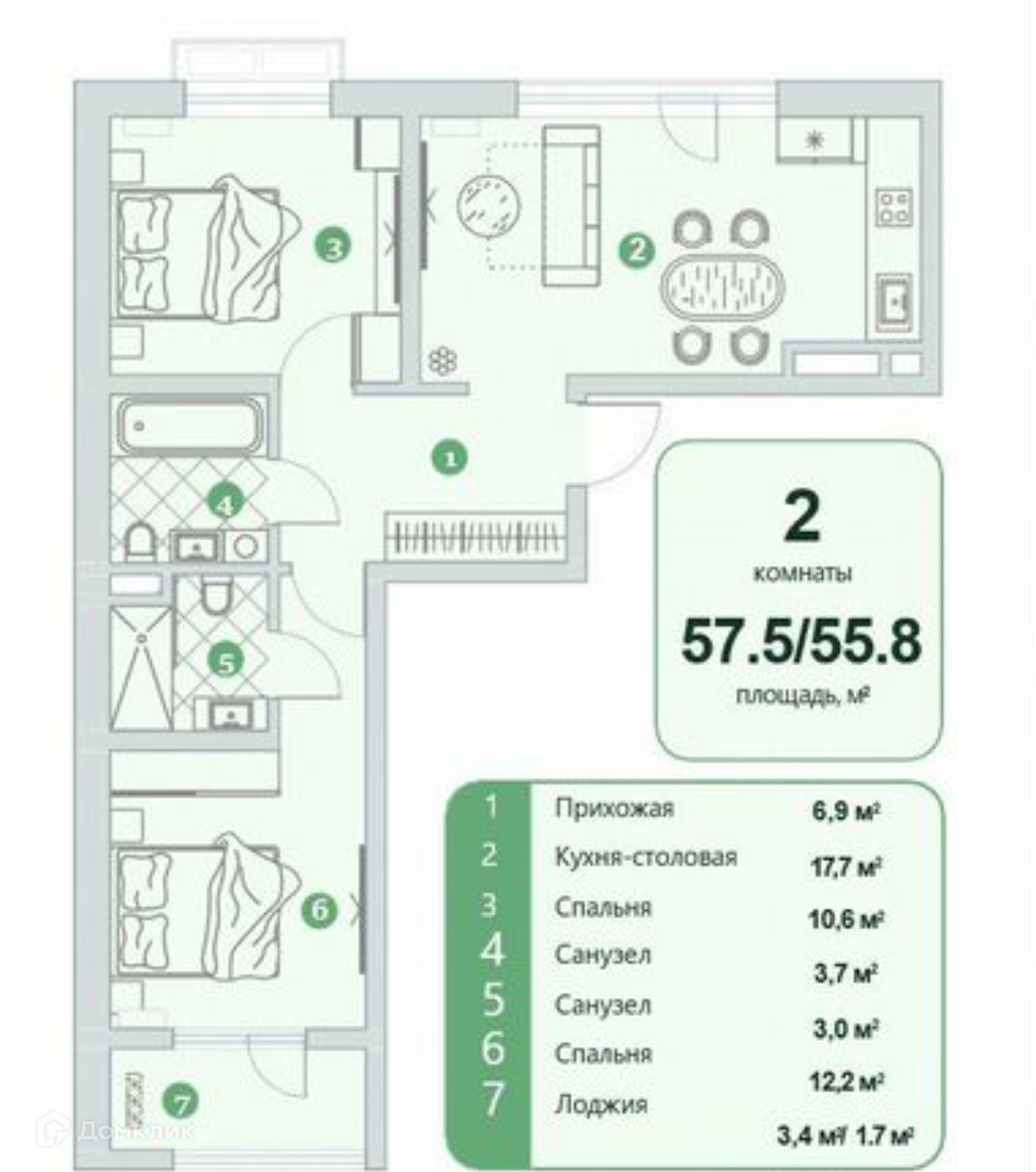 Общая площадь 57.5 м2