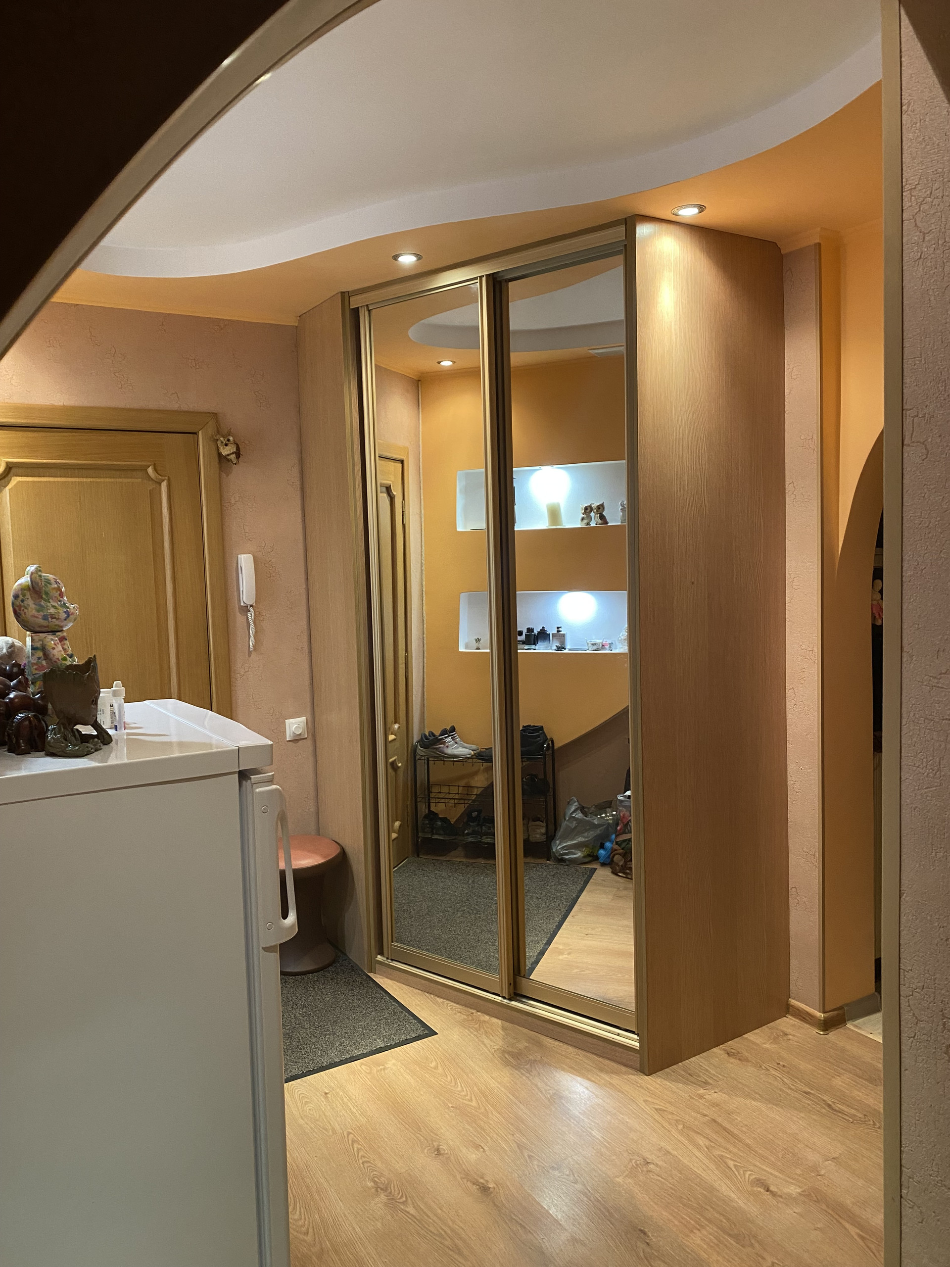 Ламинат во всех комнатах. Межкомнатные двери (Штыковские). Пластиковые окна. Железная дверь. Стены и потолки выровнены, поклеены обои. В двух прихожих и кухне подвесные потолки, освещение - софиты, в большой прихожей есть инсталляции из гипсокартона с софитами. Ванна и туалет раздельные, стены и пол - кафель, потолок - пластиковые панели, освещение - софиты. В одной из комнат имеется спортивная зона площадью 7,5 кв.м., в которой есть все, что необходимо для занятия спортом (два грифа - прямой и изогнутый, блины на 150 кг., эллипсоид, силовая рама, включая блочный тренажер, турник, брусья, две скамейки, скамья для гиперэкстензии, два комплекта гантелей, набор резинок, различные рукояти для тяг, инверсионный стол, расширители хвата и т.д.) - свой мини тренажерный зал.