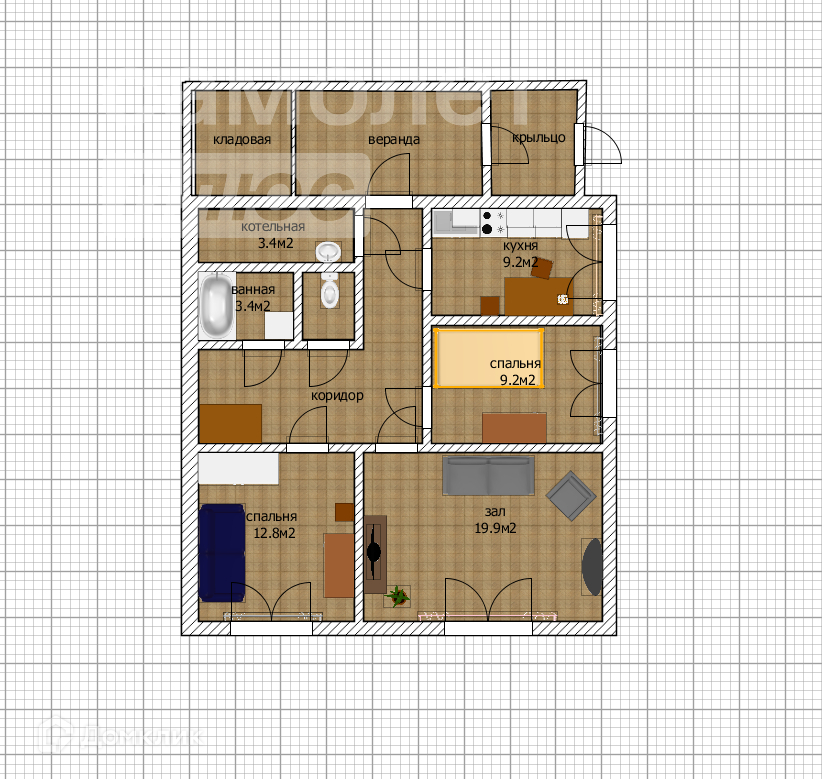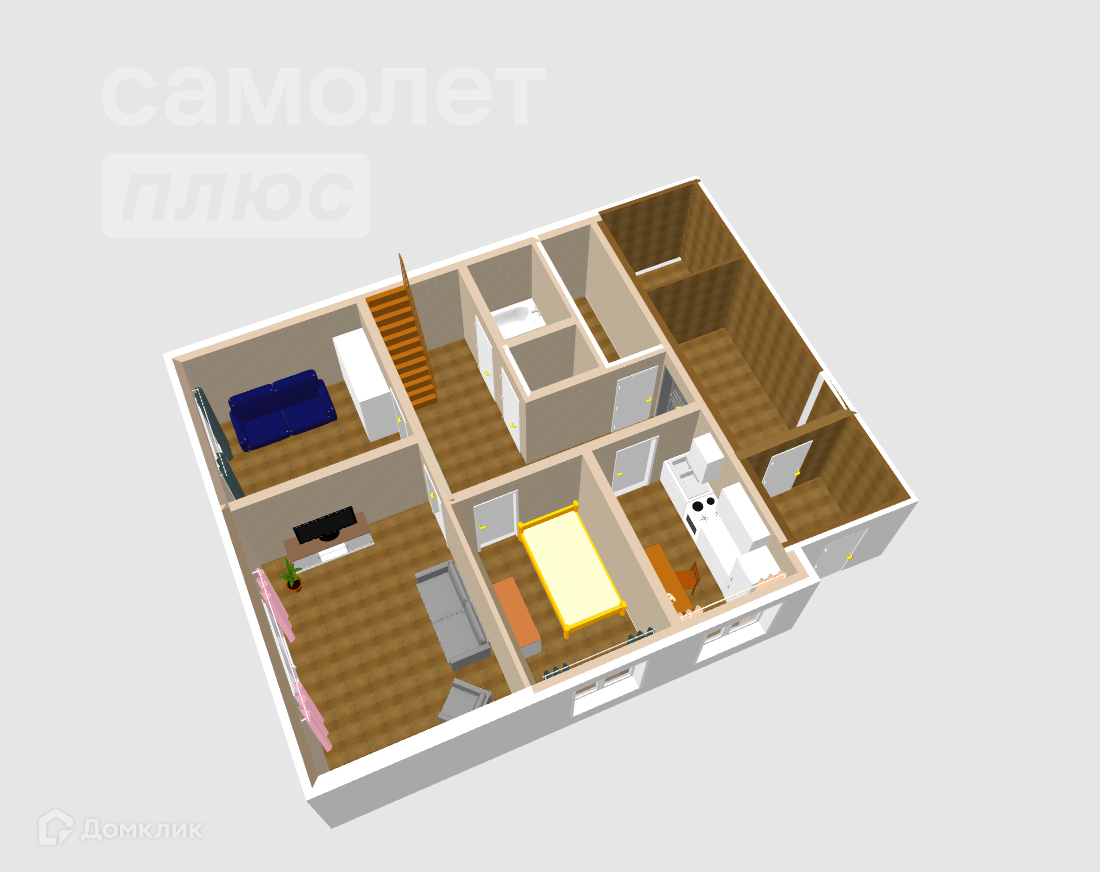 Состоит из трех изолированных комнат, просторной кухни, раздельного санузла и ванны, котельная.