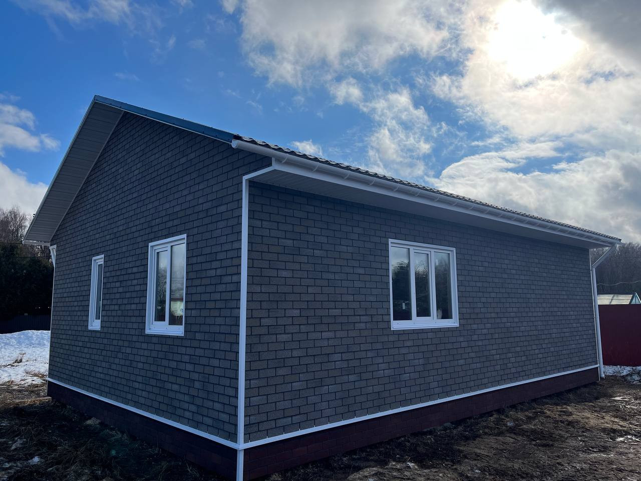 Кровля покрыта металлочерепицей, фасад отделан плиткой Технониколь Хауберк. Установлены ПВХ окна и двери с двухкамерными стеклопакетами. Внутри отделка стен имитацией бруса, на полу фанера. Потолки натяжные.