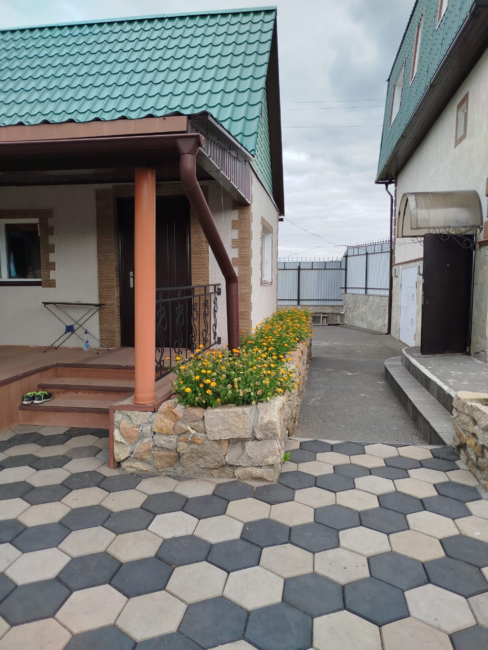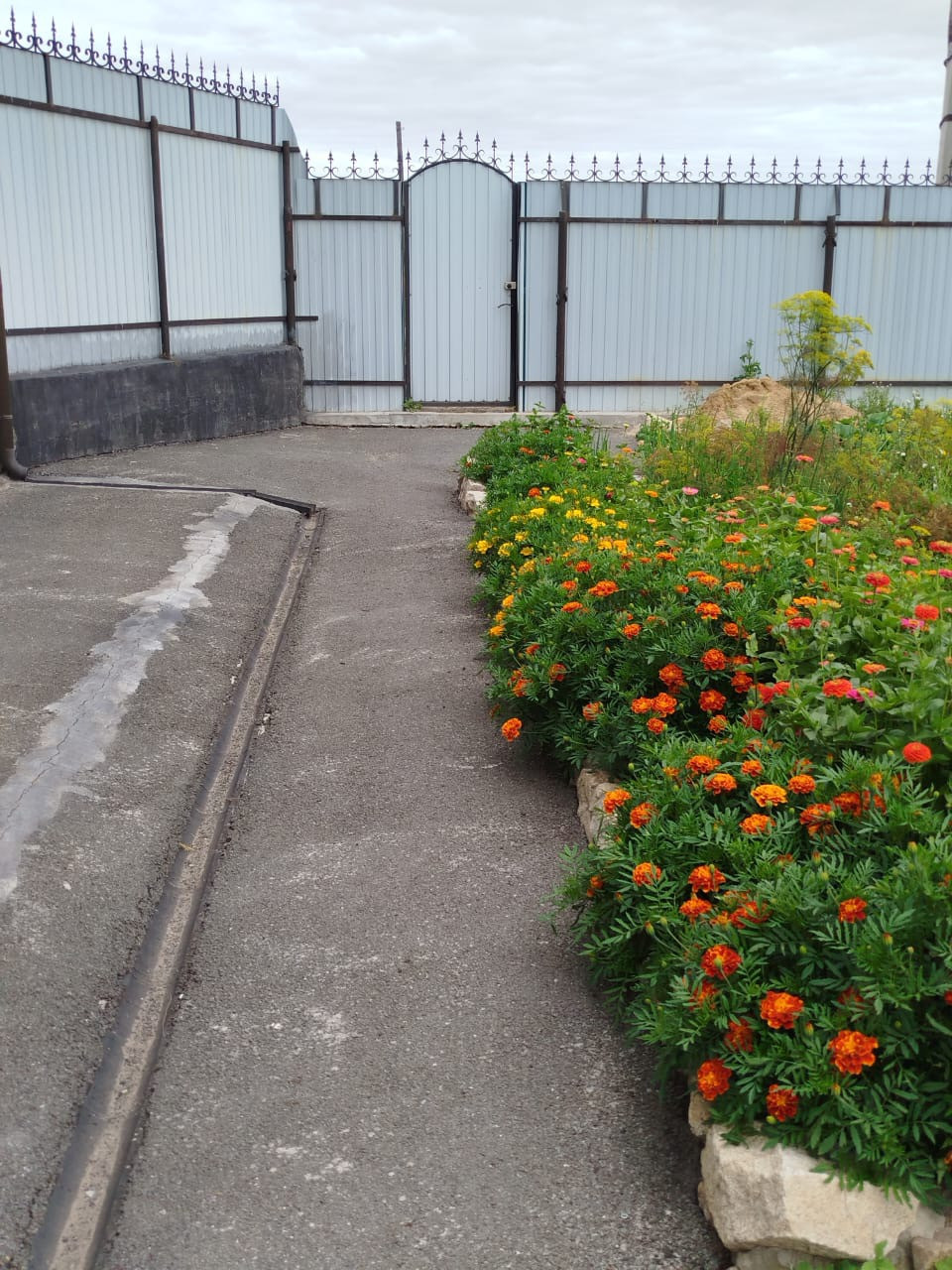 Вся территория огорожена забором из профлиста, ворота и калитка со стороны улицы с кованными элементами. Подъезд выложен бетонными плитами.
