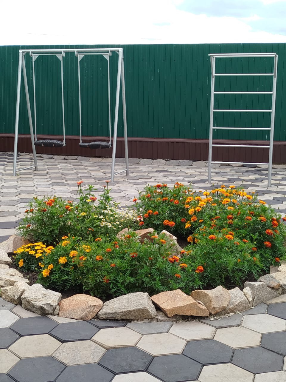 Во внутреннем дворе много декоративных элементов с цветами, установлены качели и турники. Зона отдыха выложена мягкой тротуарной плиткой.