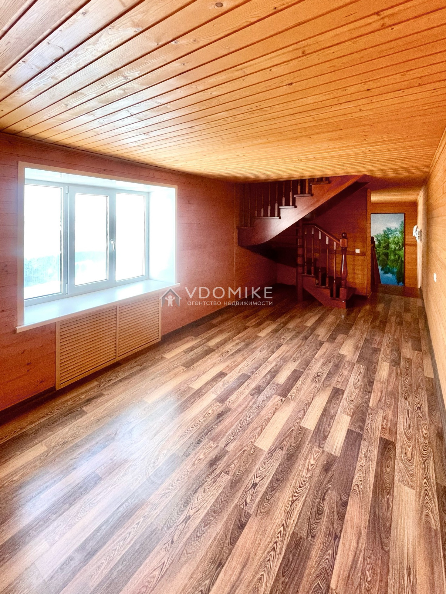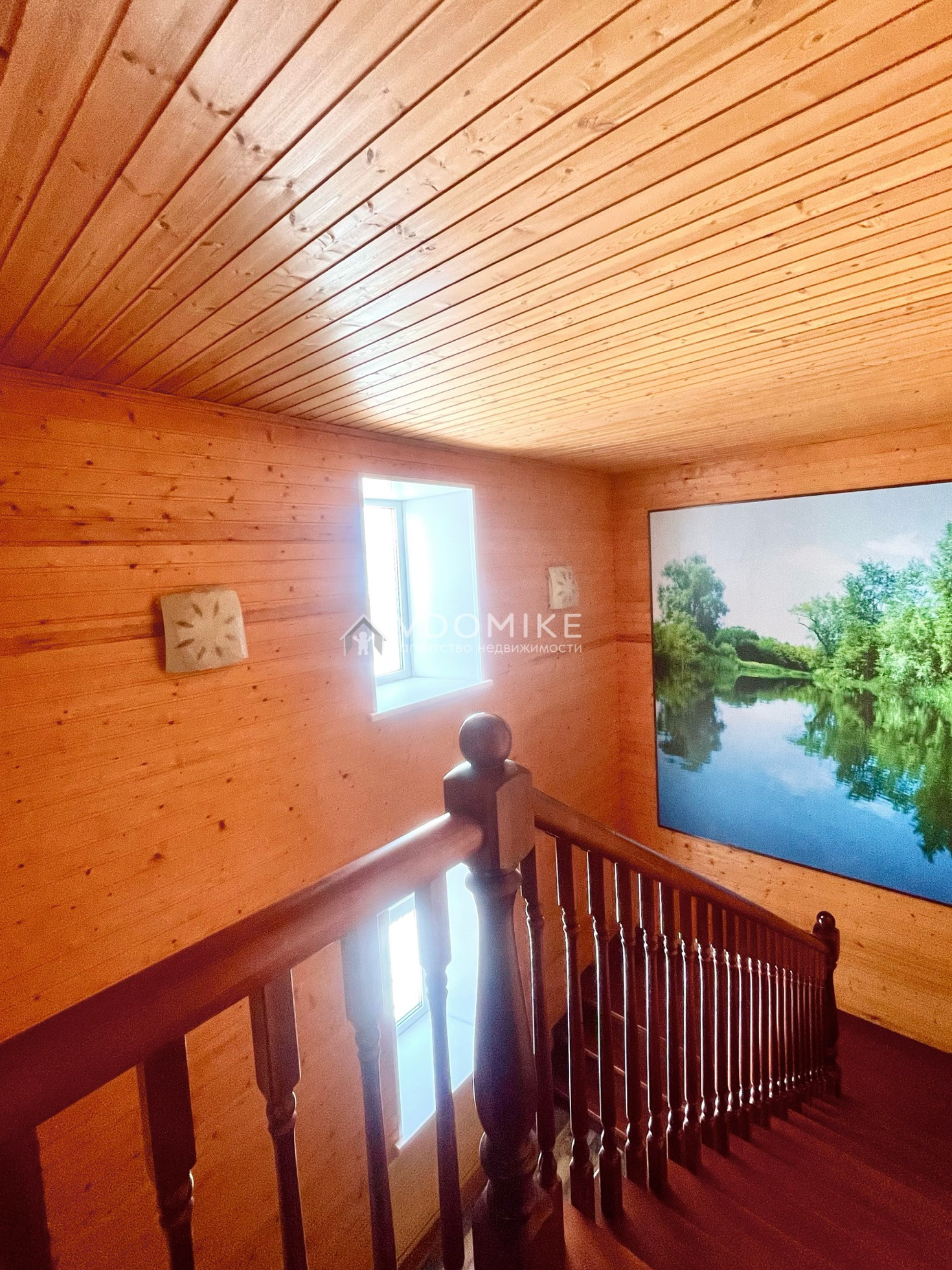 Лестница в доме деревянная, лакированная, стены на 1 и 2 этажах из дерева лиственницы, жилая часть дома сделана из эколлгичных материалов, от магазина сделано несколько слоёв шумоизоляции.