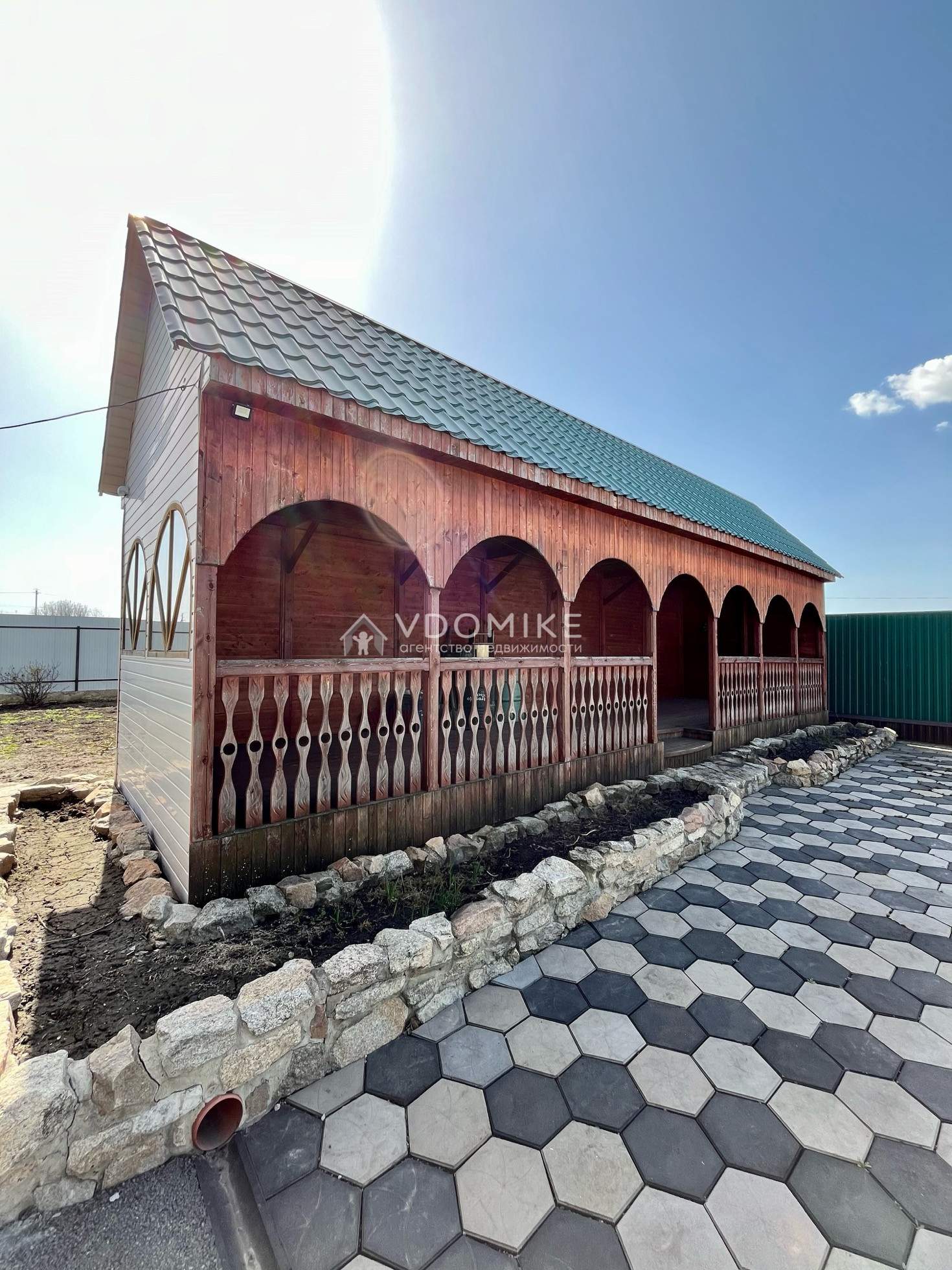 Дом и банный комплекс выполнены в одном стиле. Фасад дома и бани оформлен штукатуркой короед, углы украшены декоративными элементами. Крыша бани, беседки и дома обшита профлистом в цвет забора, установлен водосток.