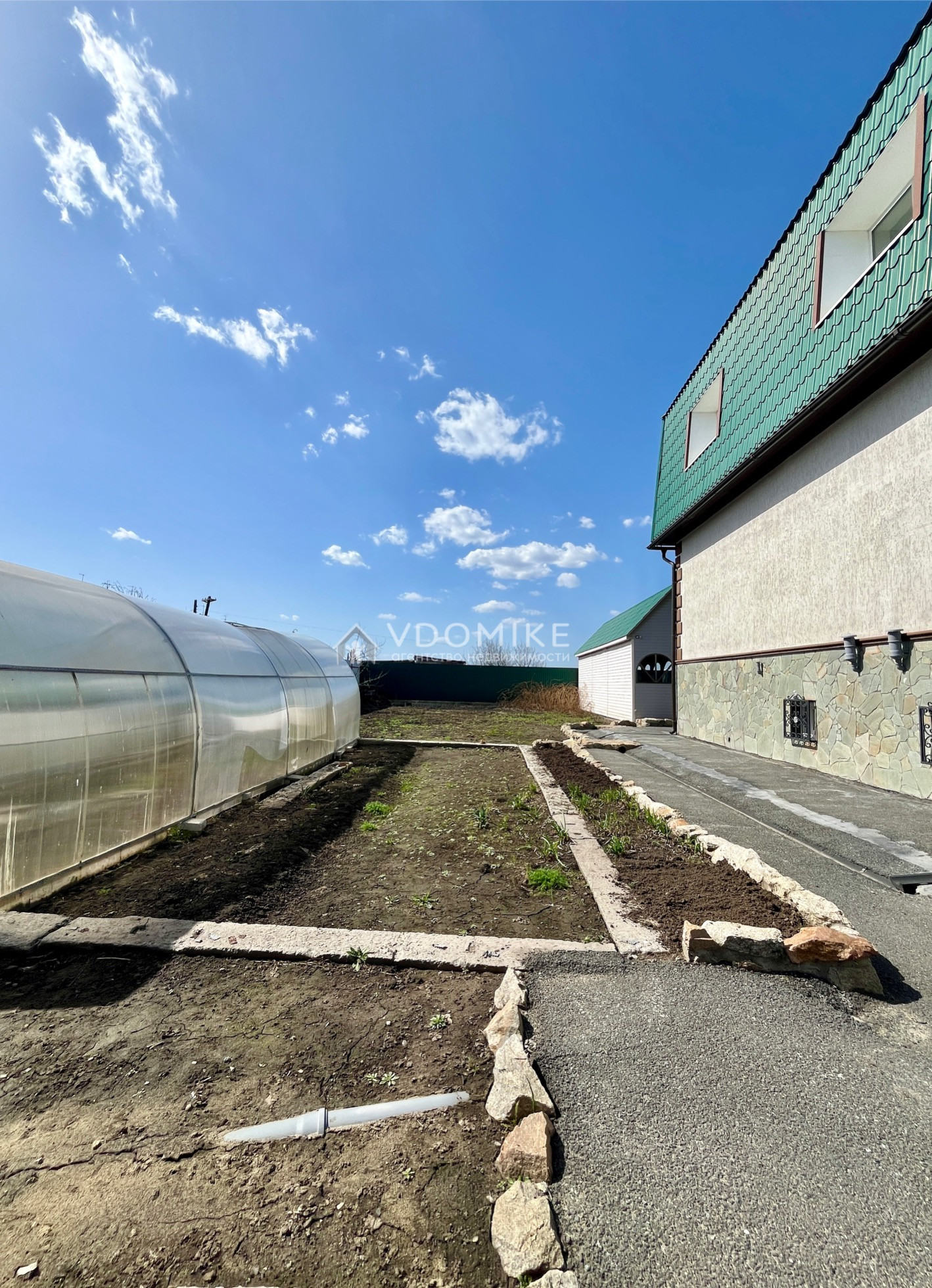 На территории есть банный комплекс с бассейном, большая беседка, огород с теплицей и посадки: яблони, малина, смородина.
