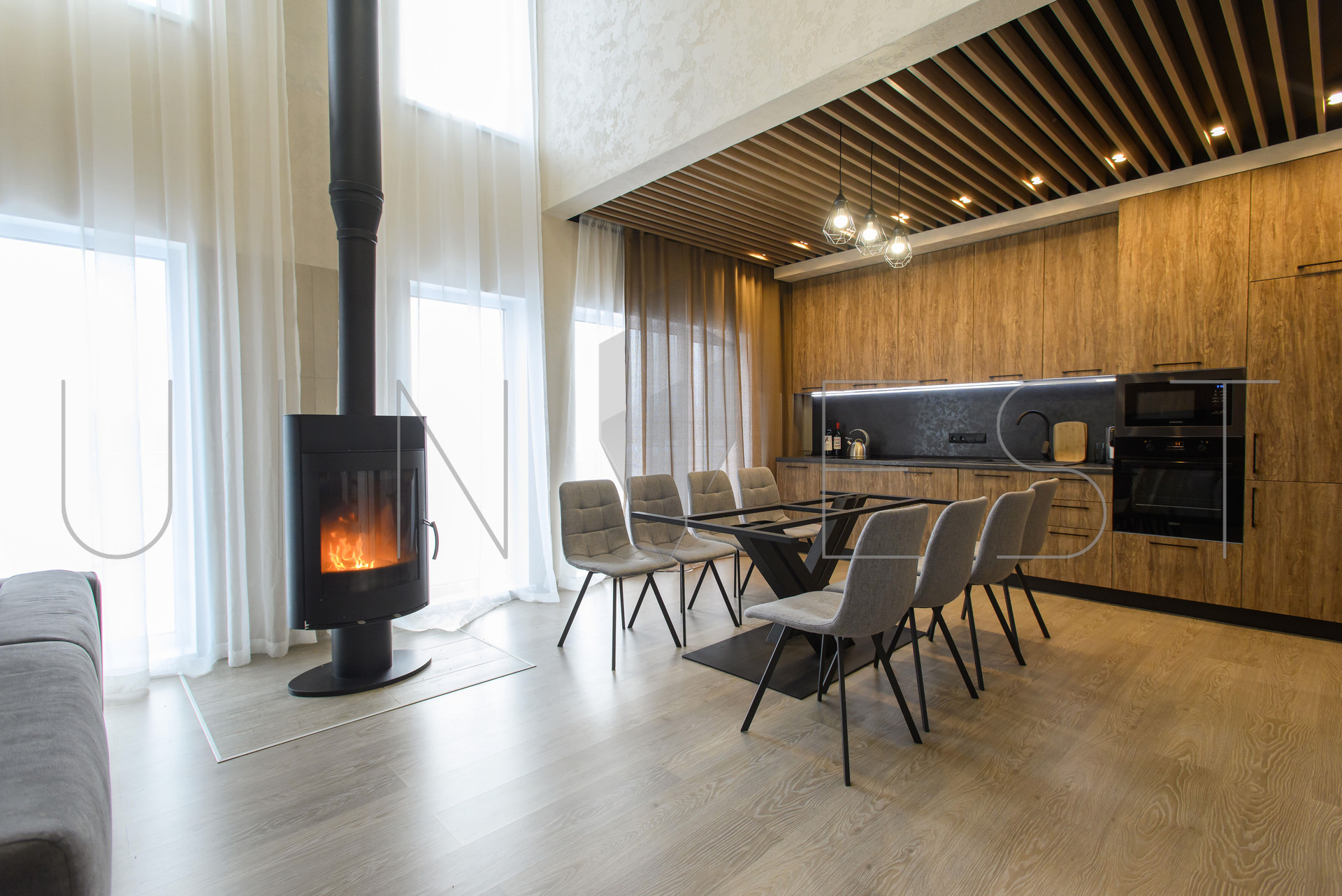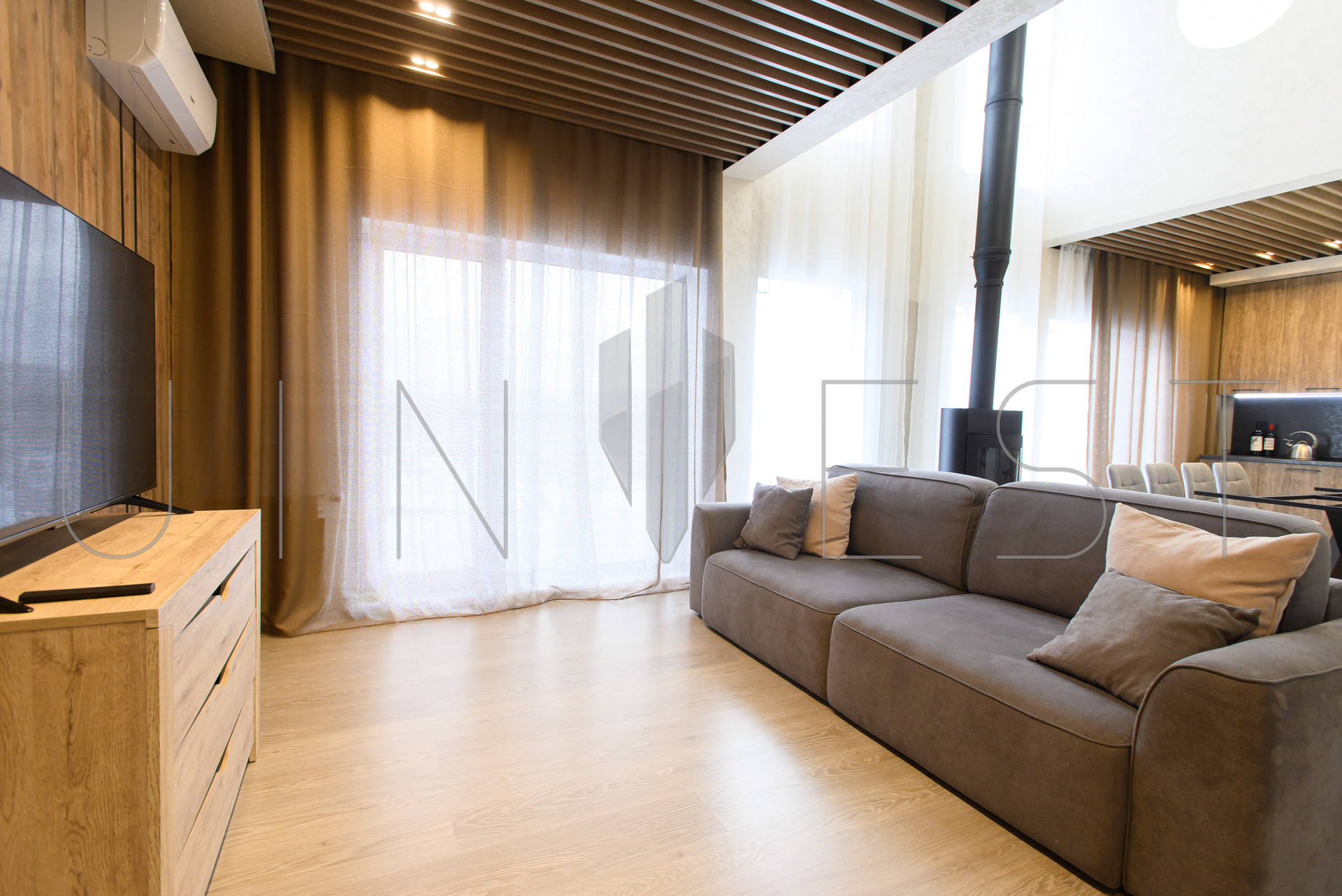 Дом полностью укомплектован всей необходимой новой мебелью и техникой: камин с безопасной ненагревающейся задней стенкой, газовый двухконтурный котел (на горячую воду и тепло) - управляется с телефона, второй запасной электрокотел, стабилизатор напряжения, водонагреватель, электрические полотенцесушители, стиральная и сушильная машина Haier, холодильник Indesit, варочная поверхность Zanussi, вытяжка Moncher, 2 японских кондиционера Tosot, 2 телевизора - LG и Xiaomi. Остается всё: вариант "под ключ", дом полностью готов для комфортного проживания. План 1 и 2 этажа представлены на планировке в фотографиях.