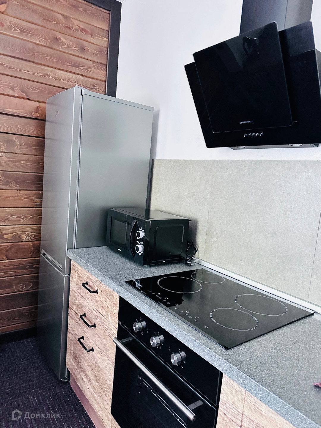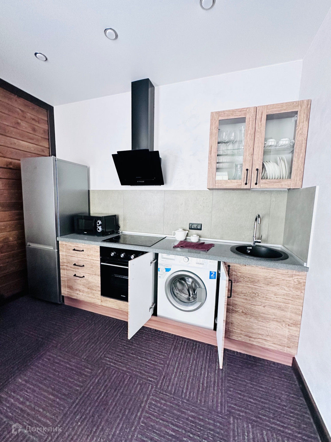 установлена вся бытовая техника: Холодильник, Электрический чайник, Микроволновая печь, Варочная поверхность, Духовой шкаф, Вытяжка, Телевизор, Кондиционер, Утюг, Фен.