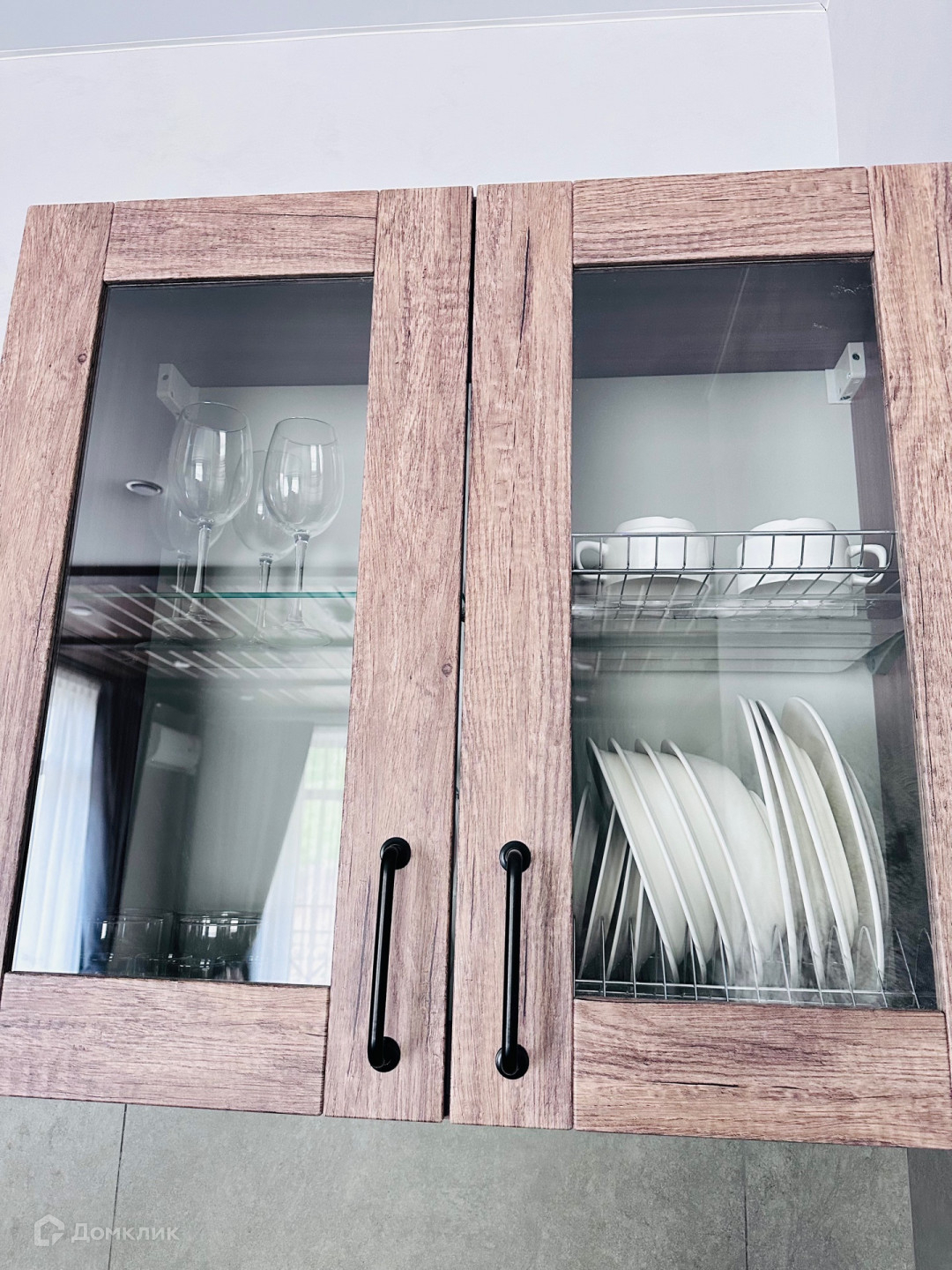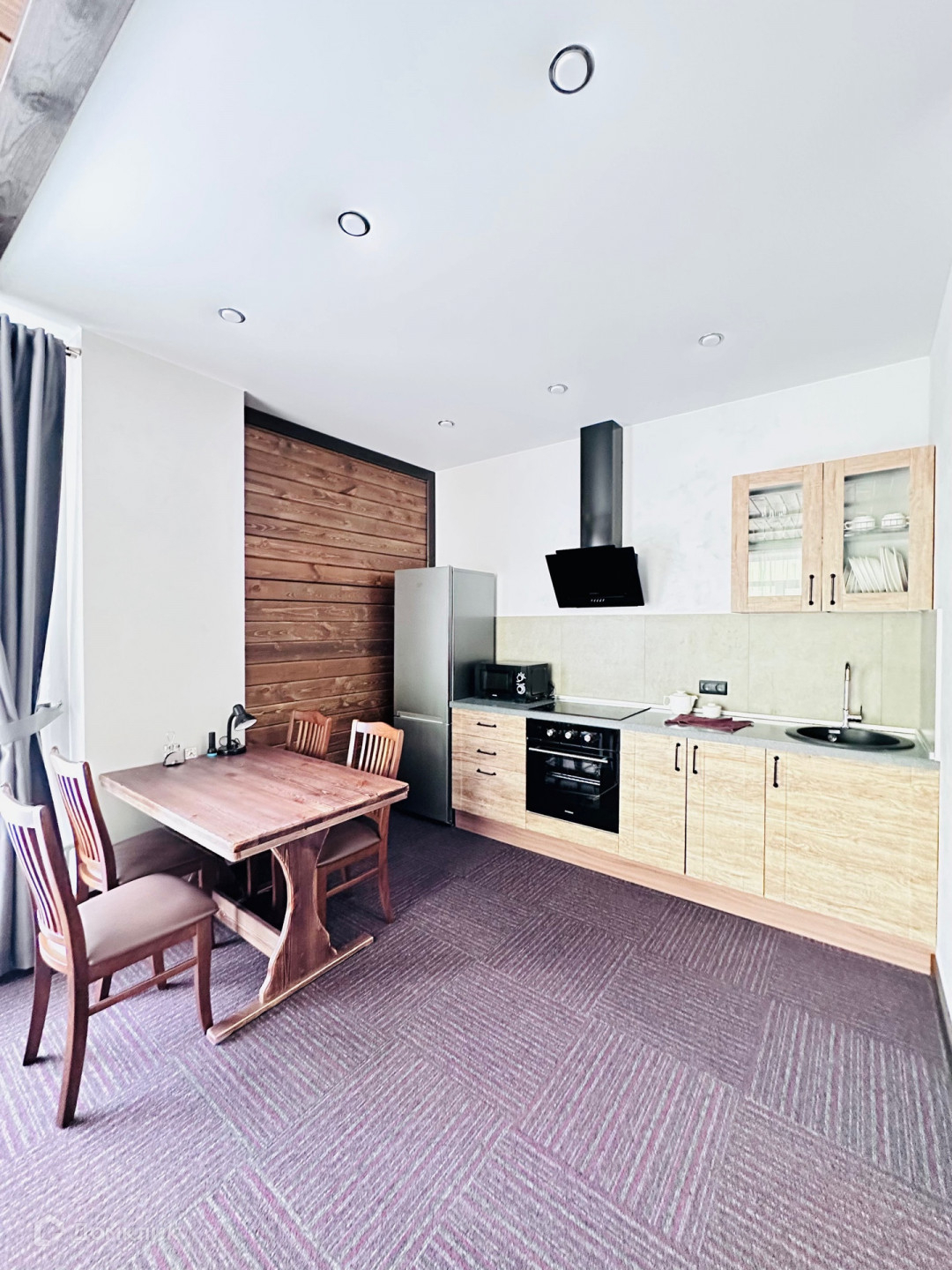 просторная кухня гостинная оборудована кухонным гарнитуром, столовыми приборами, посудой
