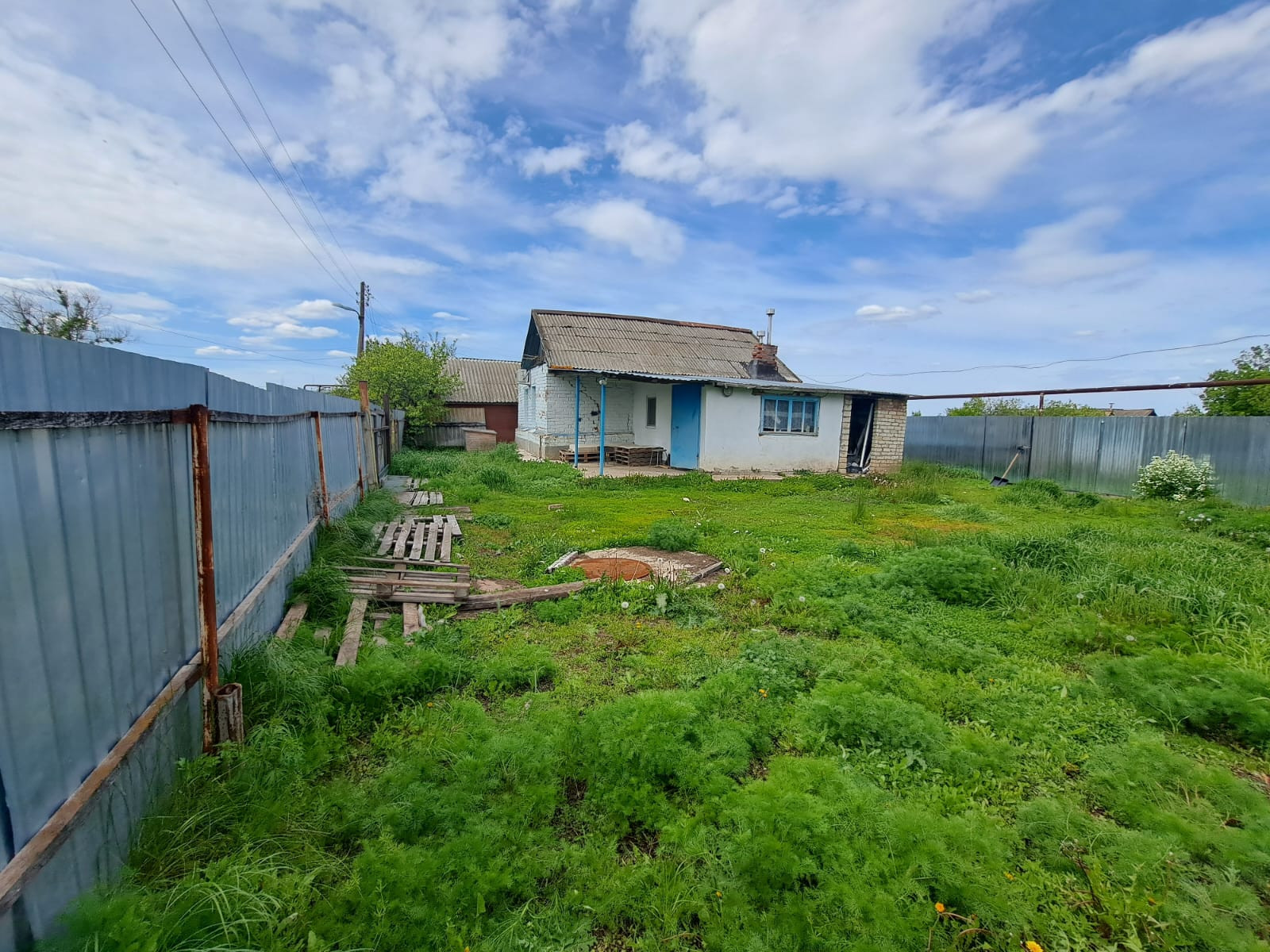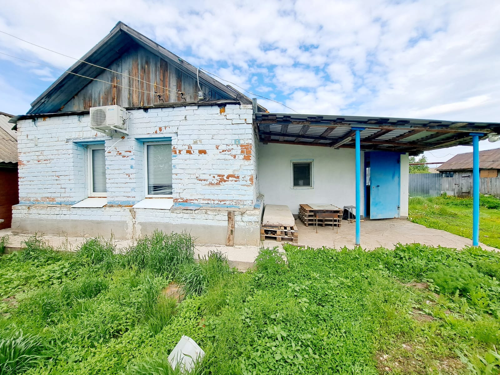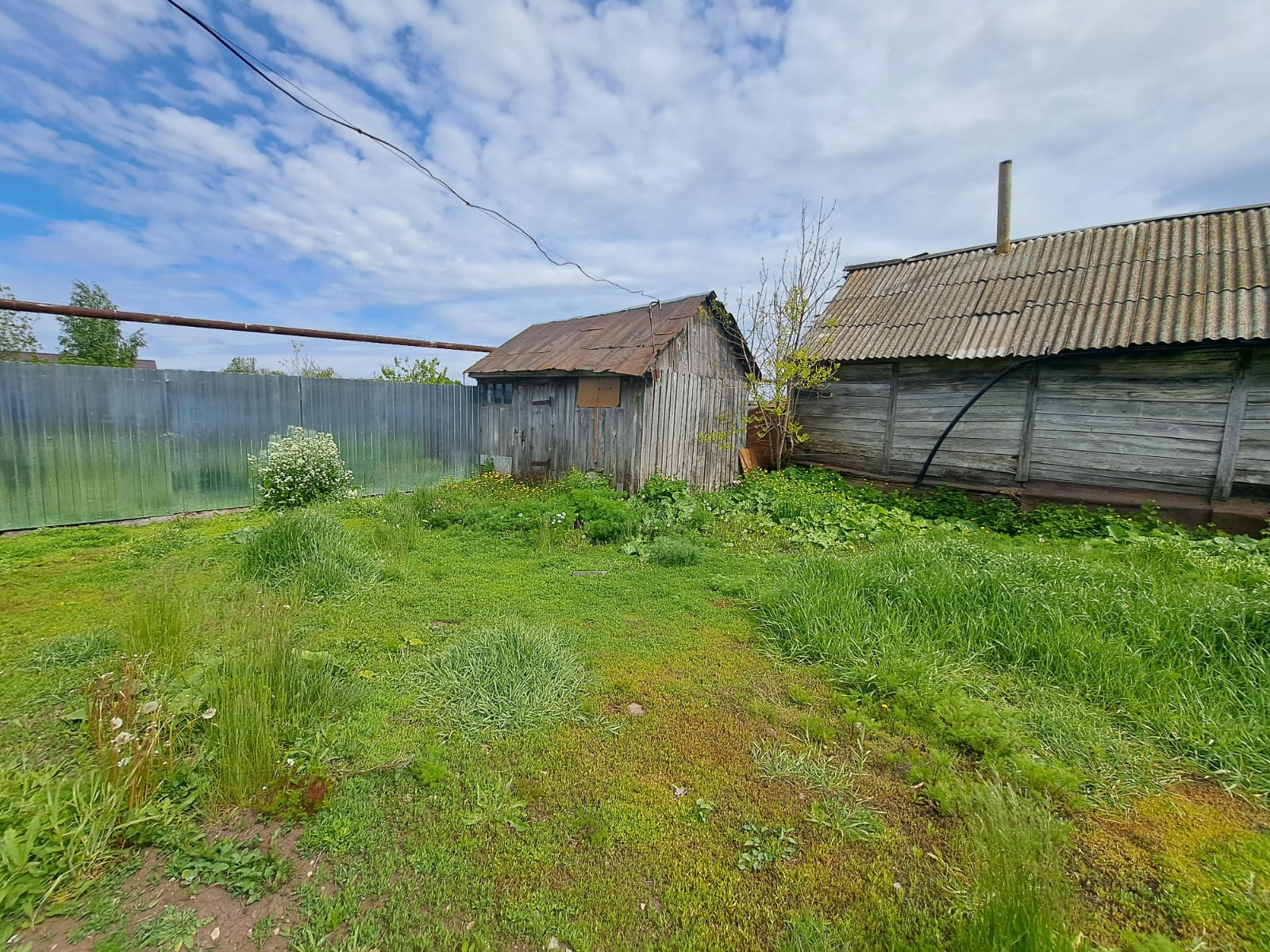 Навес и большая зеленая зона во дворе. Сарай.