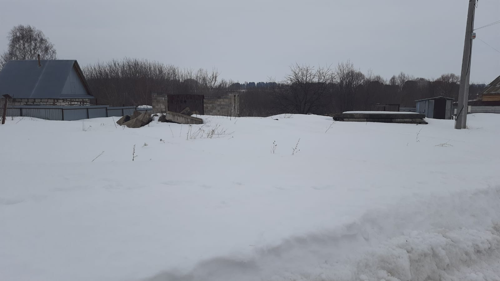 На земельном участке есть фундамент под дом, недостроенный гараж и строительные плиты для перекрытия, все это остается.