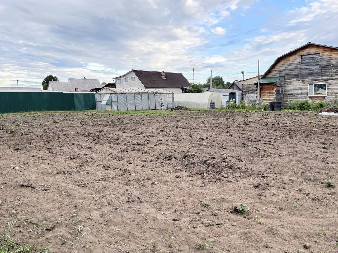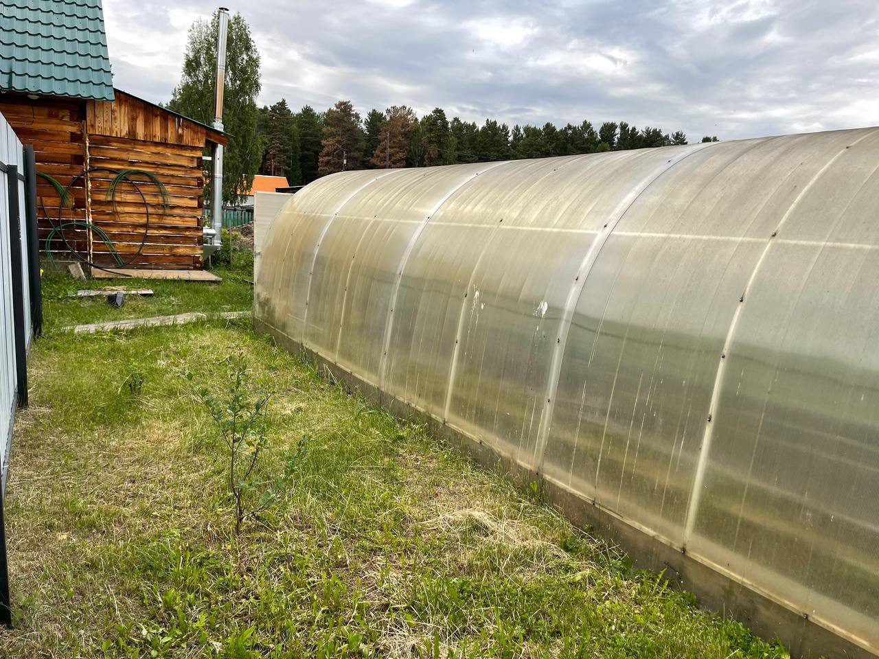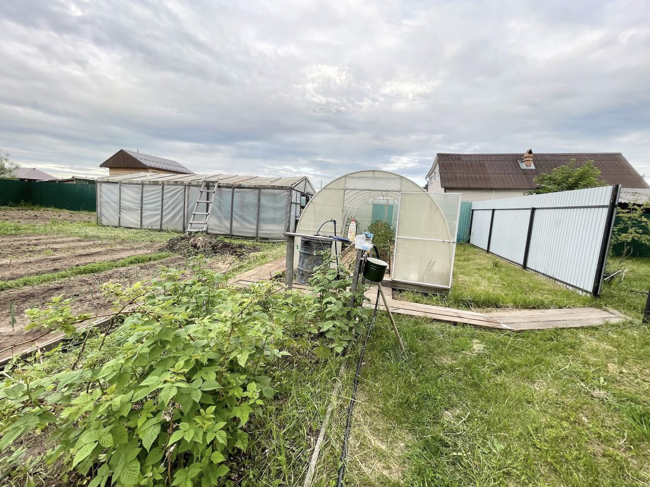 На участке плодово-ягодные кустарники, 2 большие теплицы , грядки.