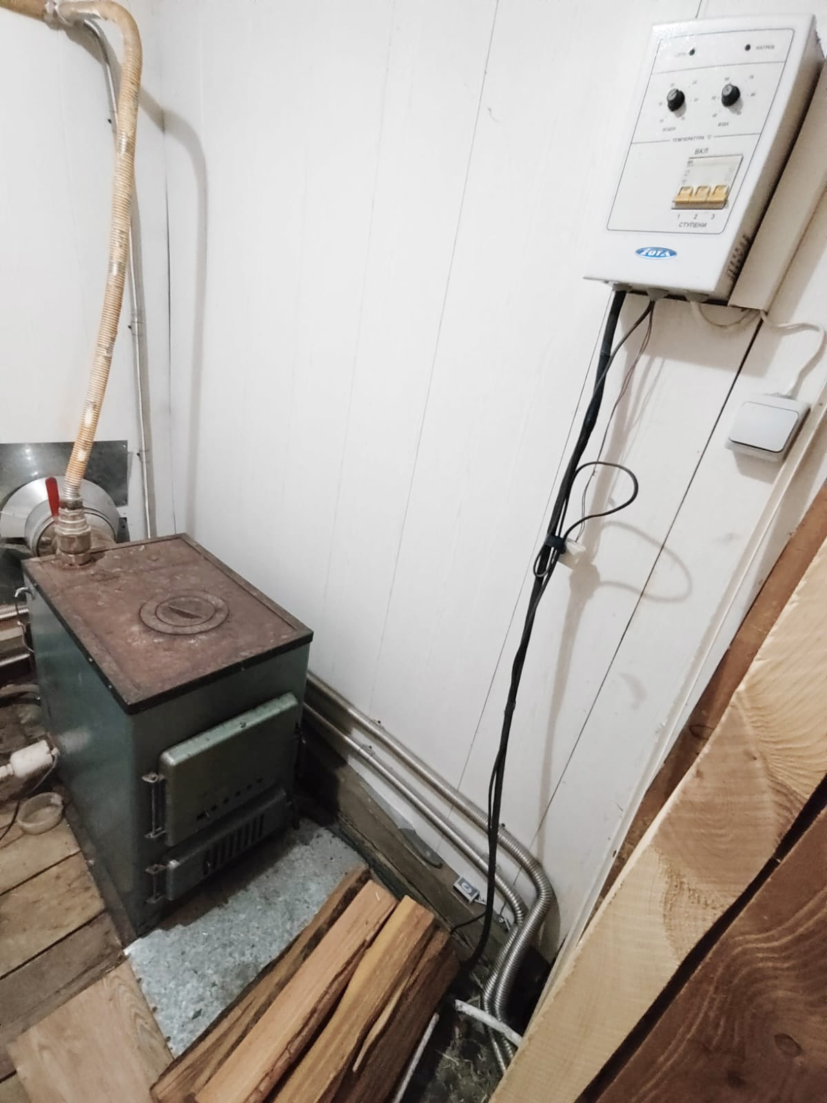 Отапливается дом комбинированным твердотопливным котлом, т.е можно топить дровами, можно подключить от электричества.