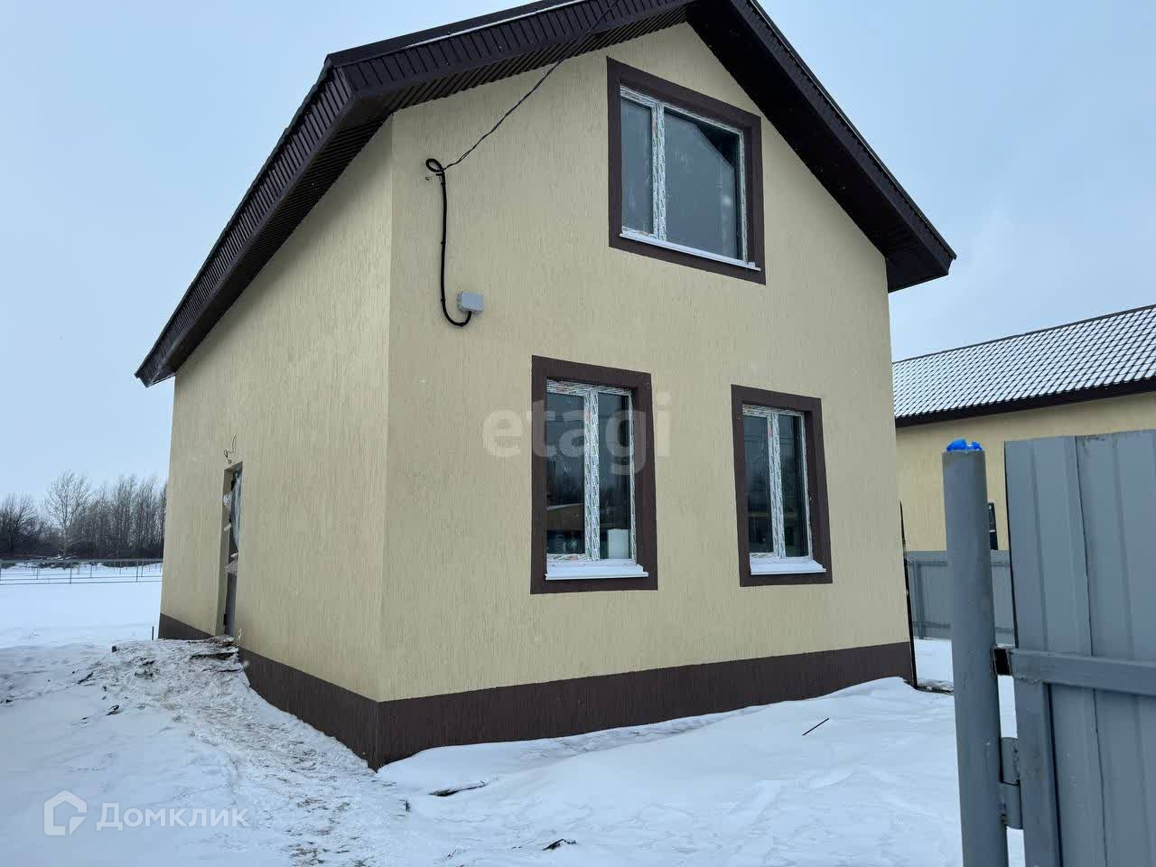 Дом в предчистовой отделке: оштукатуренные стены, лестница, натяжной потолок( белый матовый), газовый котел, унитаз и раковина.