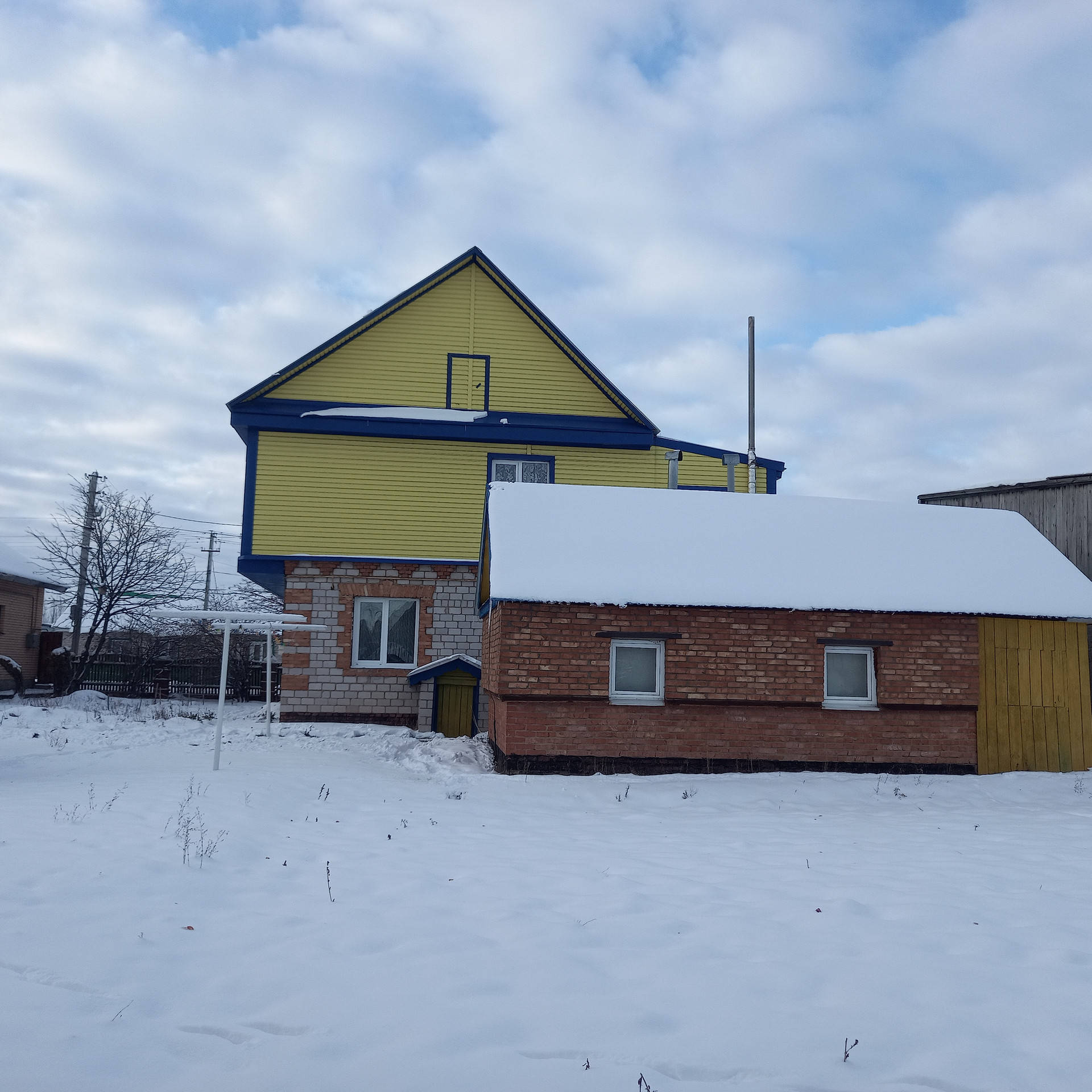 Первый этаж из кирпича, второй этаж из бруса, обшит сайдингом с утеплителем.