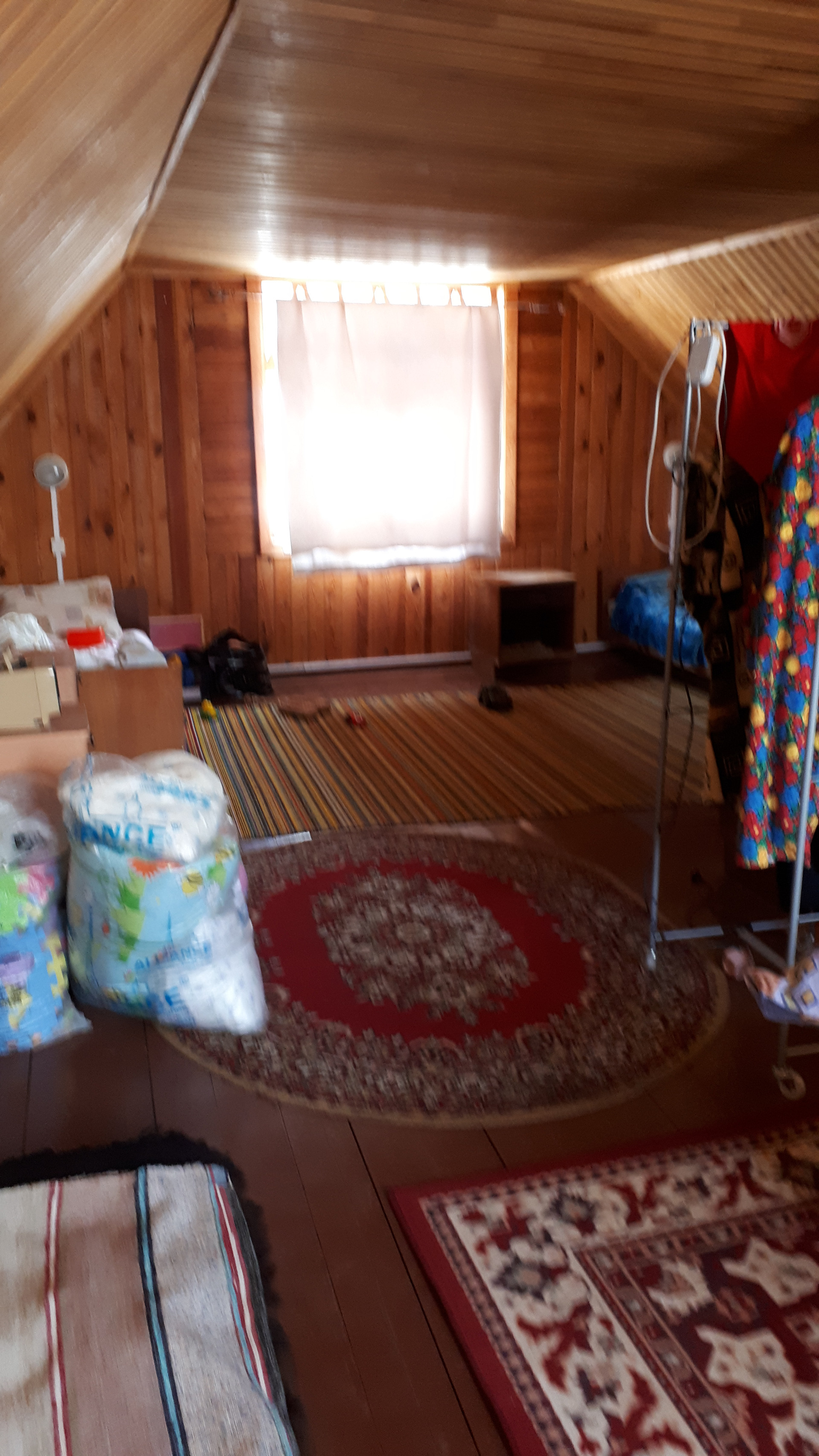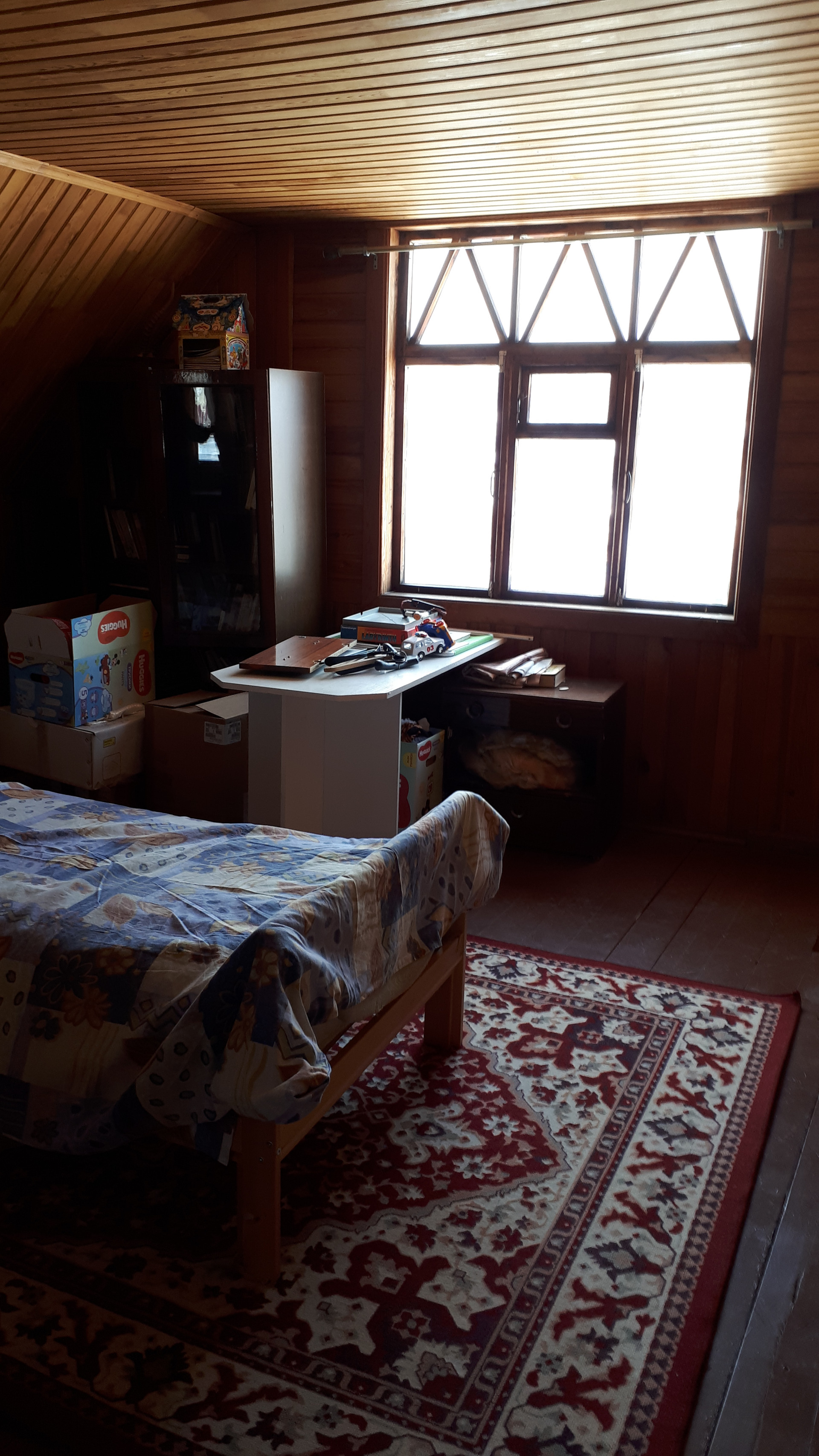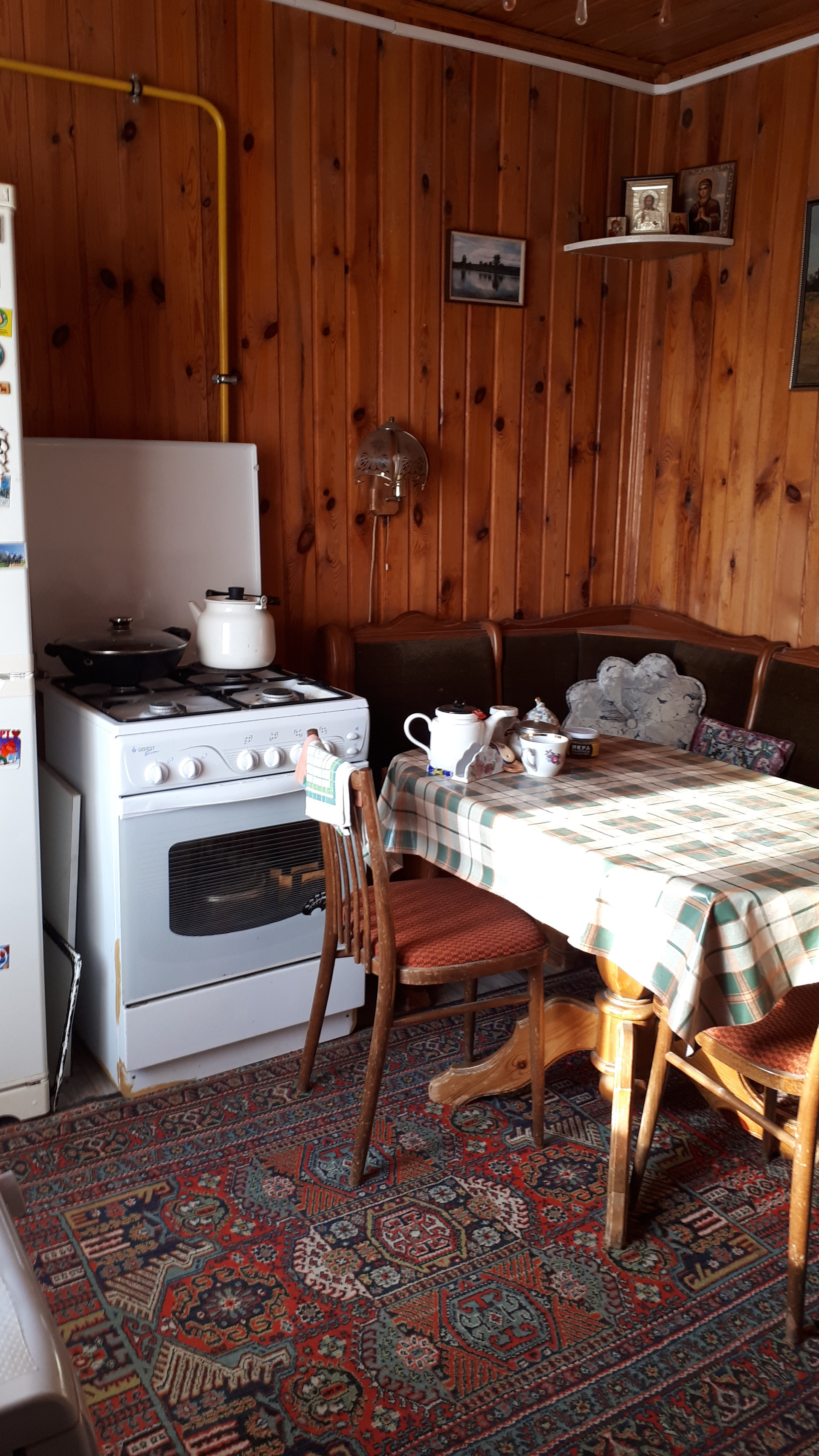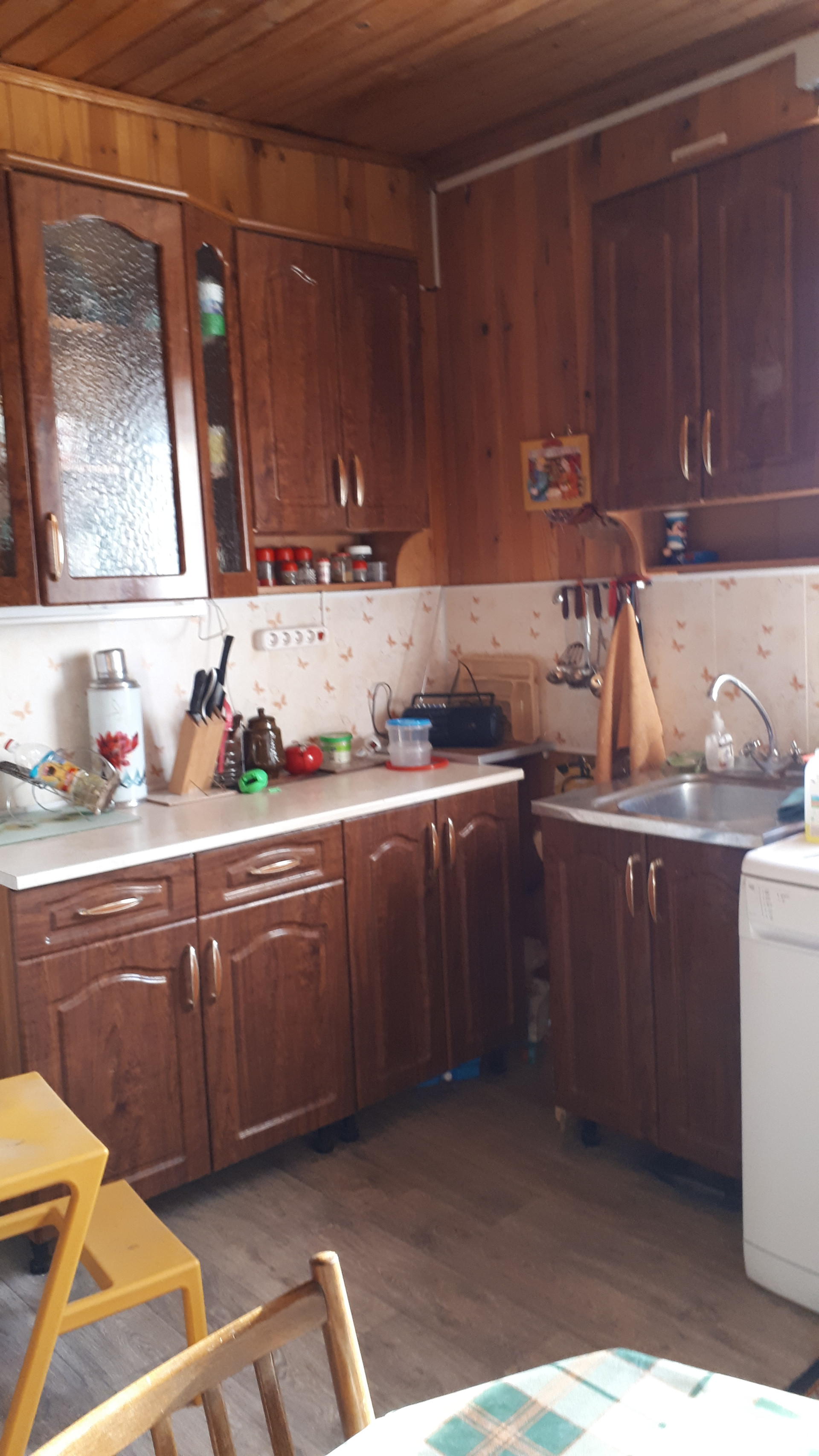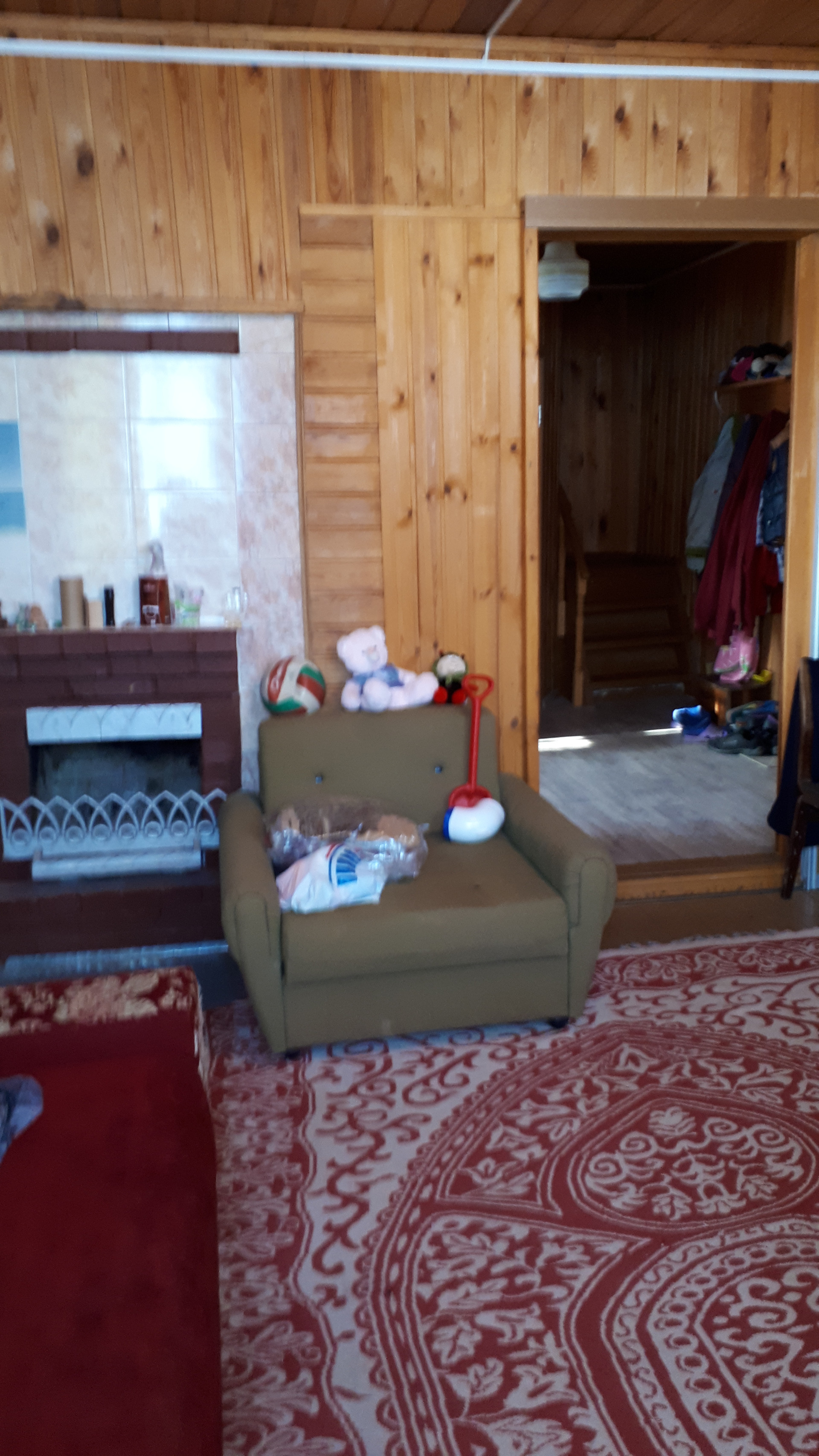 Сам дом очень функционально построен: от входа можно спуститься через хозблок в огород и к бане, в гараж, в помещение для хранения инвентаря, котельную или подняться по нескольким ступенькам в дом, на 1 этаже которого расположена очень просторная кухня-столовая, на которой может разместиться  большая семья или дорогие гости, кухня оборудована плитой, посудомоечной машиной, холодильником и даже есть рабочая кирпичная печь с большой плитой , гостинная с настоящим дровяным камином, из гостинной вход с спальную комнату. Все окна на 1 этаже заменены на стеклопакеты, Так же на 1 этаже  над гаражом расположена просторная летняя комната, в которую тоже можно при необходимости провести отопление. На втором мансардном этаже большая спальная комната для детей, она тоже обшита вагонкой и окна в ней деревянные, там хорошо дышится и спится .