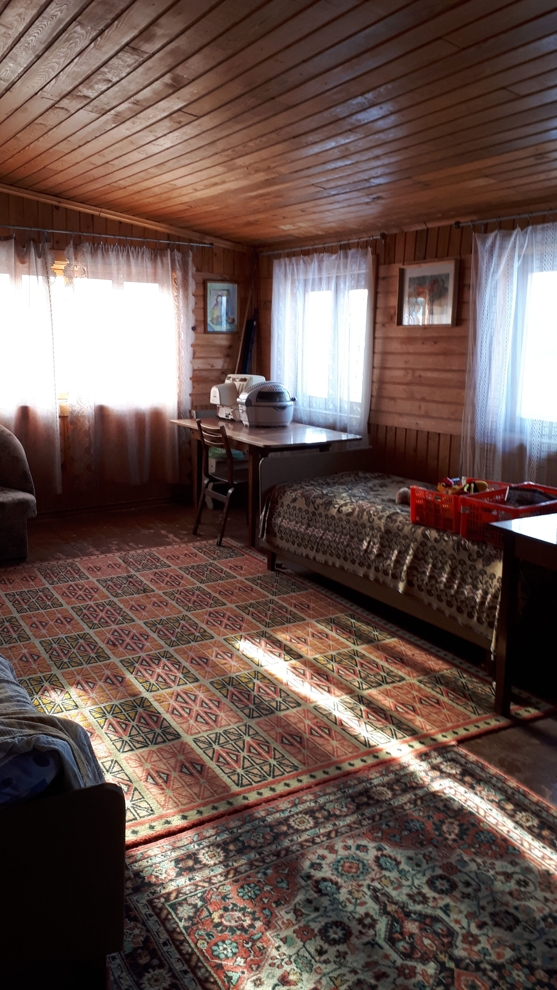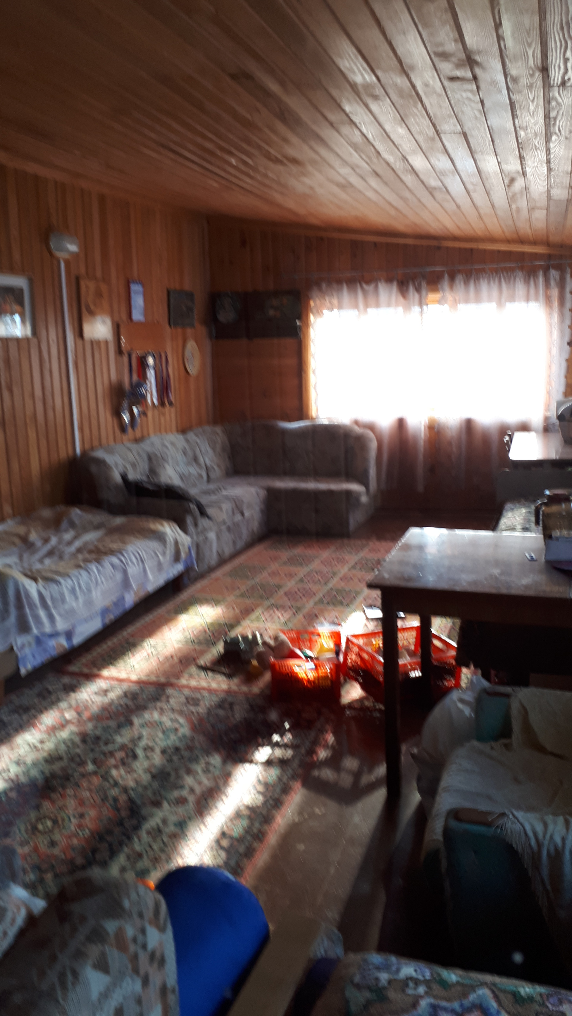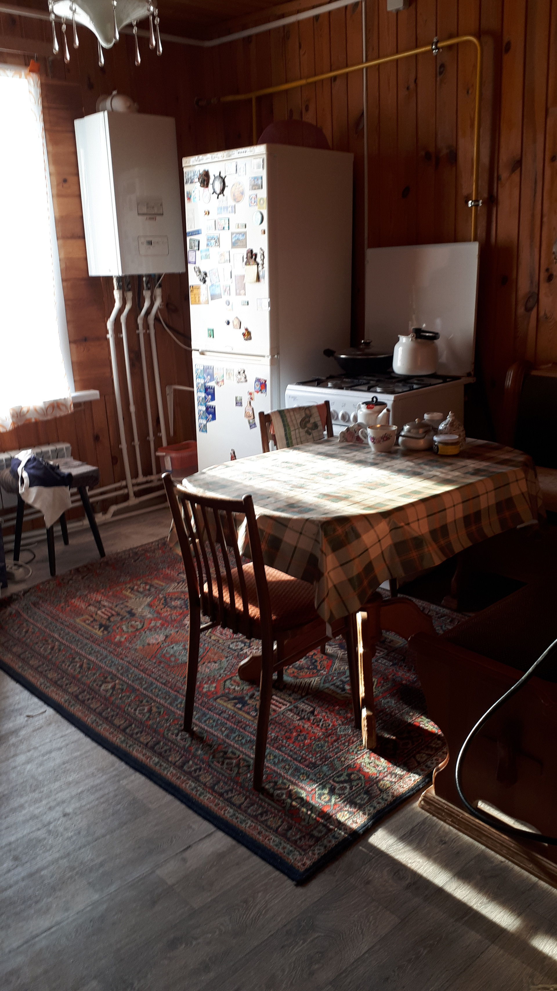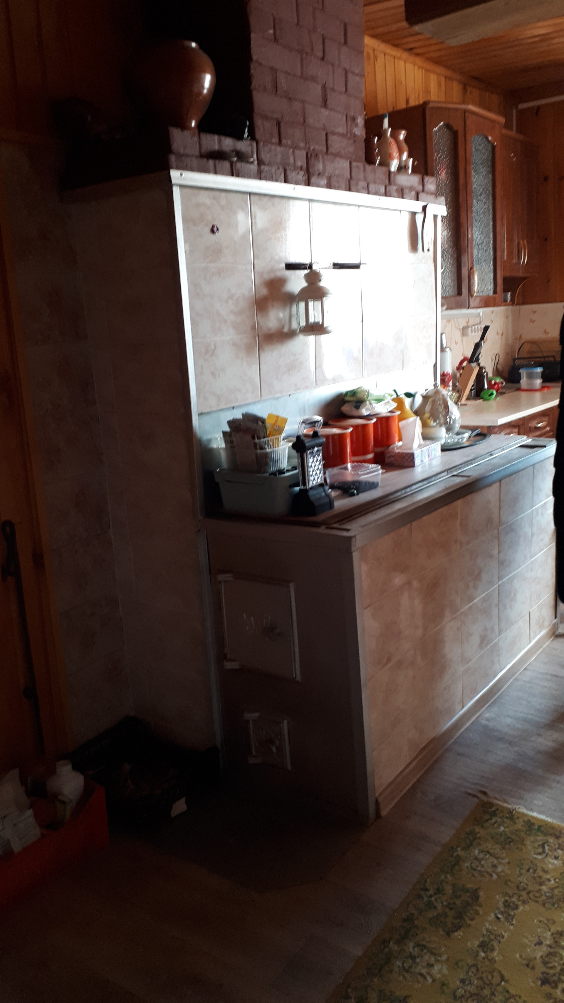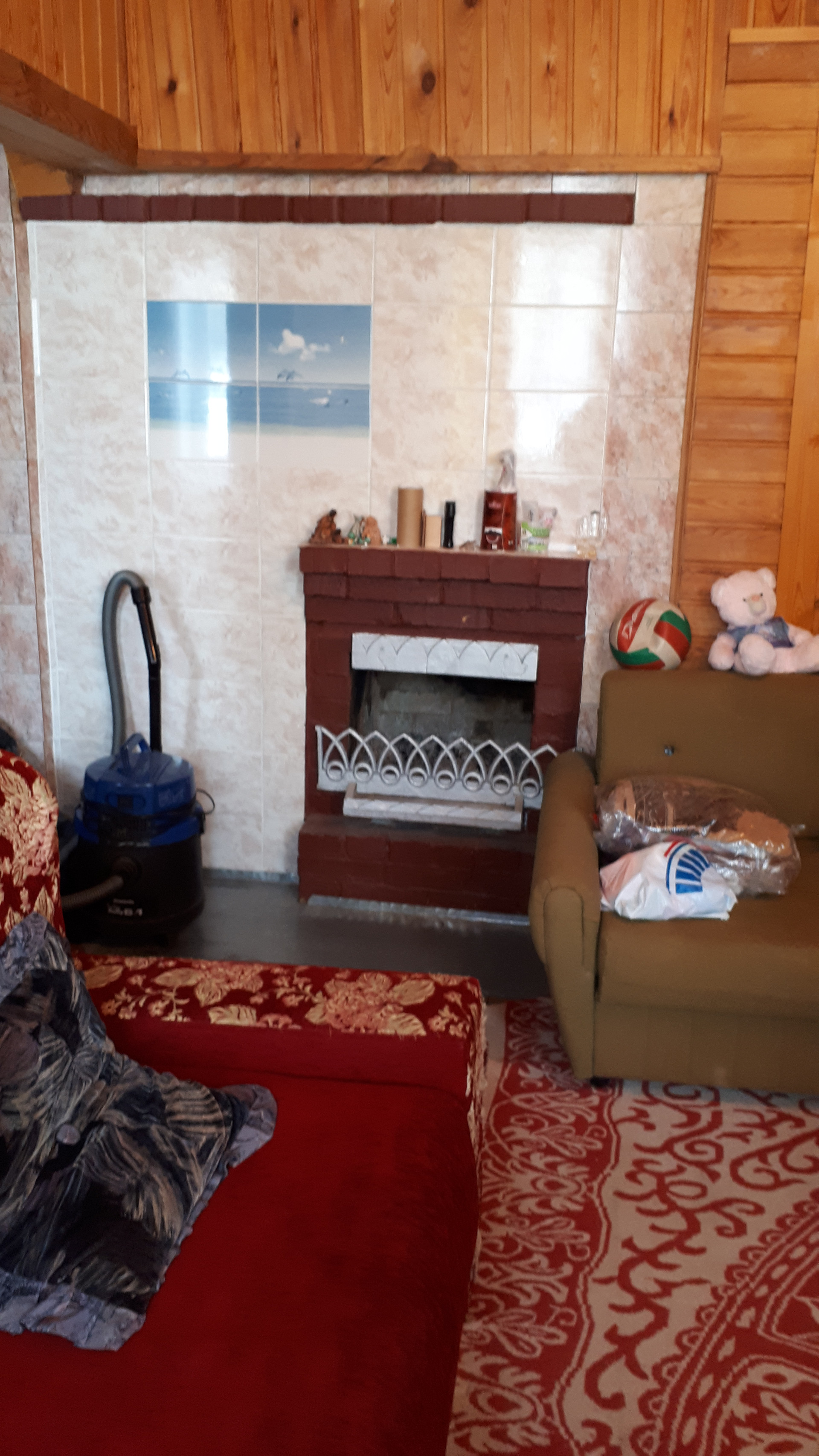 Сам дом очень функционально построен: от входа можно спуститься через хозблок в огород и к бане, в гараж, в помещение для хранения инвентаря, котельную или подняться по нескольким ступенькам в дом, на 1 этаже которого расположена очень просторная кухня-столовая, на которой может разместиться  большая семья или дорогие гости, кухня оборудована плитой, посудомоечной машиной, холодильником и даже есть рабочая кирпичная печь с большой плитой , гостинная с настоящим дровяным камином, из гостинной вход с спальную комнату. Все окна на 1 этаже заменены на стеклопакеты, Так же на 1 этаже  над гаражом расположена просторная летняя комната, в которую тоже можно при необходимости провести отопление. На втором мансардном этаже большая спальная комната для детей, она тоже обшита вагонкой и окна в ней деревянные, там хорошо дышится и спится .