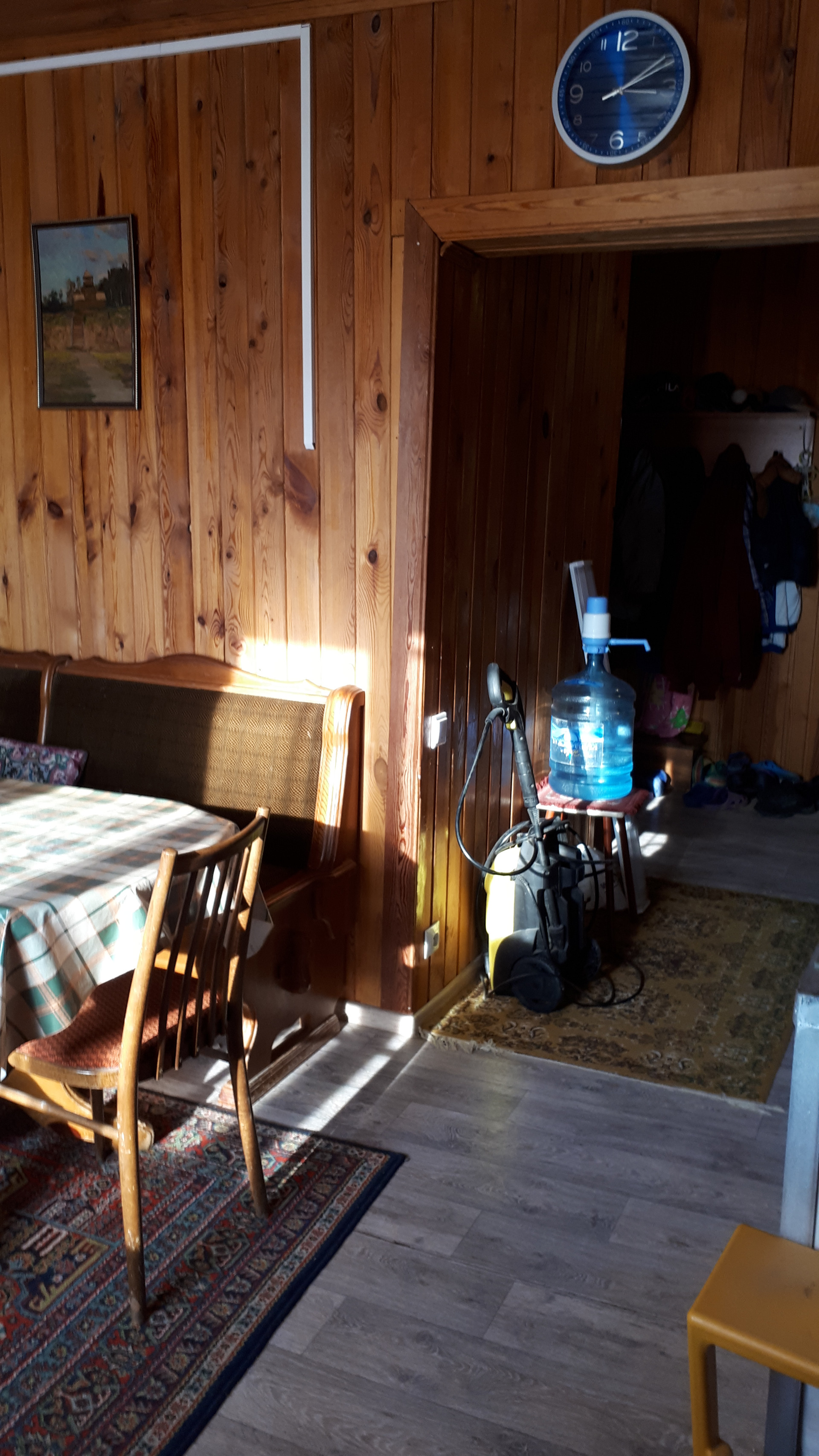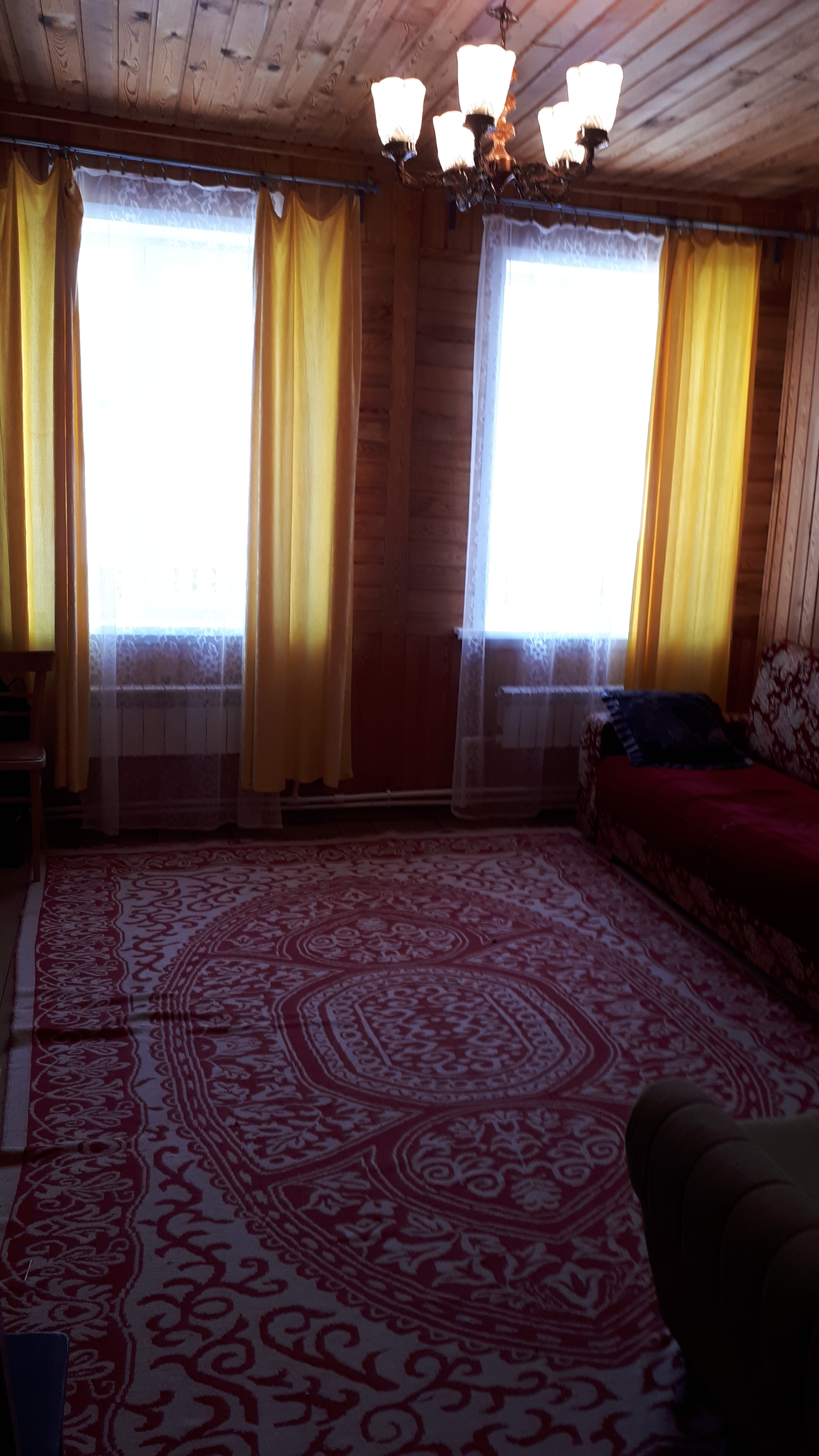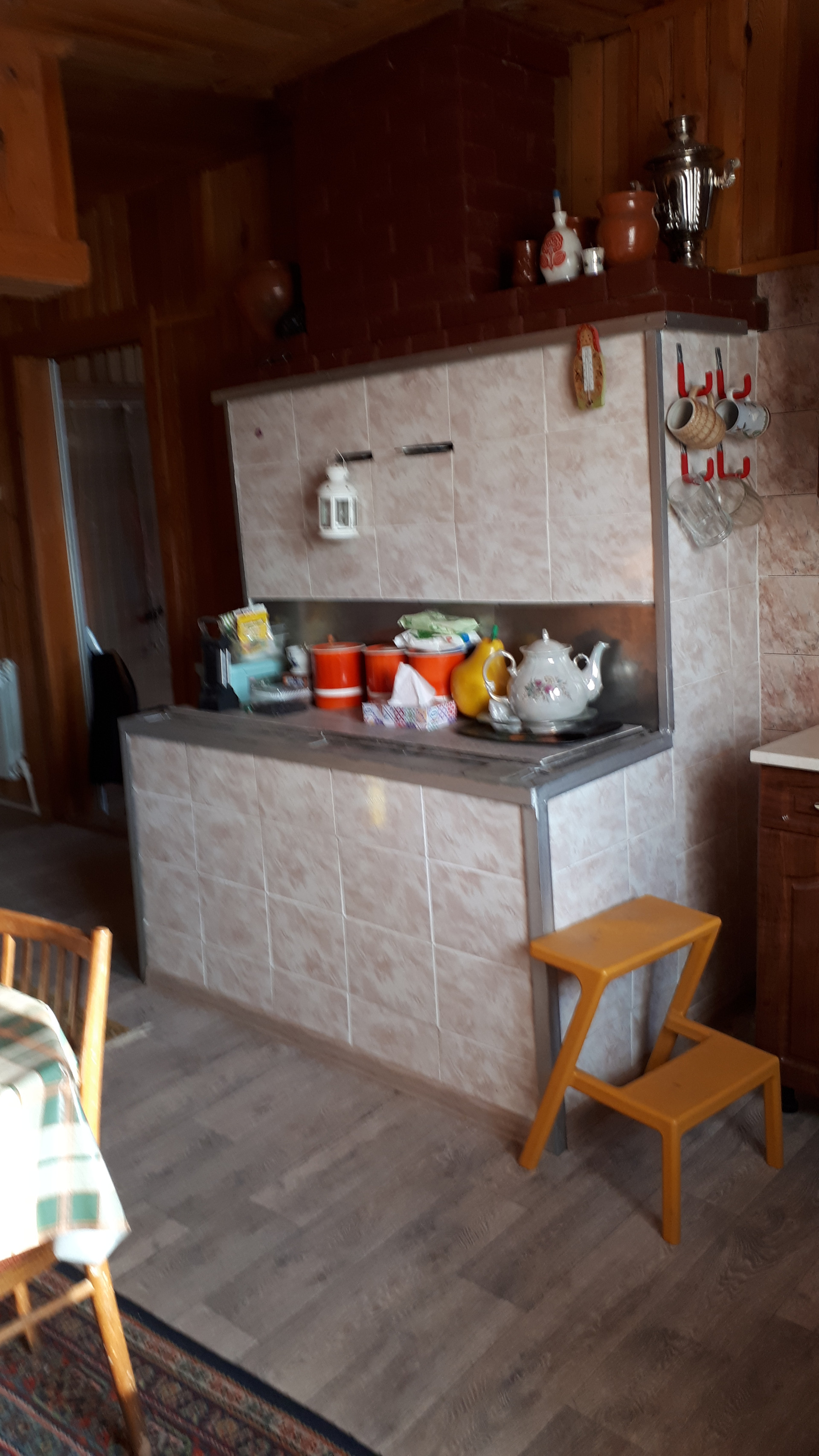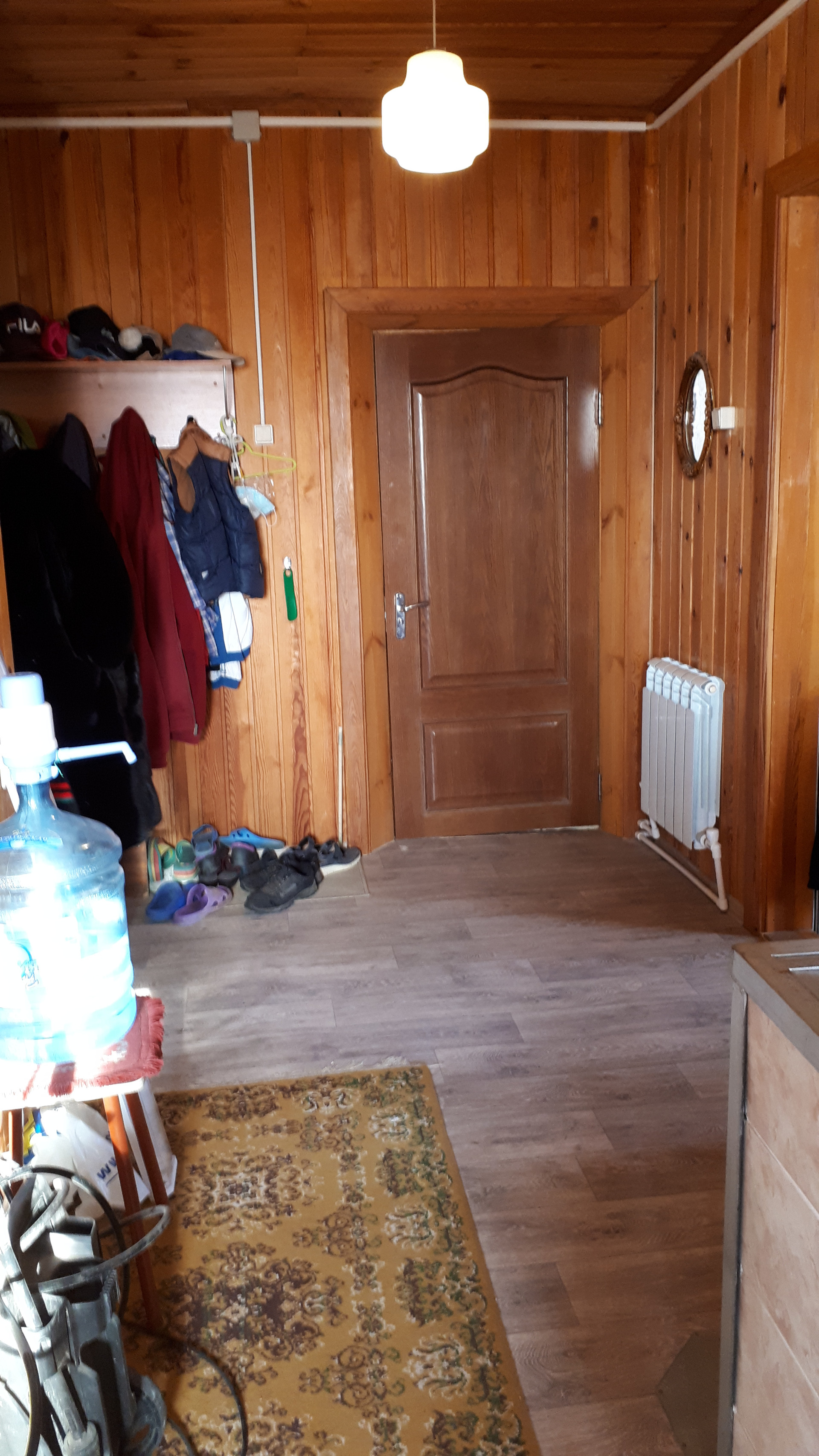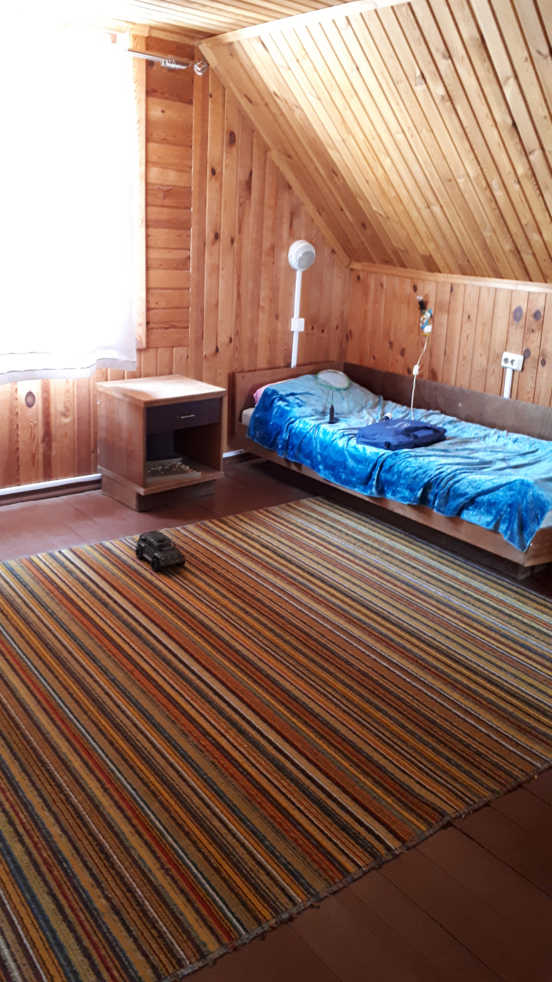 Сам дом очень функционально построен: от входа можно спуститься через хозблок в огород и к бане, в гараж, в помещение для хранения инвентаря, котельную или подняться по нескольким ступенькам в дом, на 1 этаже которого расположена очень просторная кухня-столовая, на которой может разместиться  большая семья или дорогие гости, кухня оборудована плитой, посудомоечной машиной, холодильником и даже есть рабочая кирпичная печь с большой плитой , гостинная с настоящим дровяным камином, из гостинной вход с спальную комнату. Все окна на 1 этаже заменены на стеклопакеты, Так же на 1 этаже  над гаражом расположена просторная летняя комната, в которую тоже можно при необходимости провести отопление. На втором мансардном этаже большая спальная комната для детей, она тоже обшита вагонкой и окна в ней деревянные, там хорошо дышится и спится .