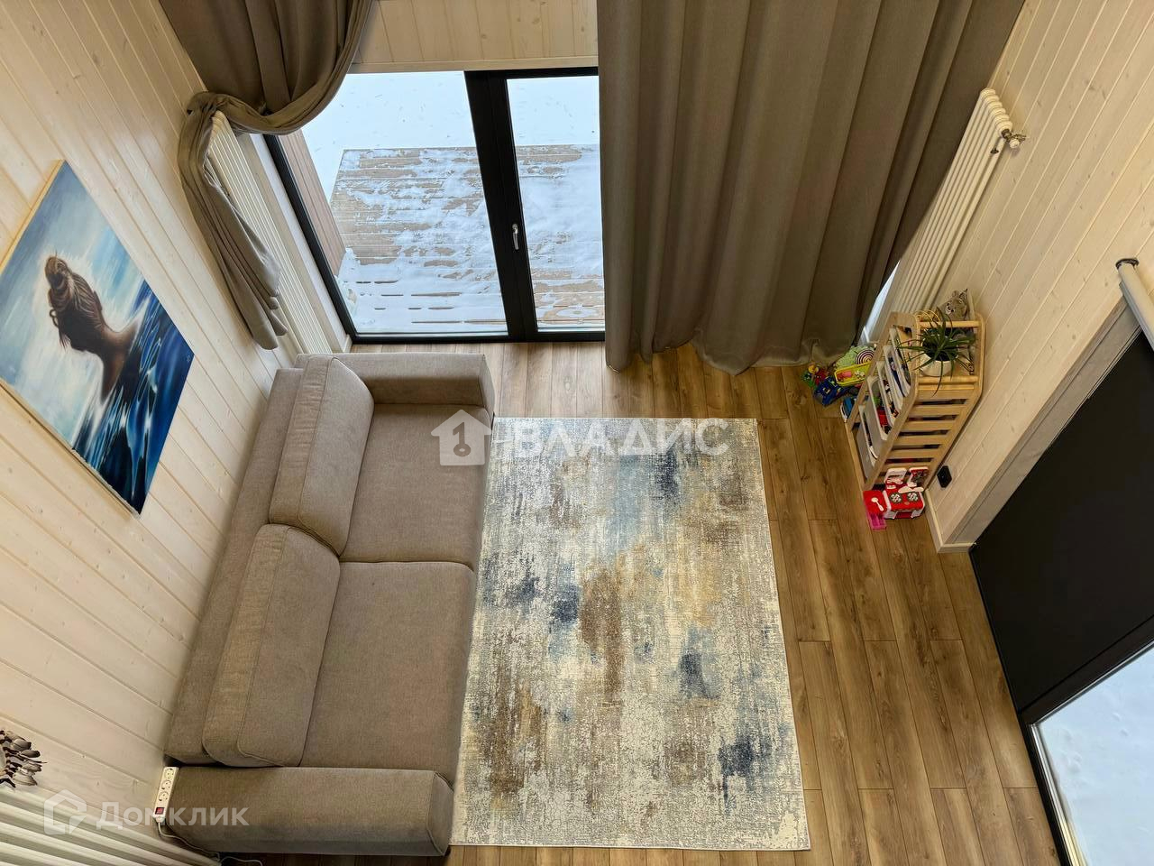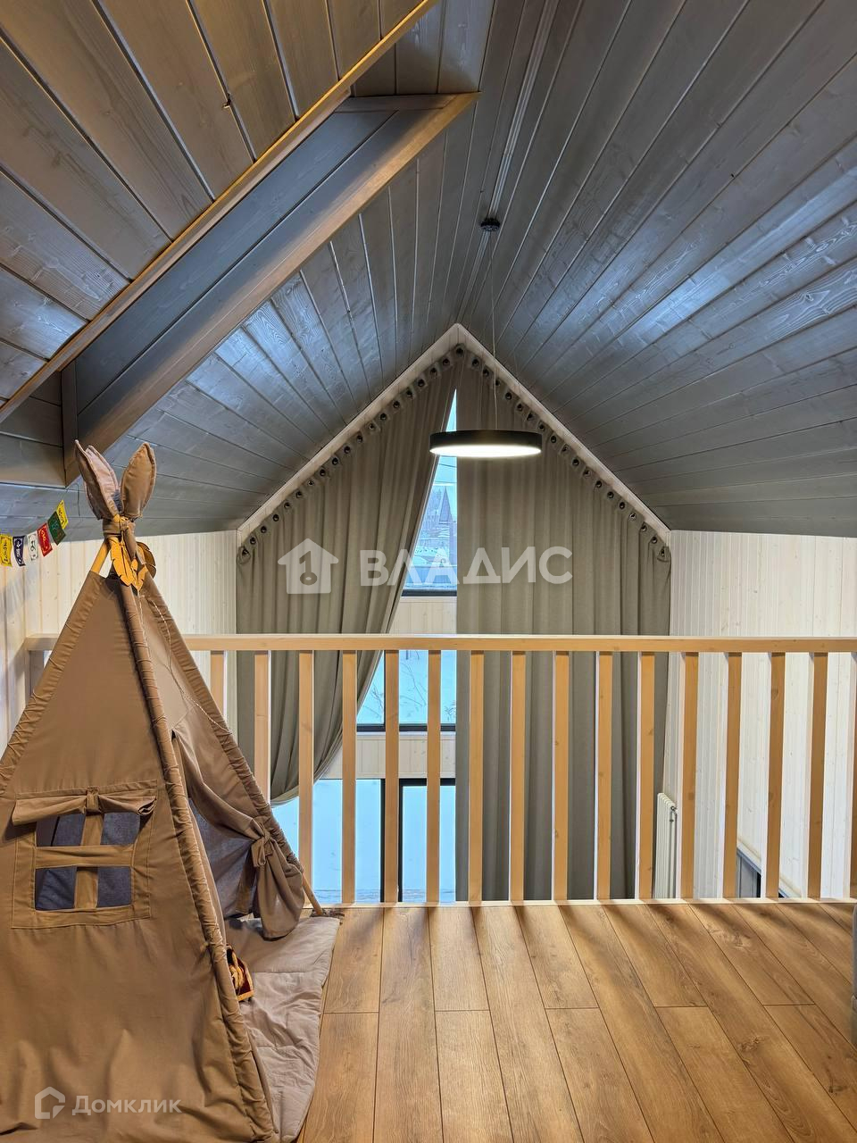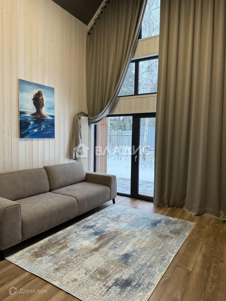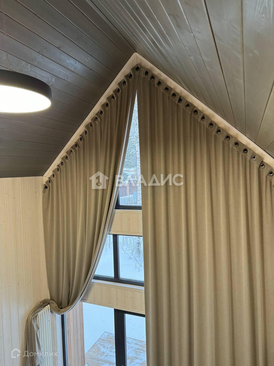 В барне повешены шторы из красивой итальянской ткани, высотой 5,7 метров, ролл-шторы на окнах.