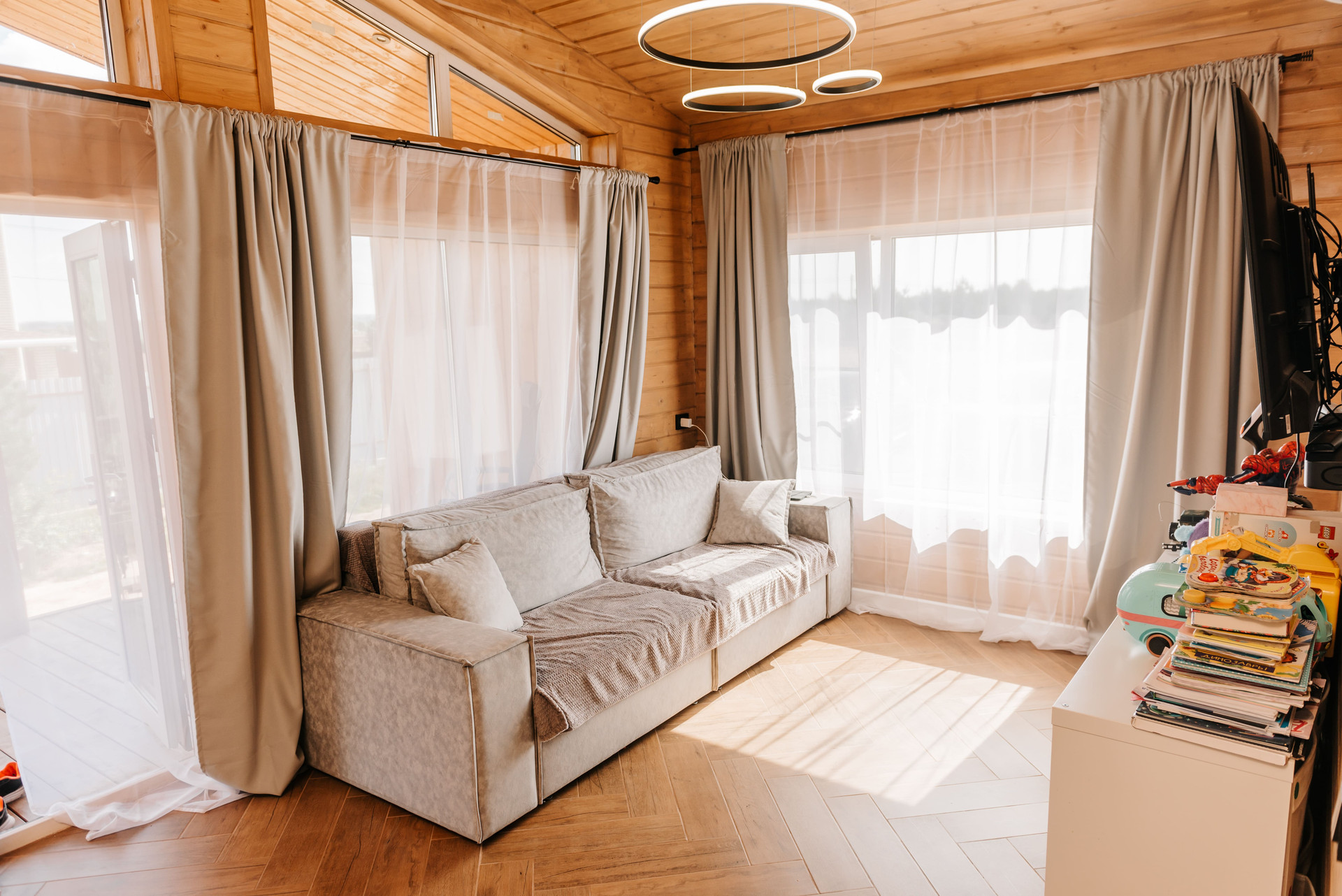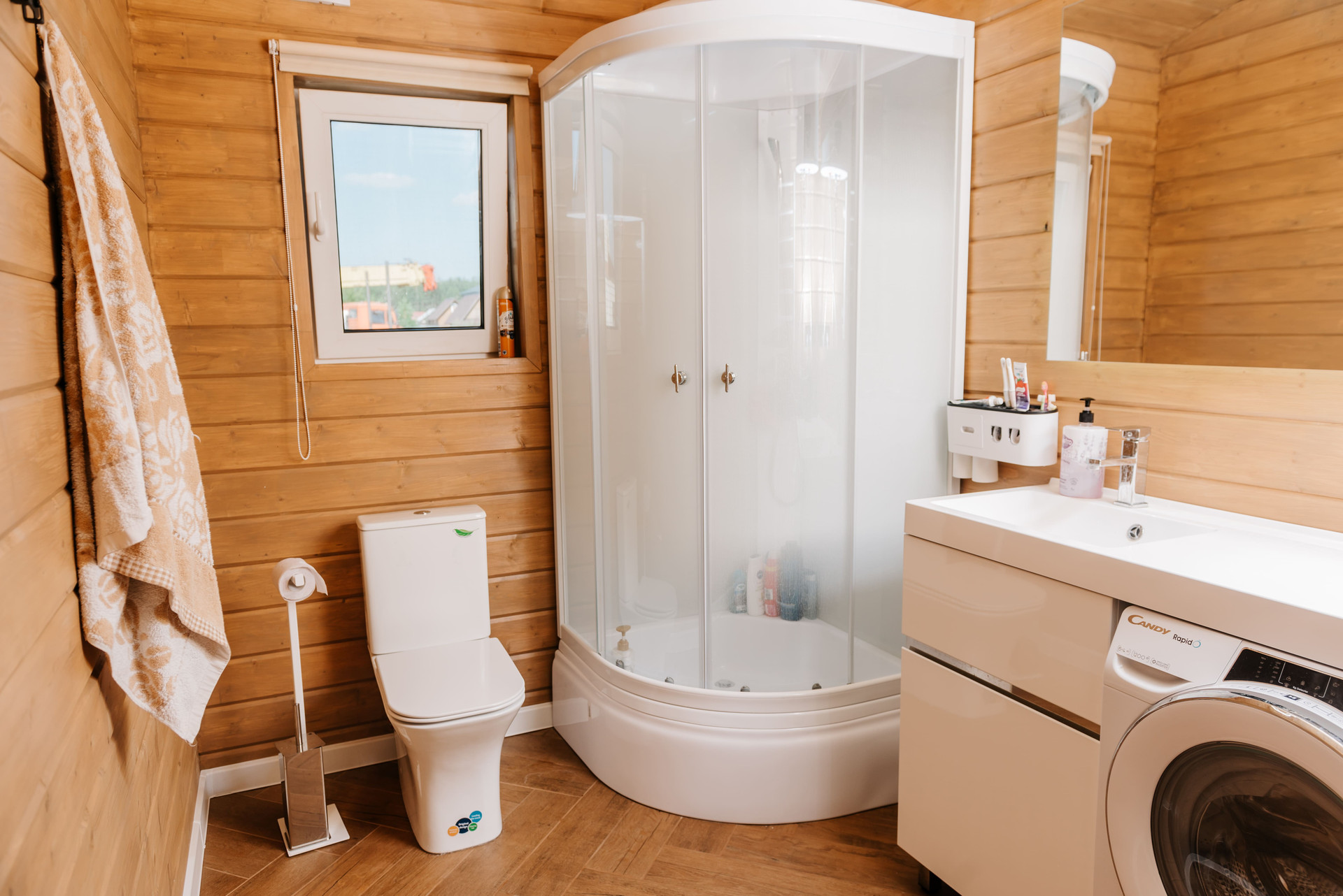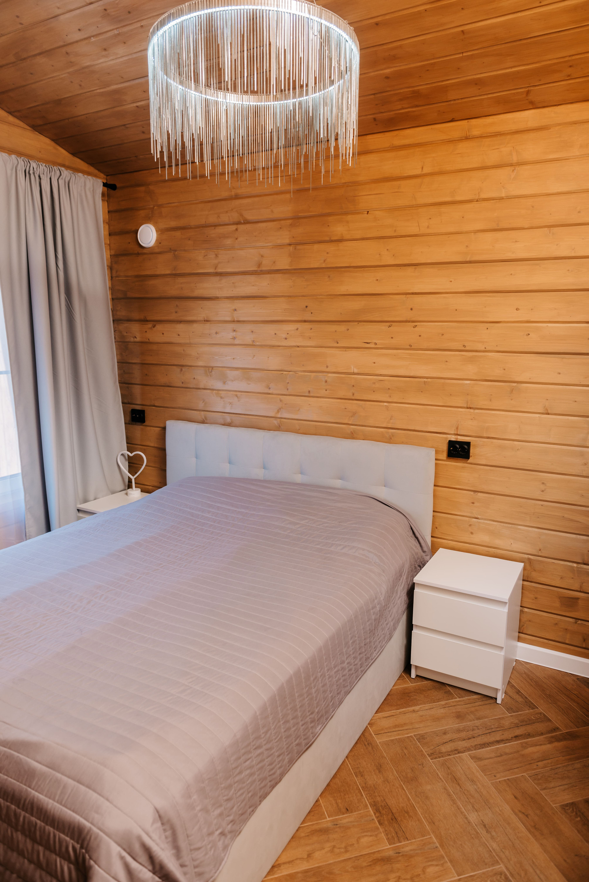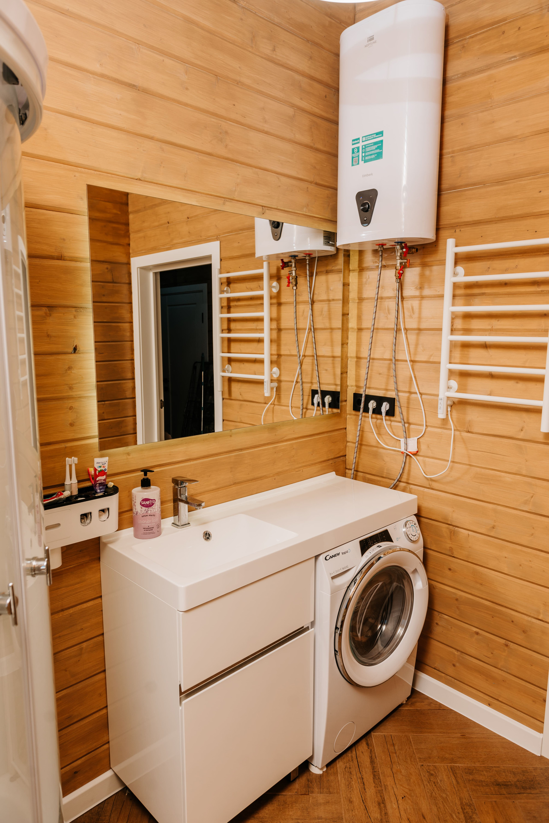- Внутренняя отделка дома имитация бруса, покрашенная двойным слоем воском лазурью Husky, на полу керамогранит Laparet, выложенный елочкой по всему дому;