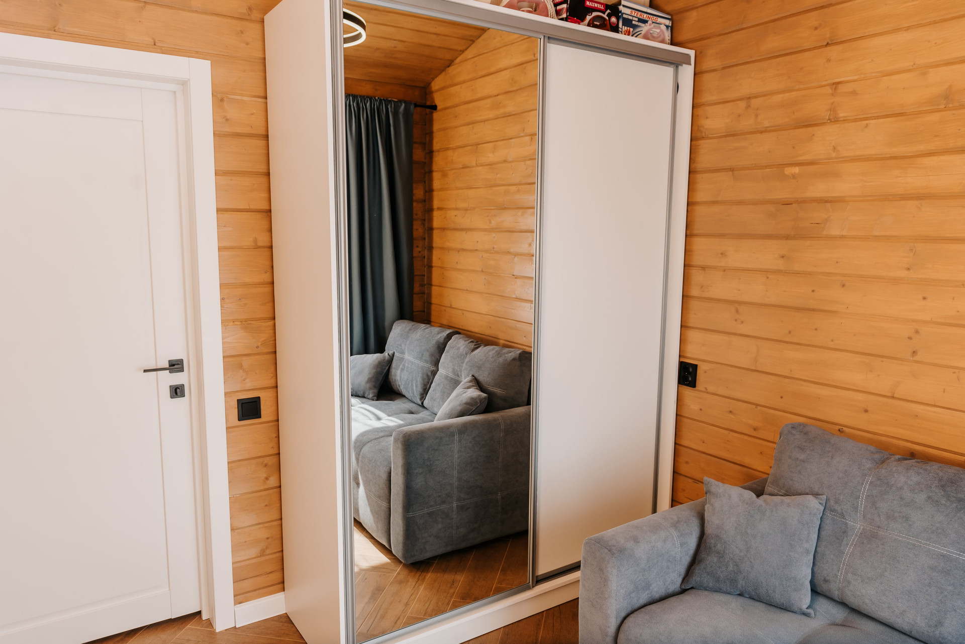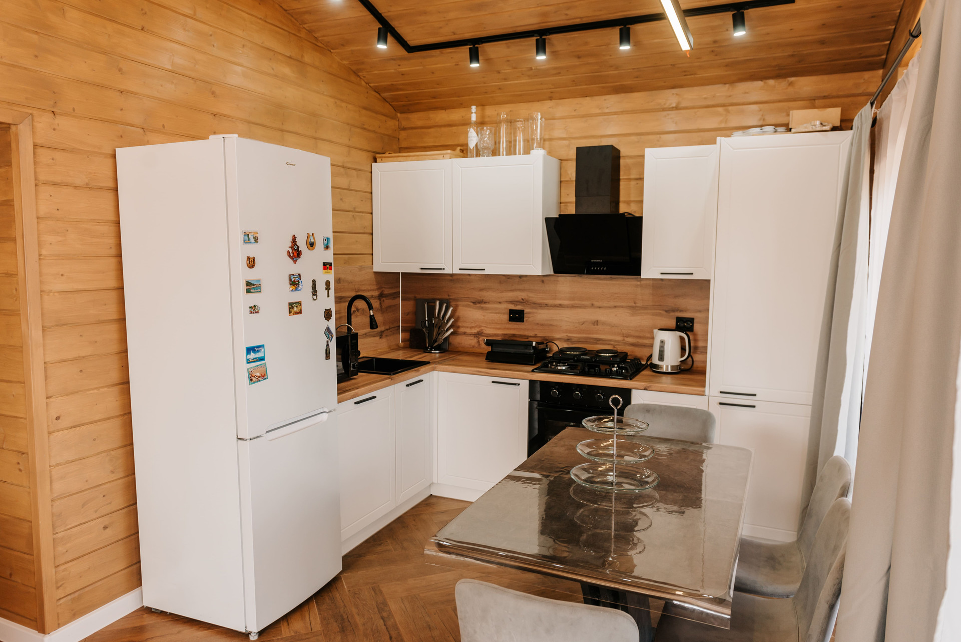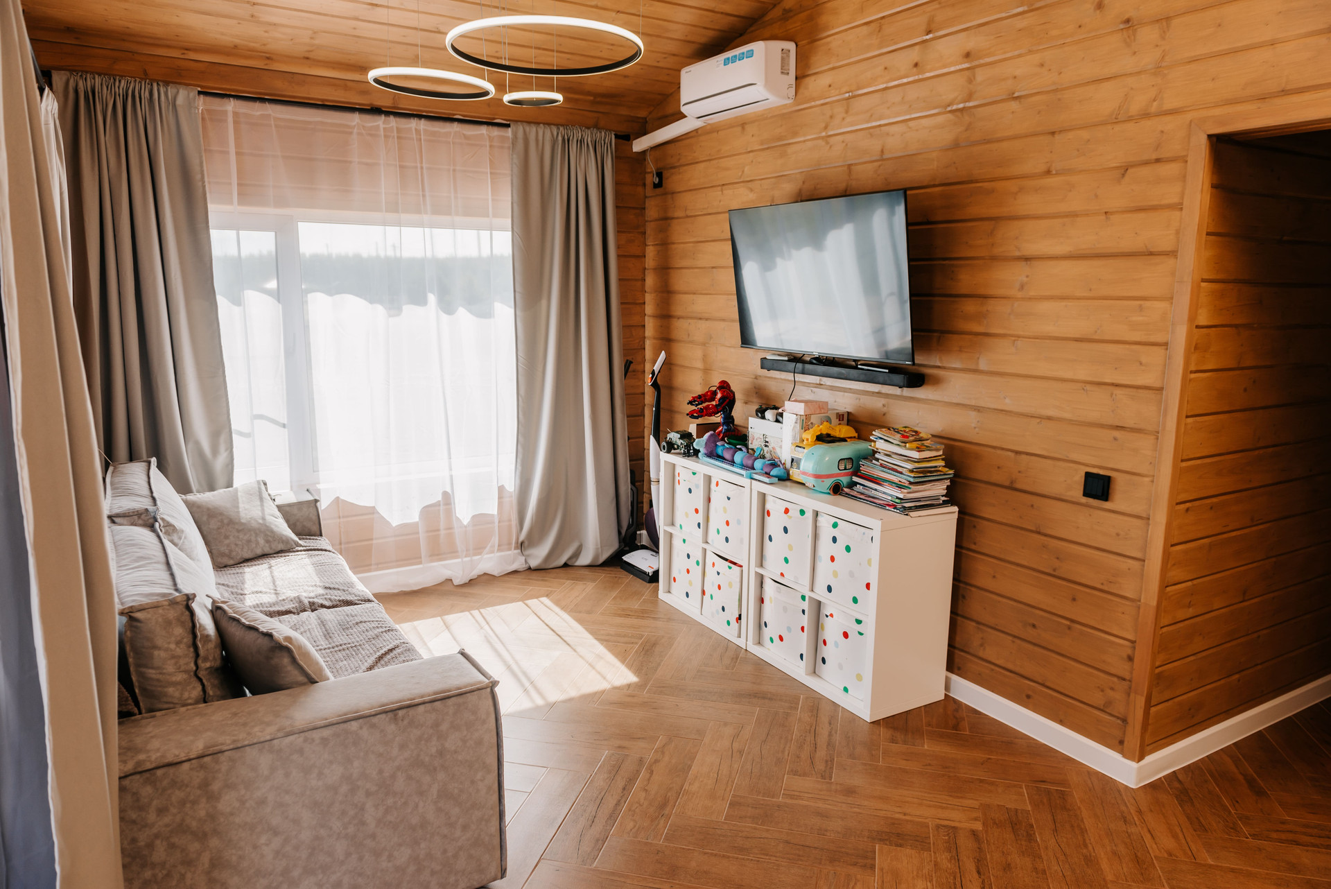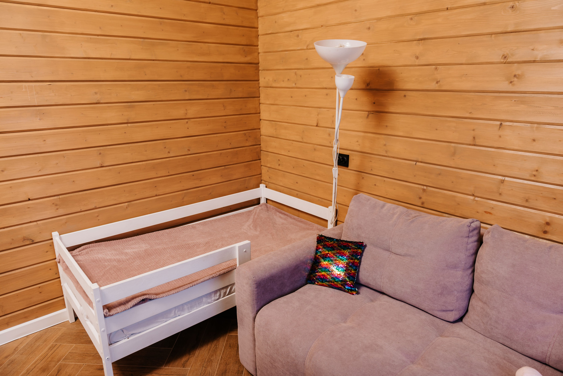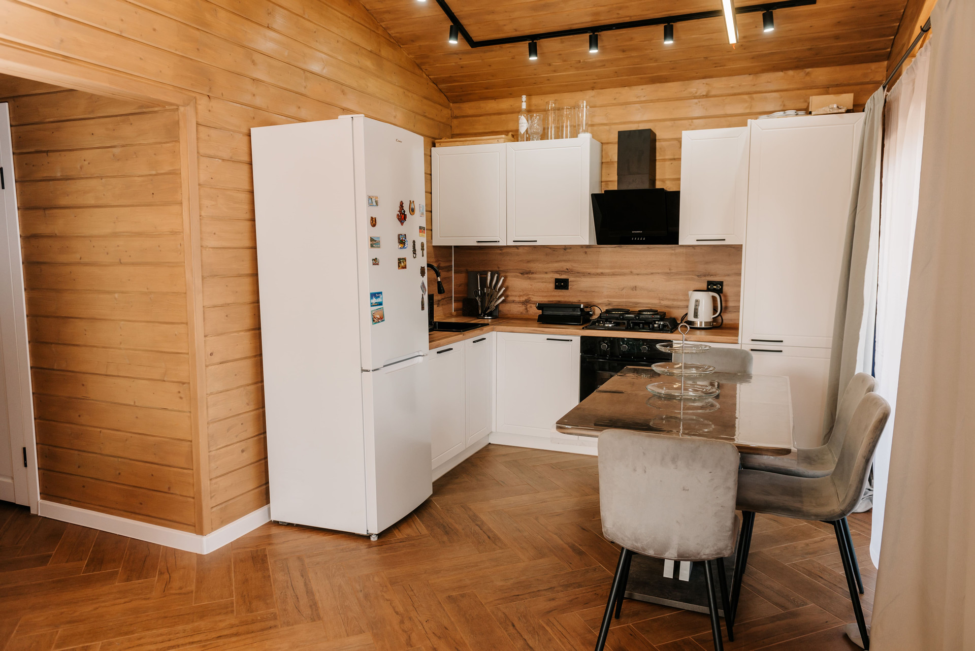 - Внутренняя отделка дома имитация бруса, покрашенная двойным слоем воском лазурью Husky, на полу керамогранит Laparet, выложенный елочкой по всему дому;