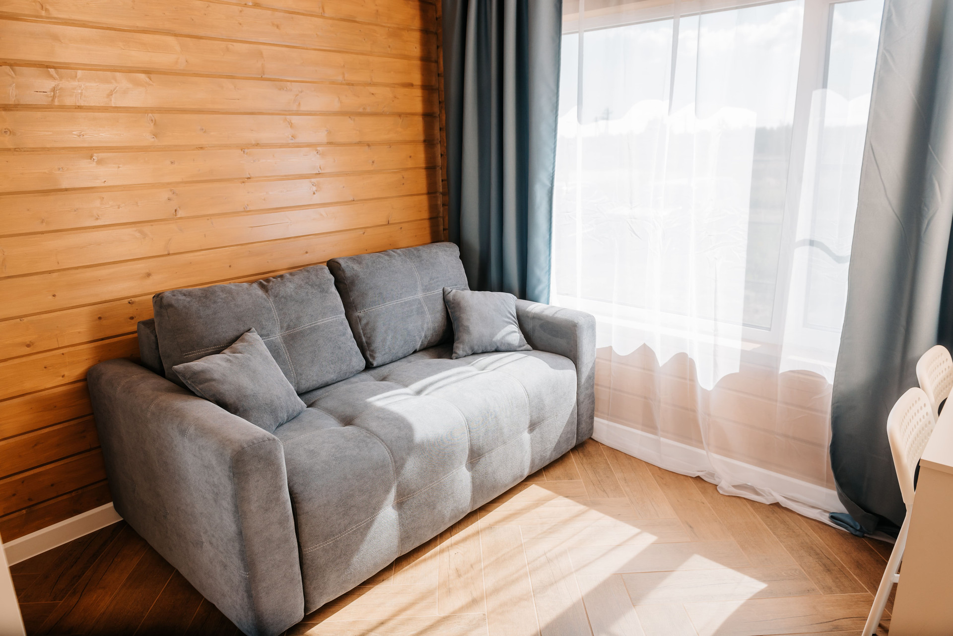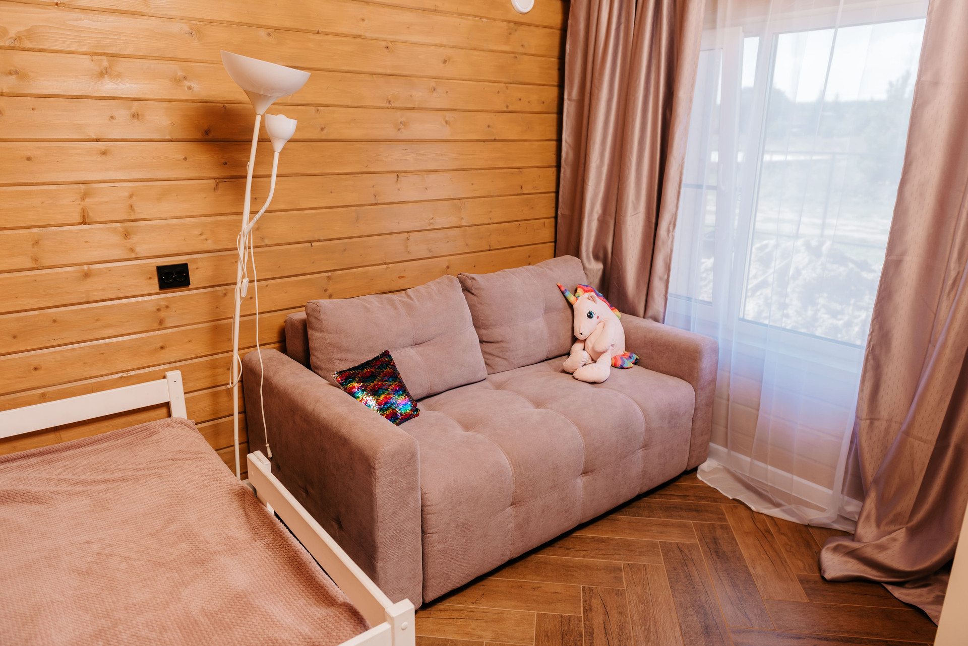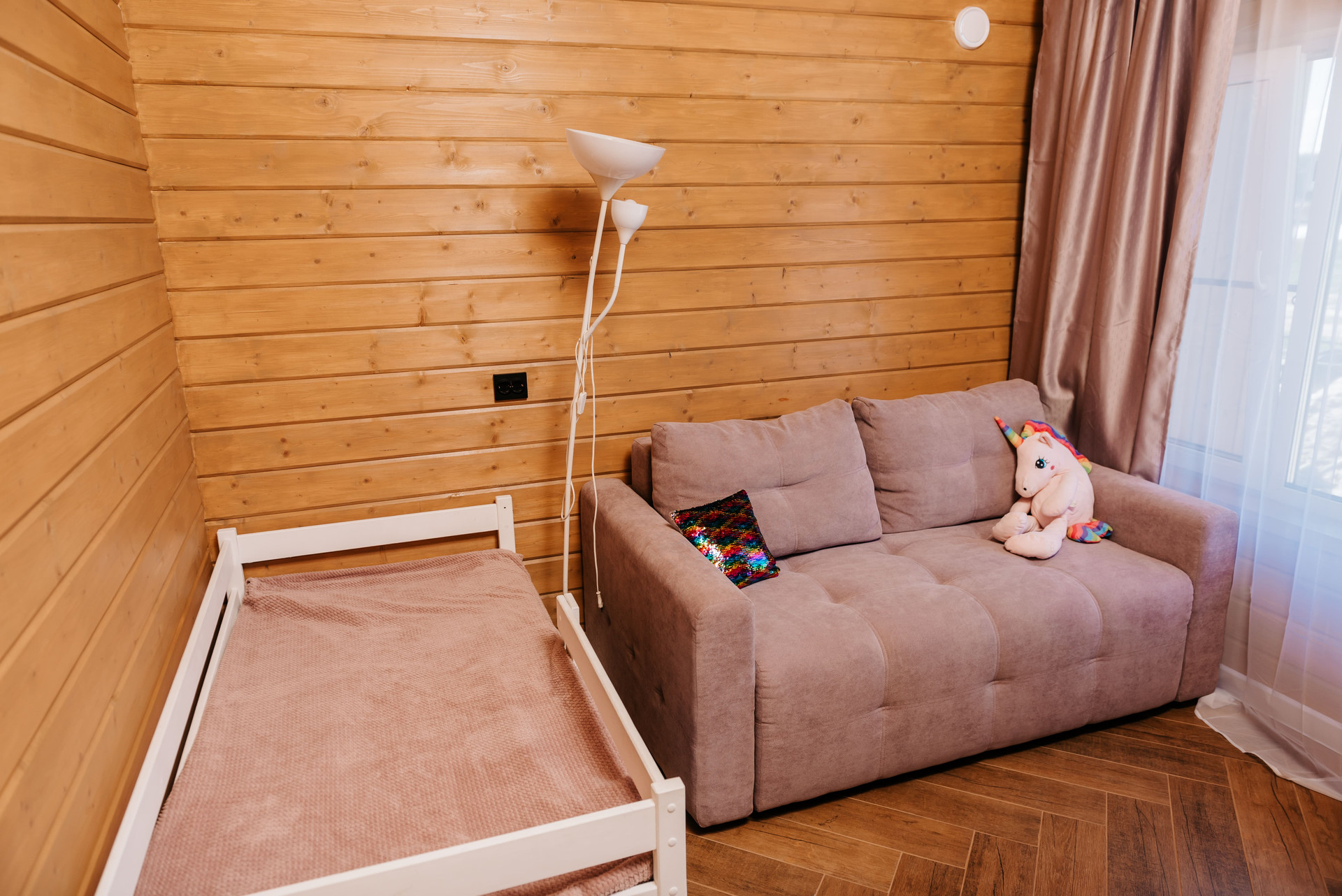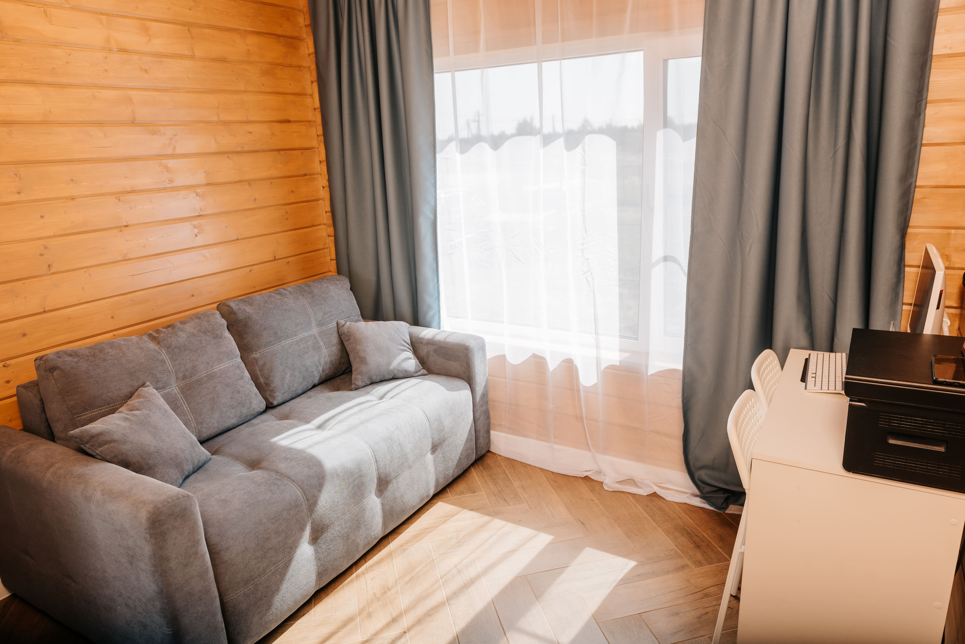 - Внутренняя отделка дома имитация бруса, покрашенная двойным слоем воском лазурью Husky, на полу керамогранит Laparet, выложенный елочкой по всему дому;