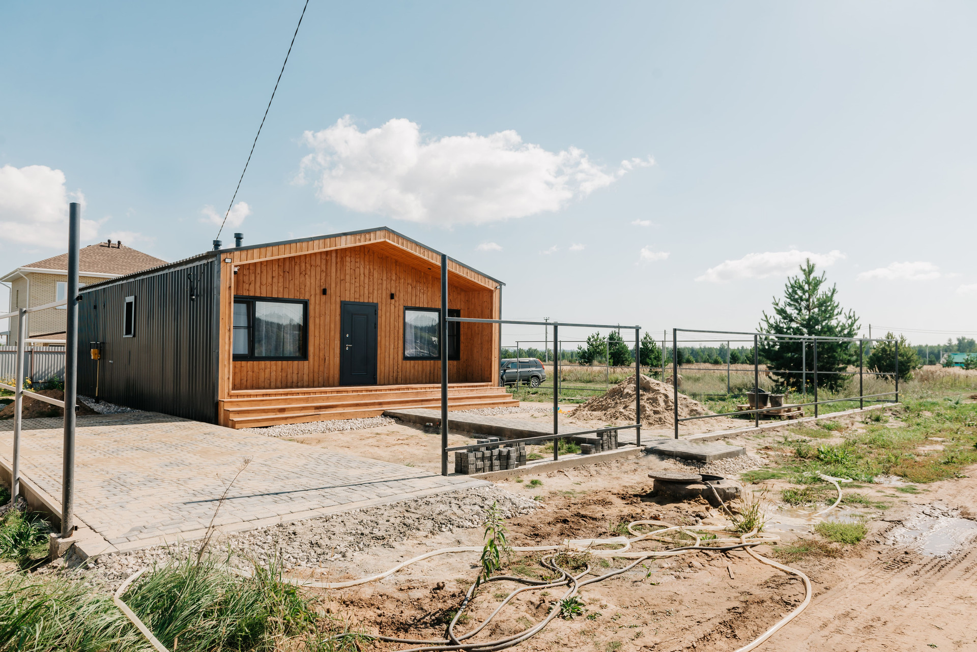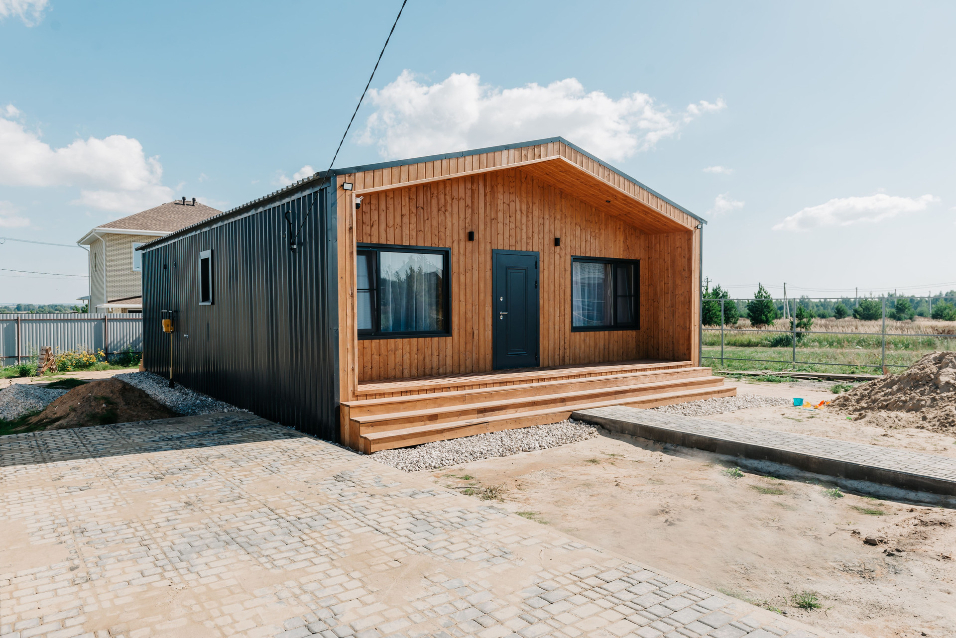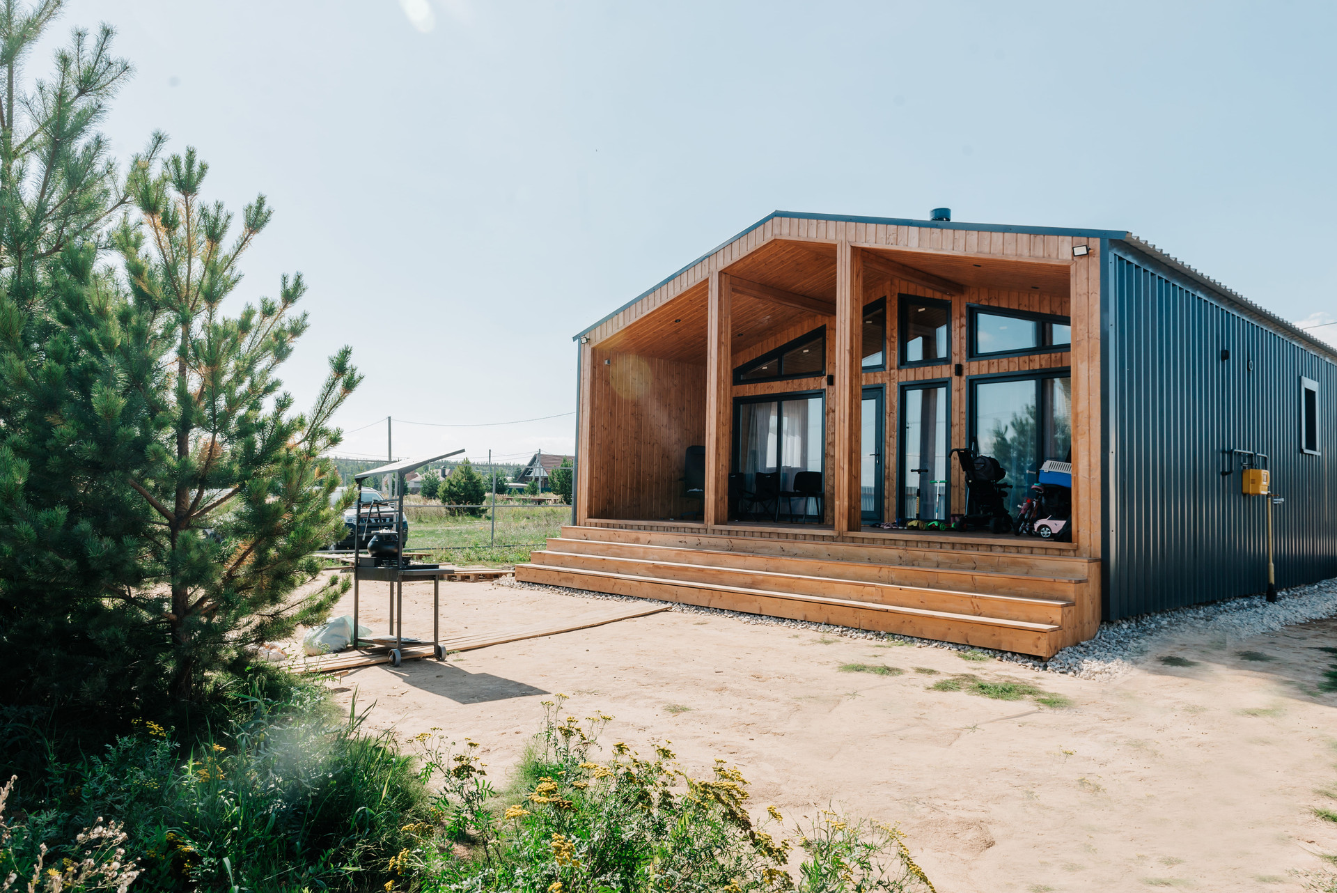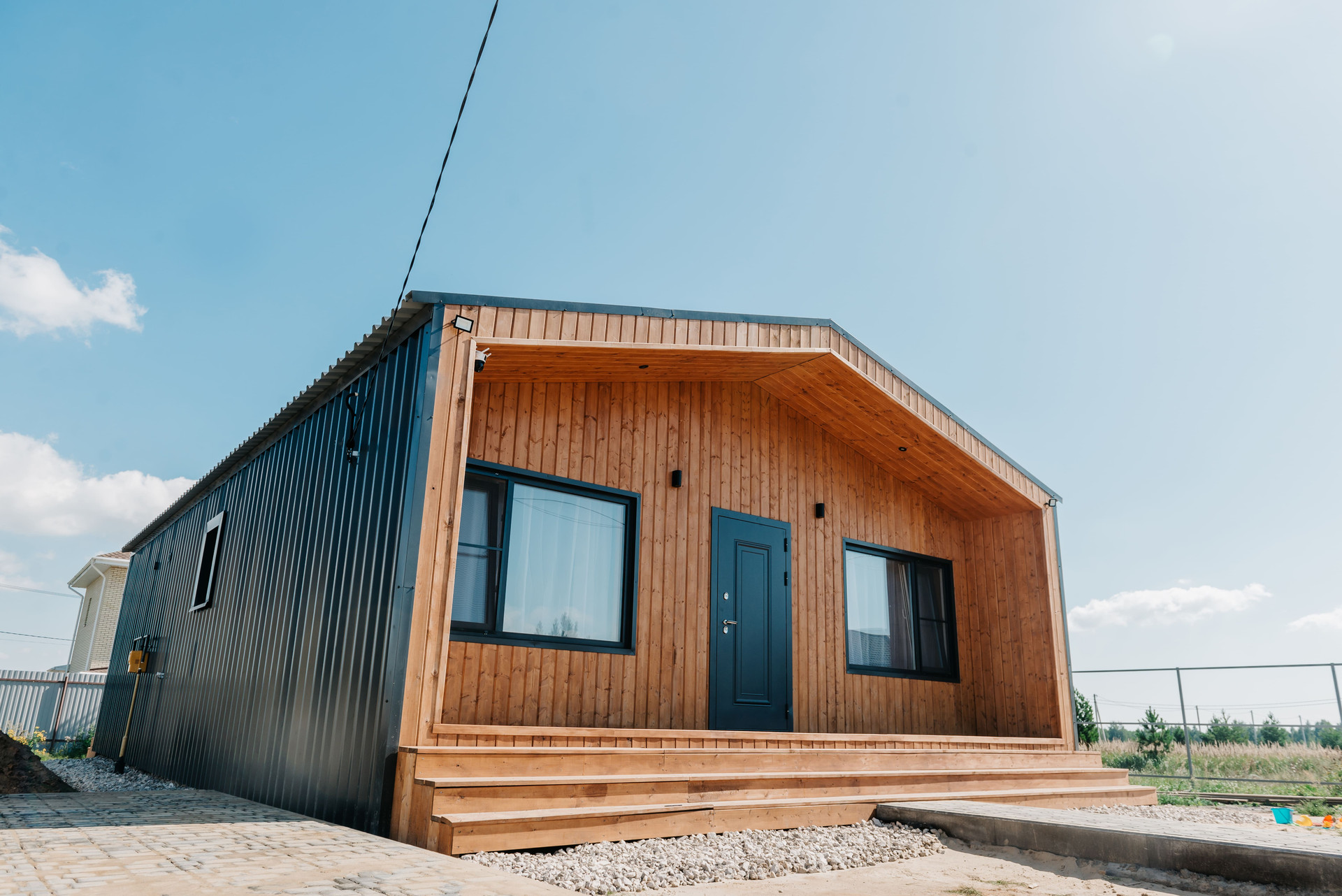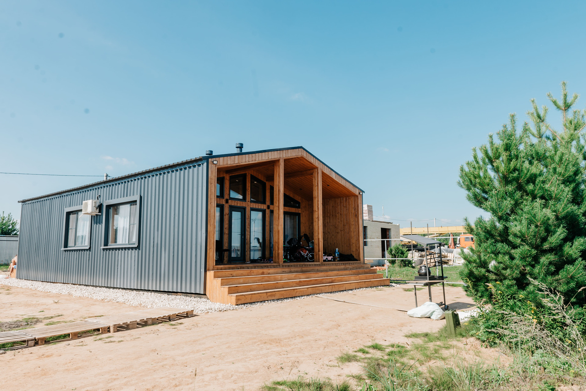 - Внешняя отделка профнастилом ral 7024 C44 и на террасах имитация бруса, прокрашенная до монтажа тройным слоем маслом Husky;