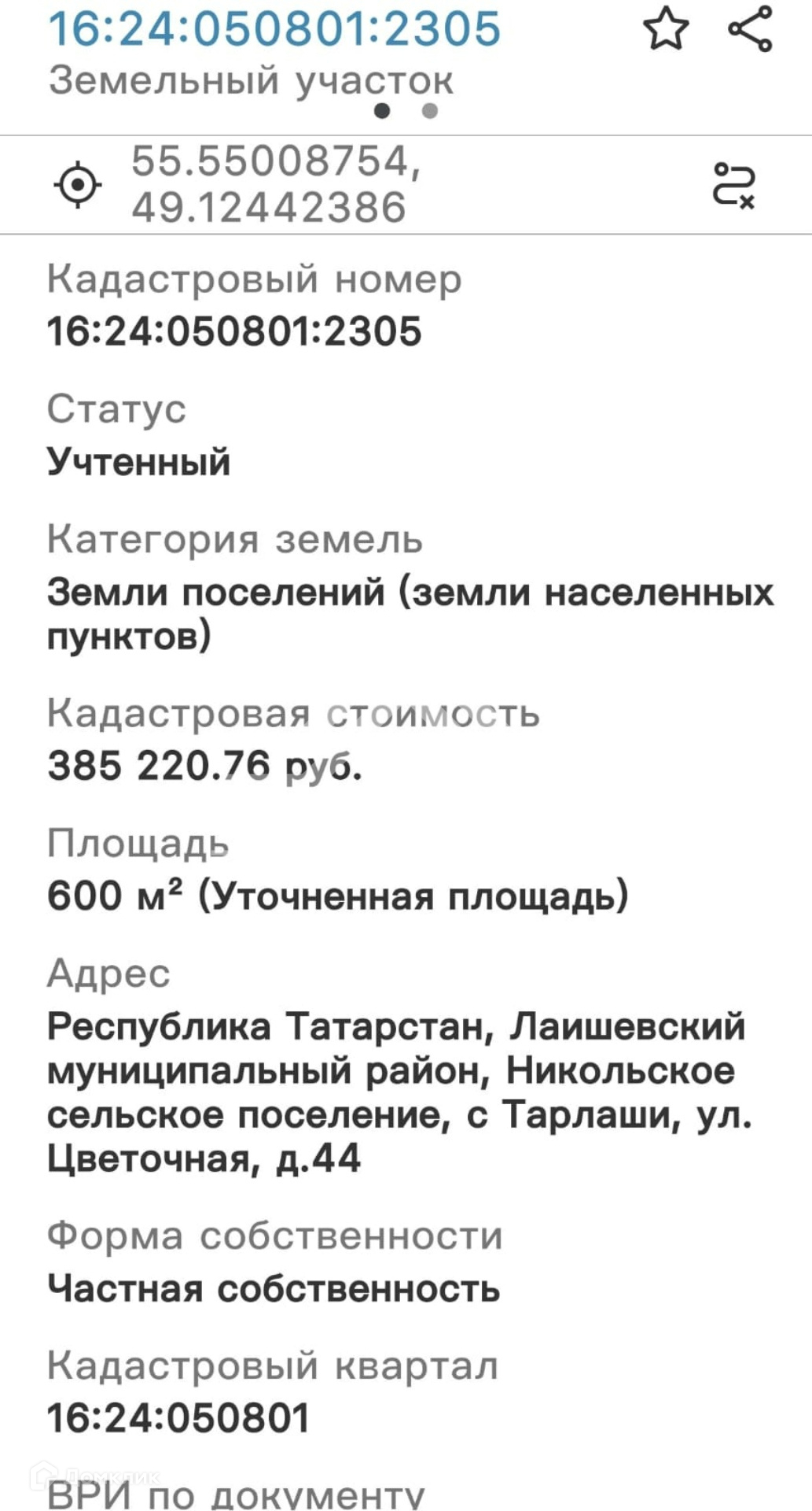 Кадастровый номер: 16:24:050801:2305