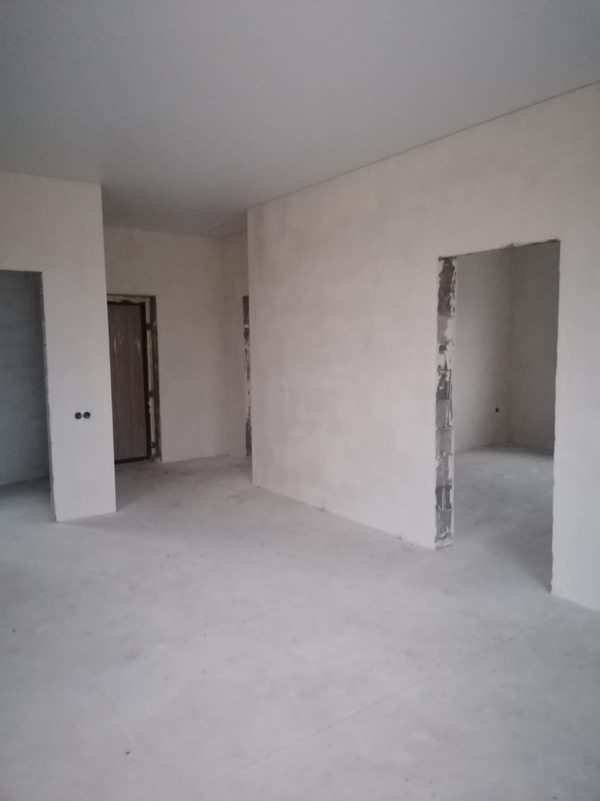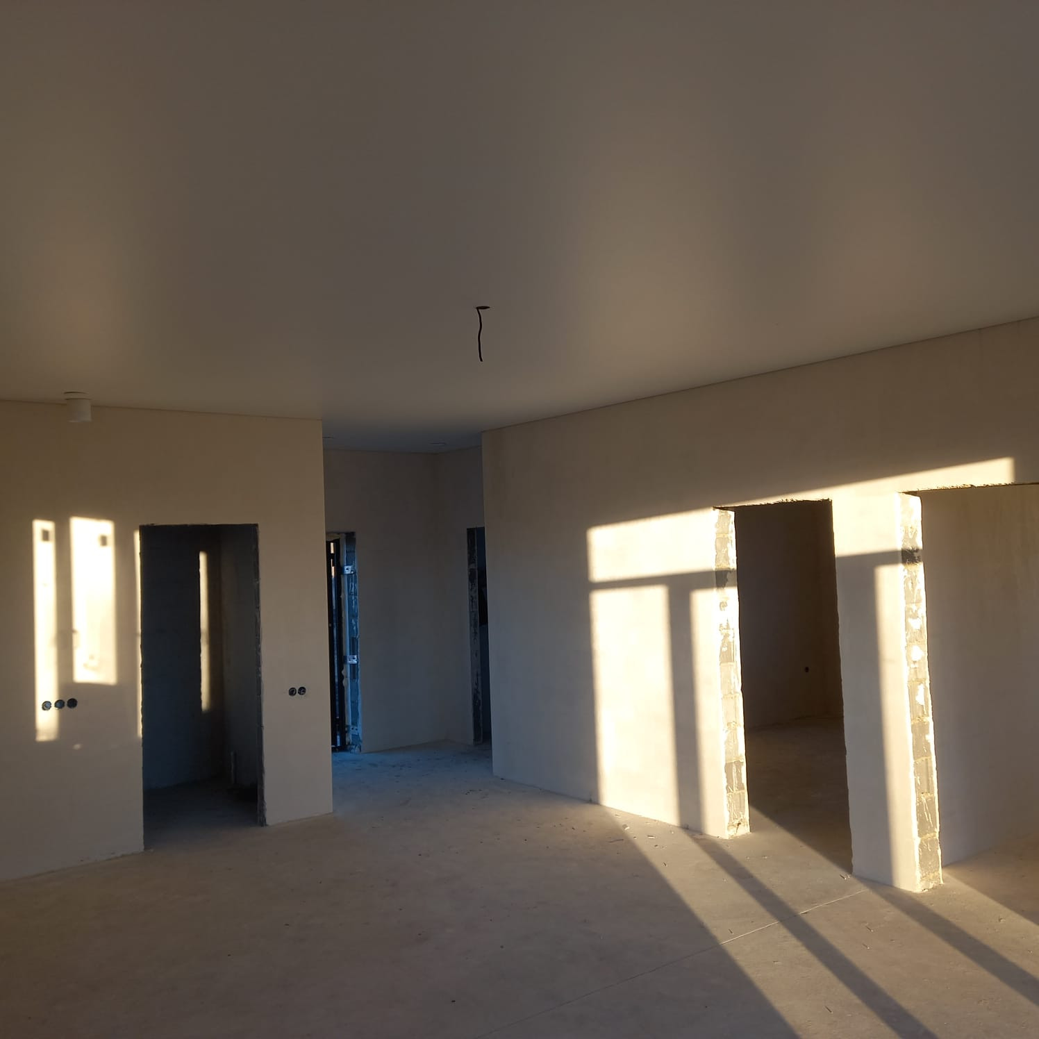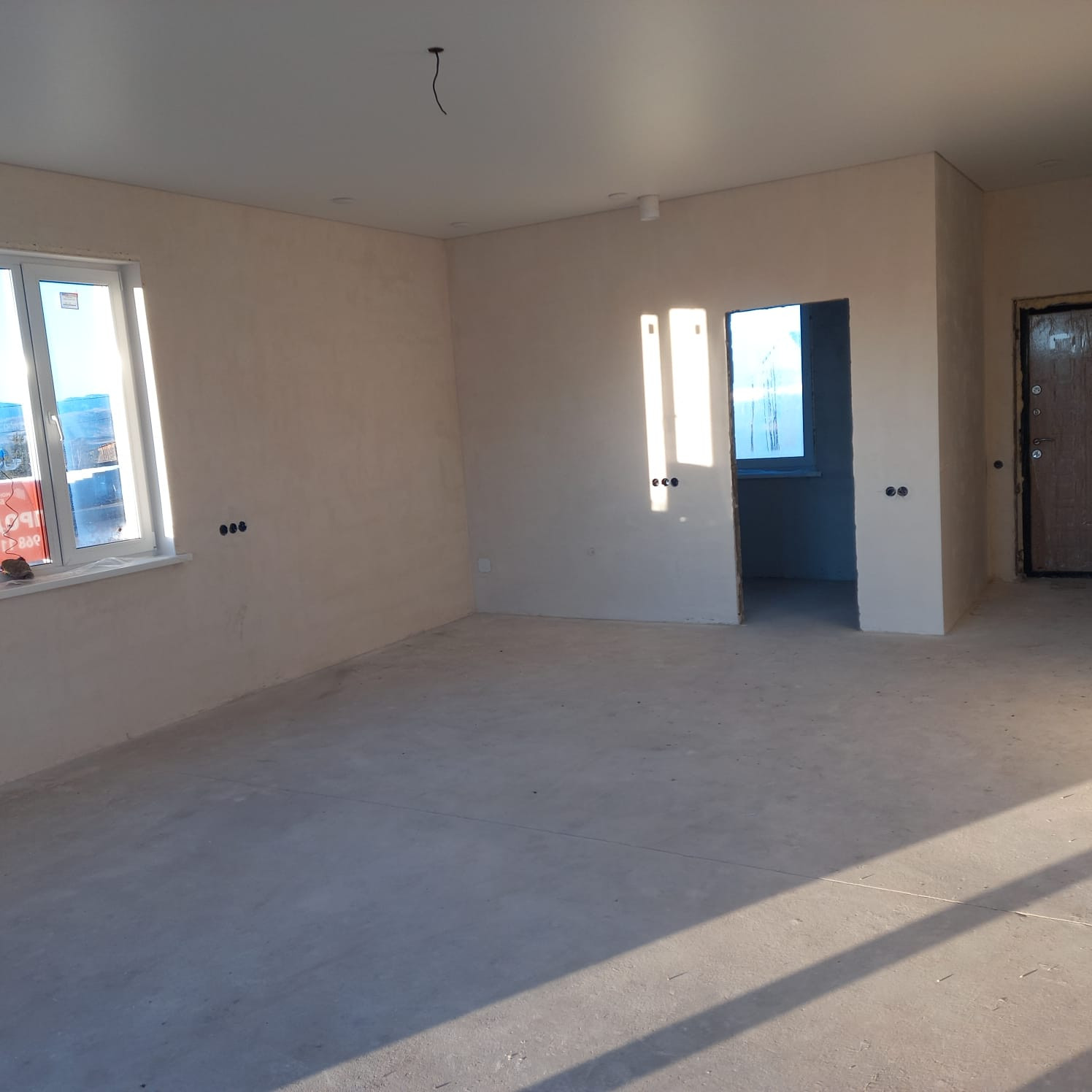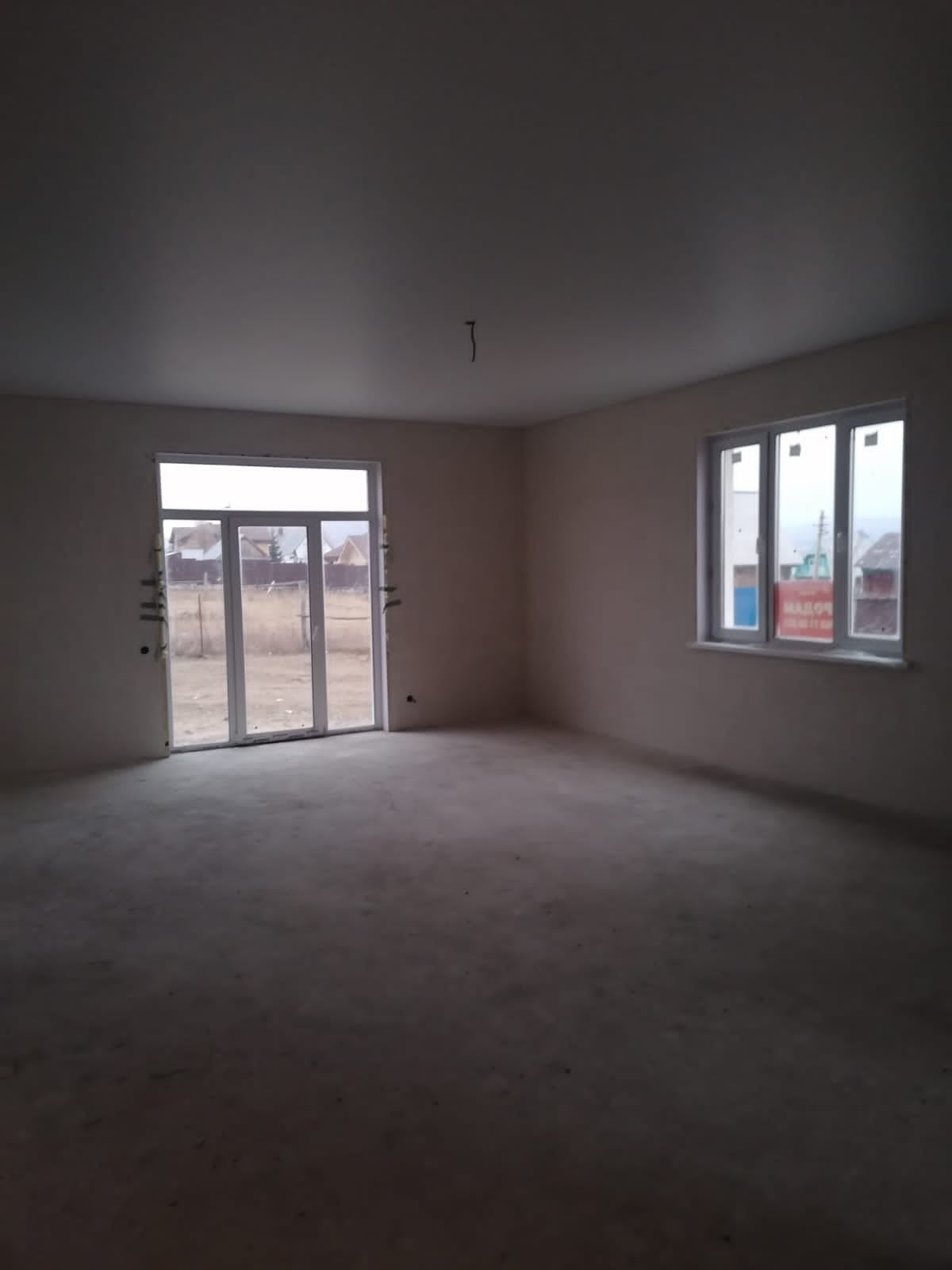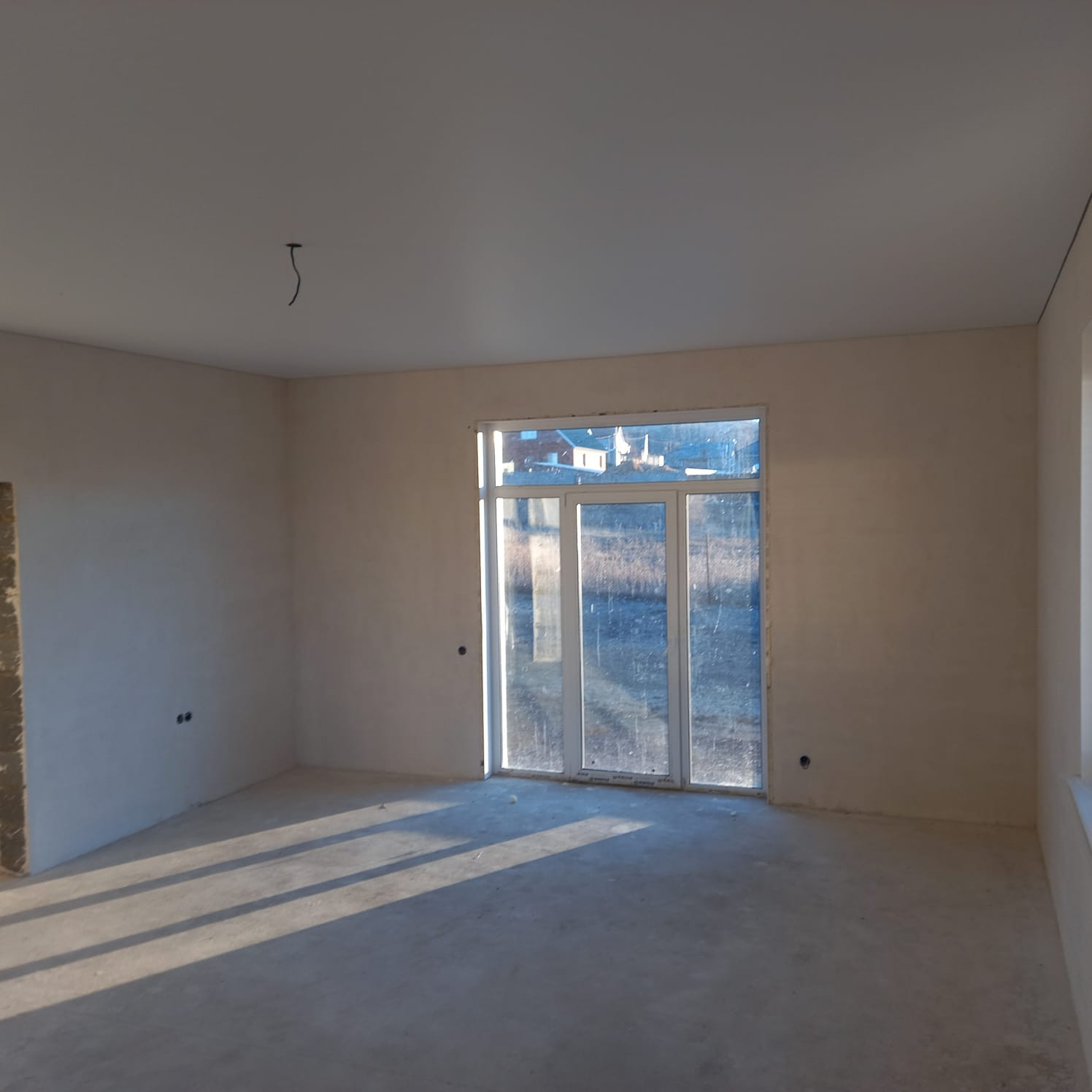 Внутри выполнена предчистовая отделка: стены выровнены под обои, пол полусухая стяжка, натяжные потолки, электричество по дому разведено.