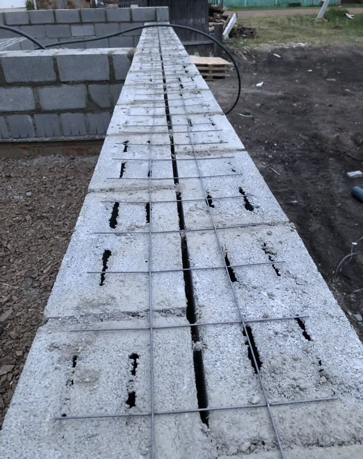 Кирпичный армопояс между лентой и шлакоблоком высотой 300 мм.