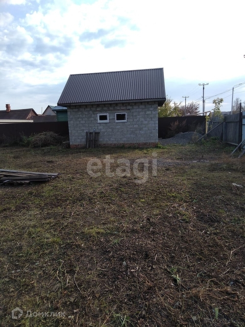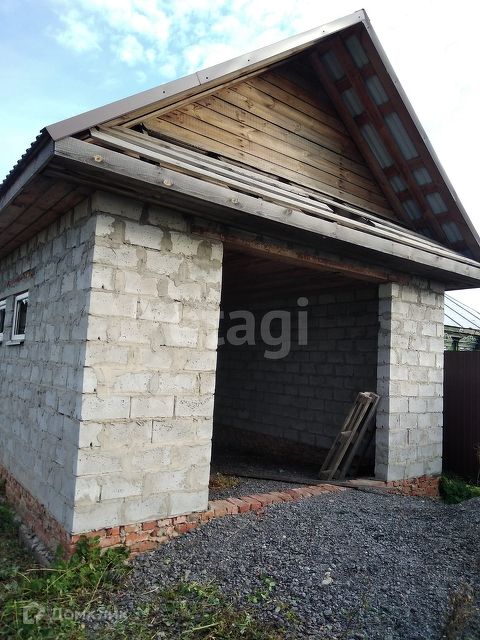 На участке гараж - газосиликатный блок и деревянная баня,