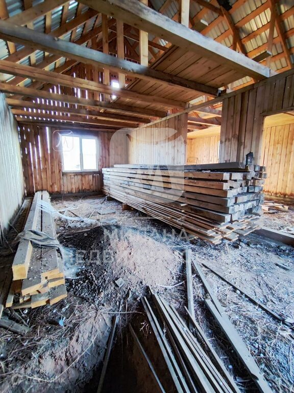 Дом построен из 150-го бруса. Брус скреплен скобами. Залит хороший фундамент. Внутри дома остались стройматериалы для дальнейшего строительства.
