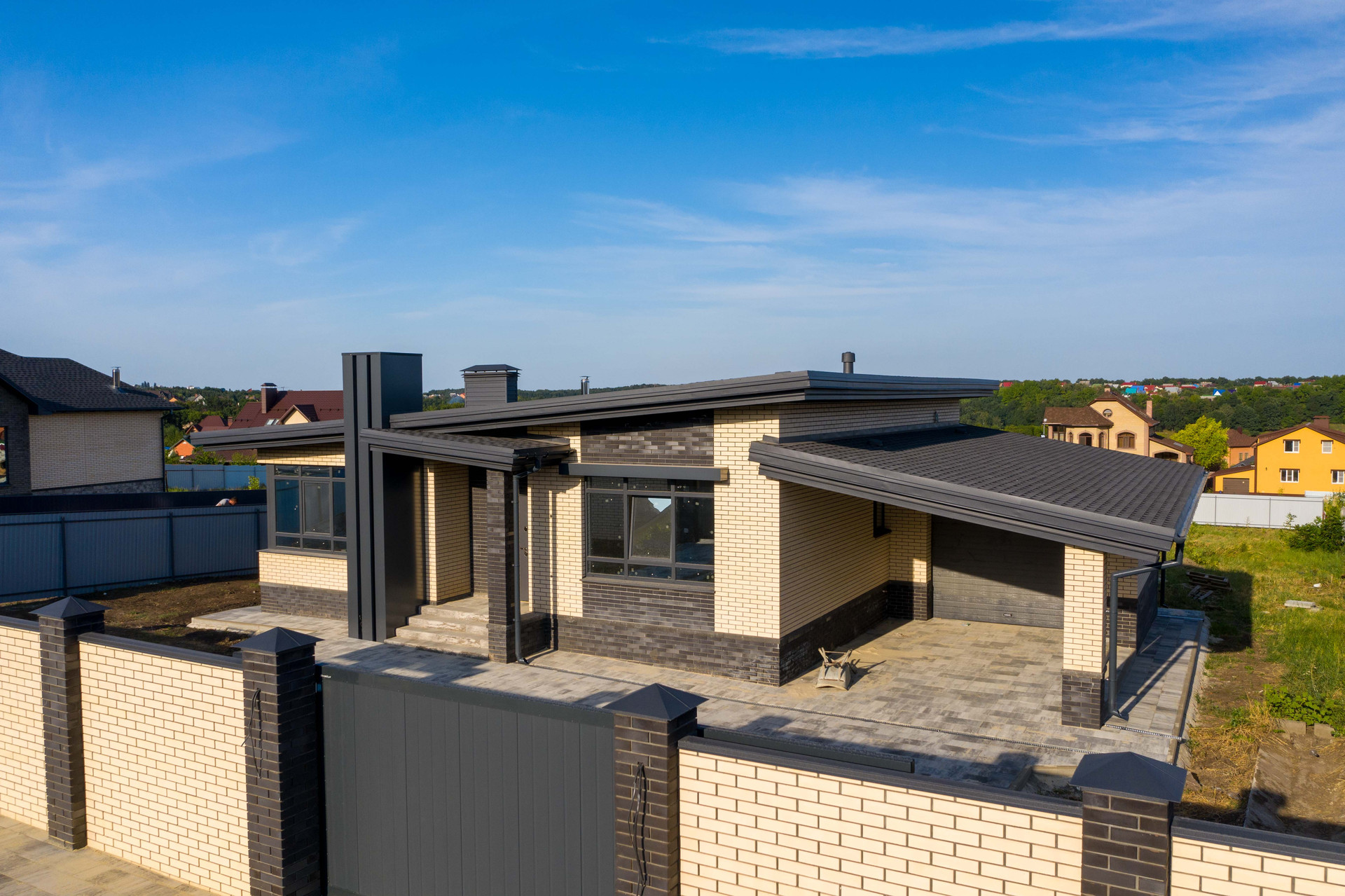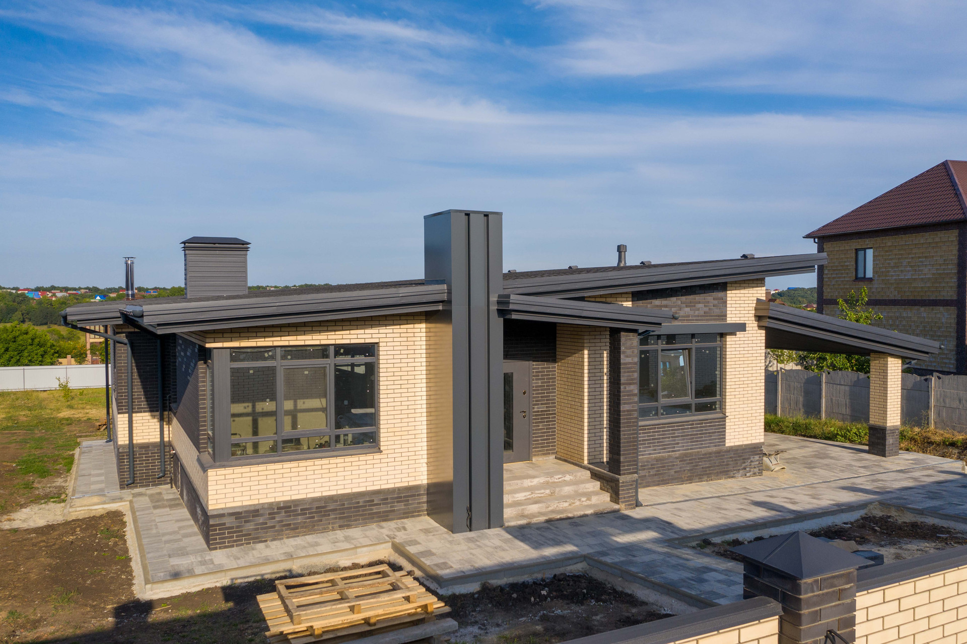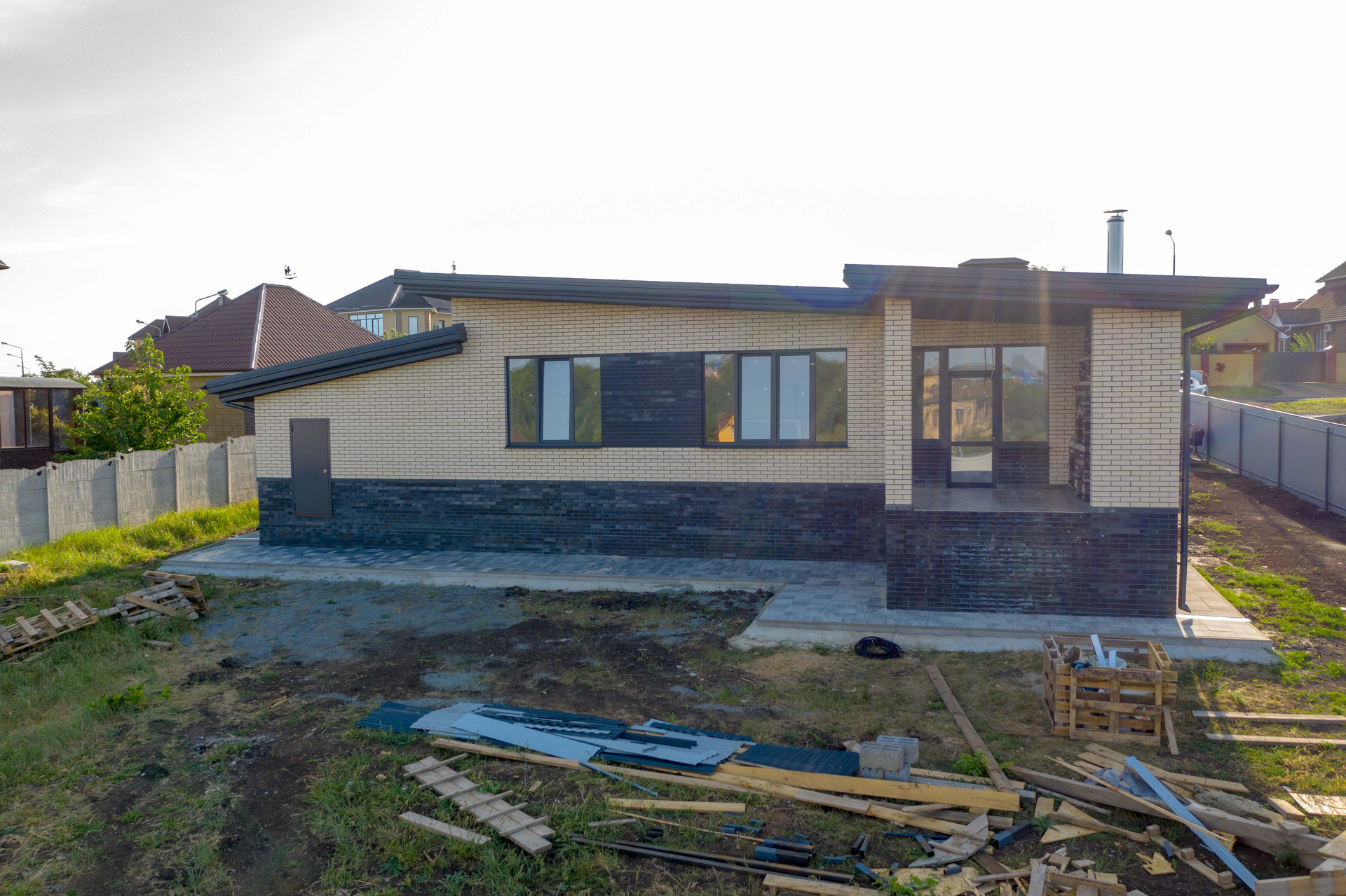 Построен из керамзитоблока,  утеплитель изовол два слоя 500 мм,  облицован кирпичом цвета солома. Крыша - металлочерепица, окна - ПВХ. Удобная планировка включает в себя 3 изолированные комнаты, кухня студия, два с\у. Газ, эл-во, вода.