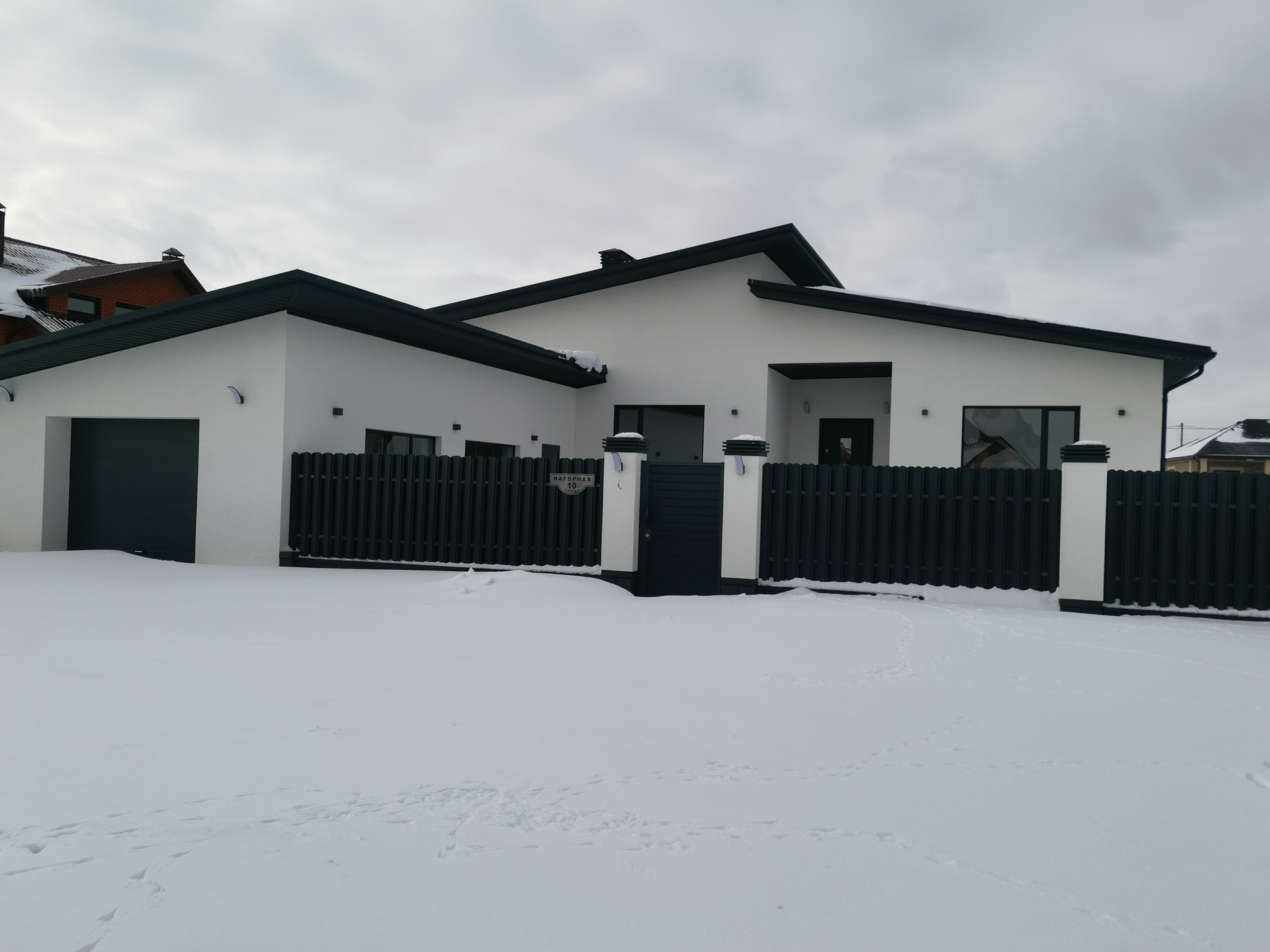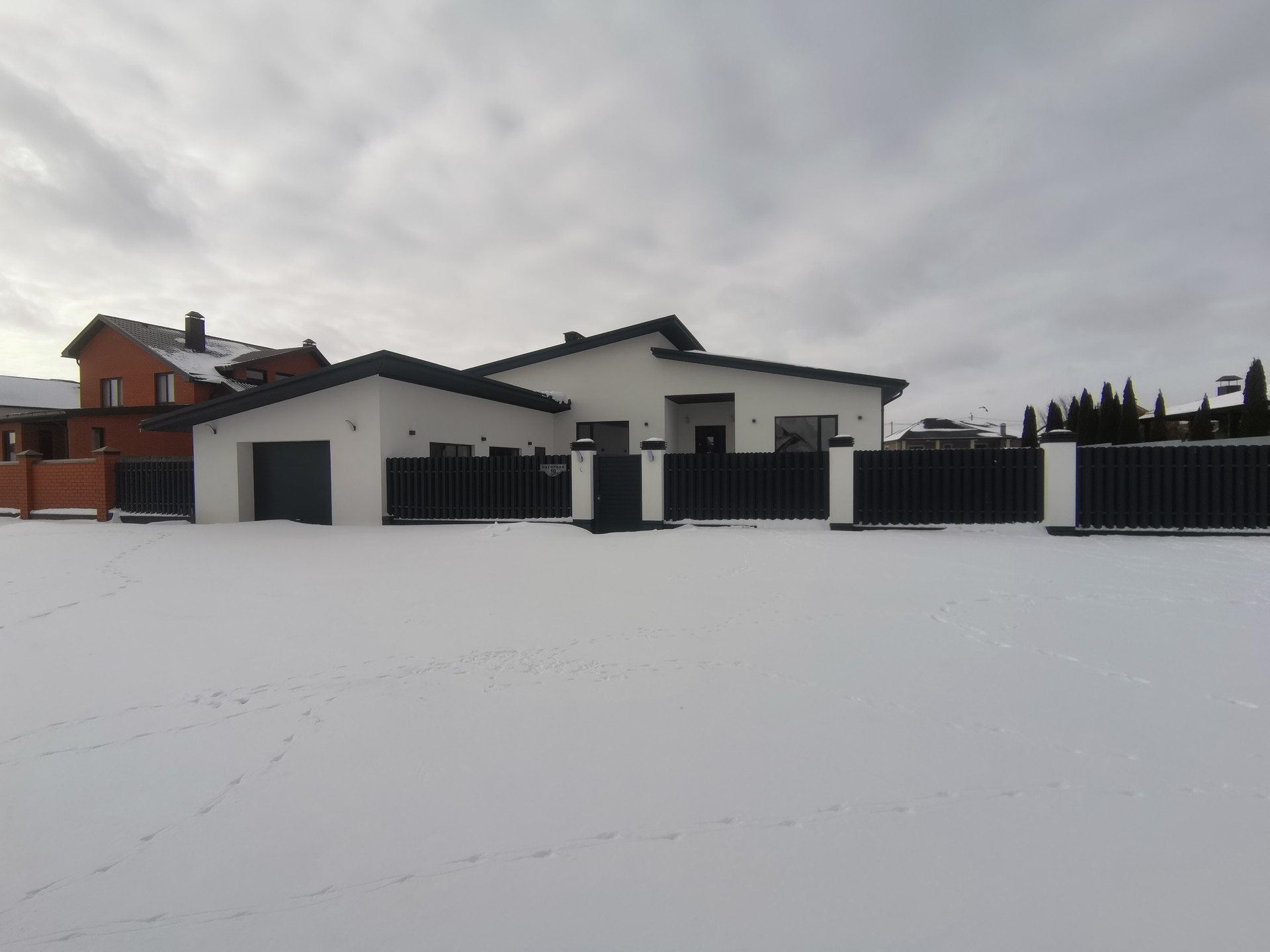 Дом огорожен по периметру  забором. Во дворе: тротуарная плитка.