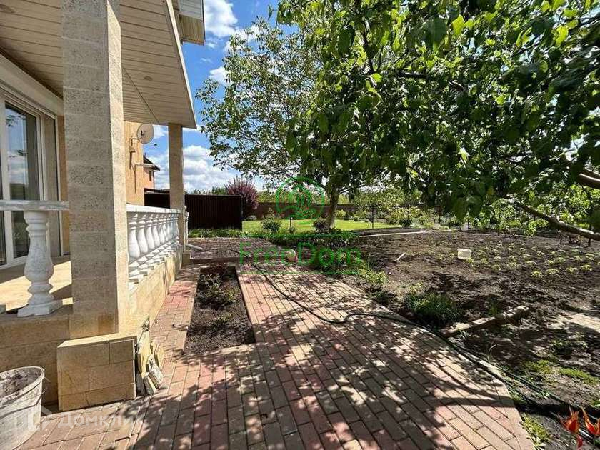 Посажен сад с плодоносящими деревьями, цветы, декоративные хвойные кустарники и сеть дорожек из тротуарной плитки - радует глаз и подчеркивает удобство ухода.