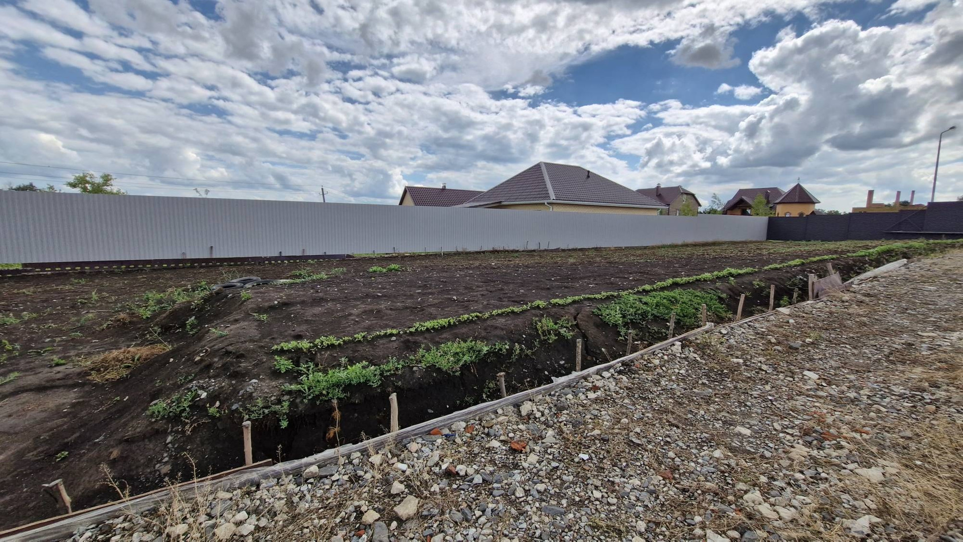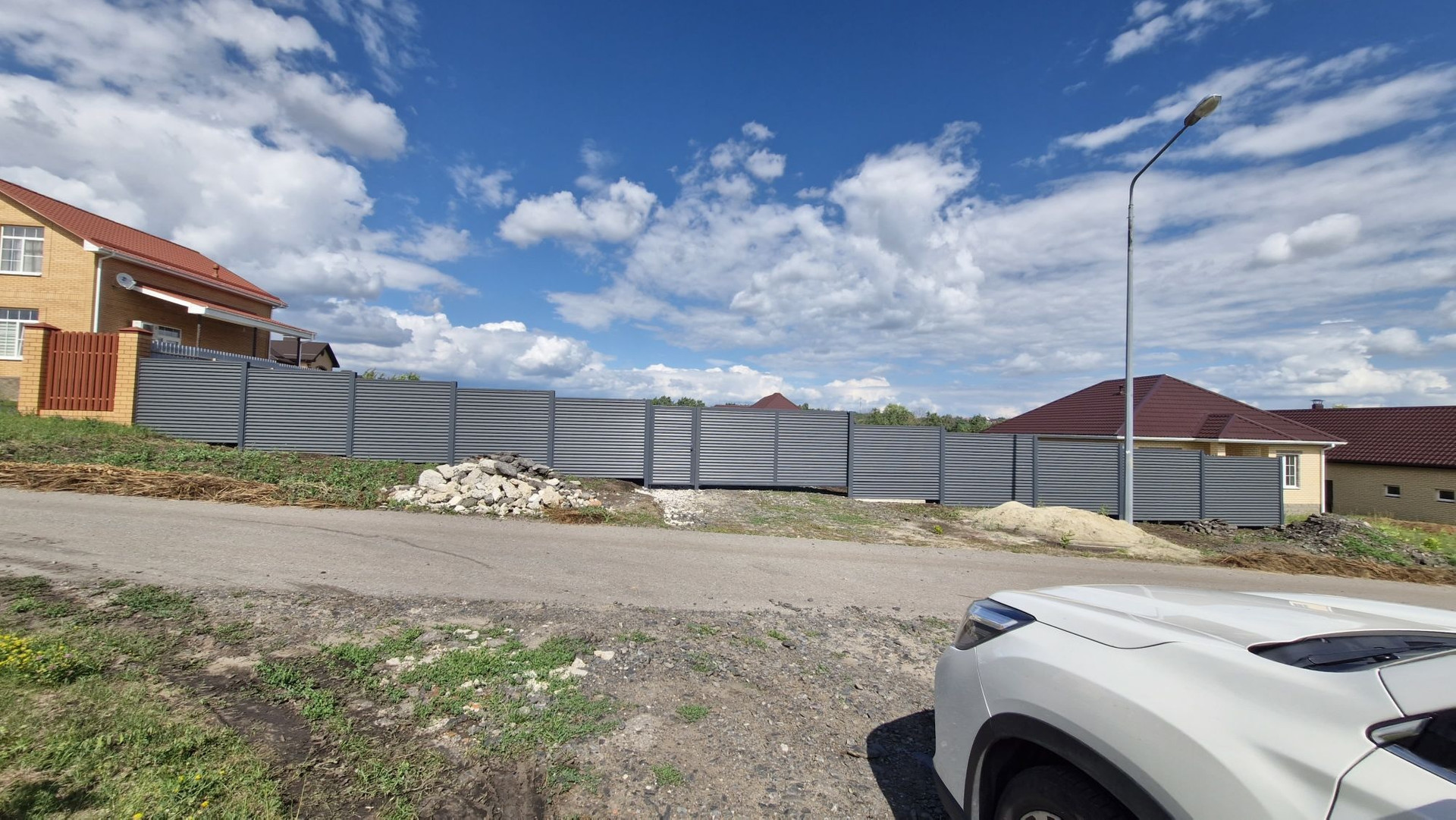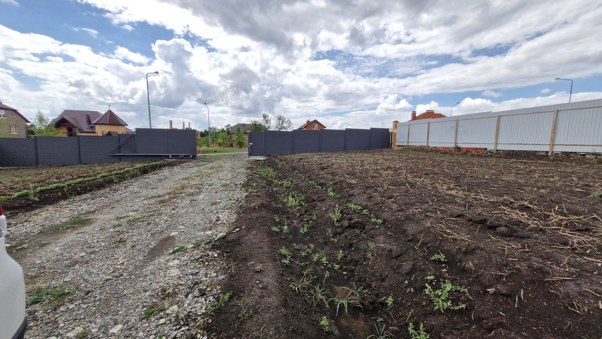 Участок огражден с 3-х сторон, по бокам и фасадная часть с откатными воротами и калиткой.