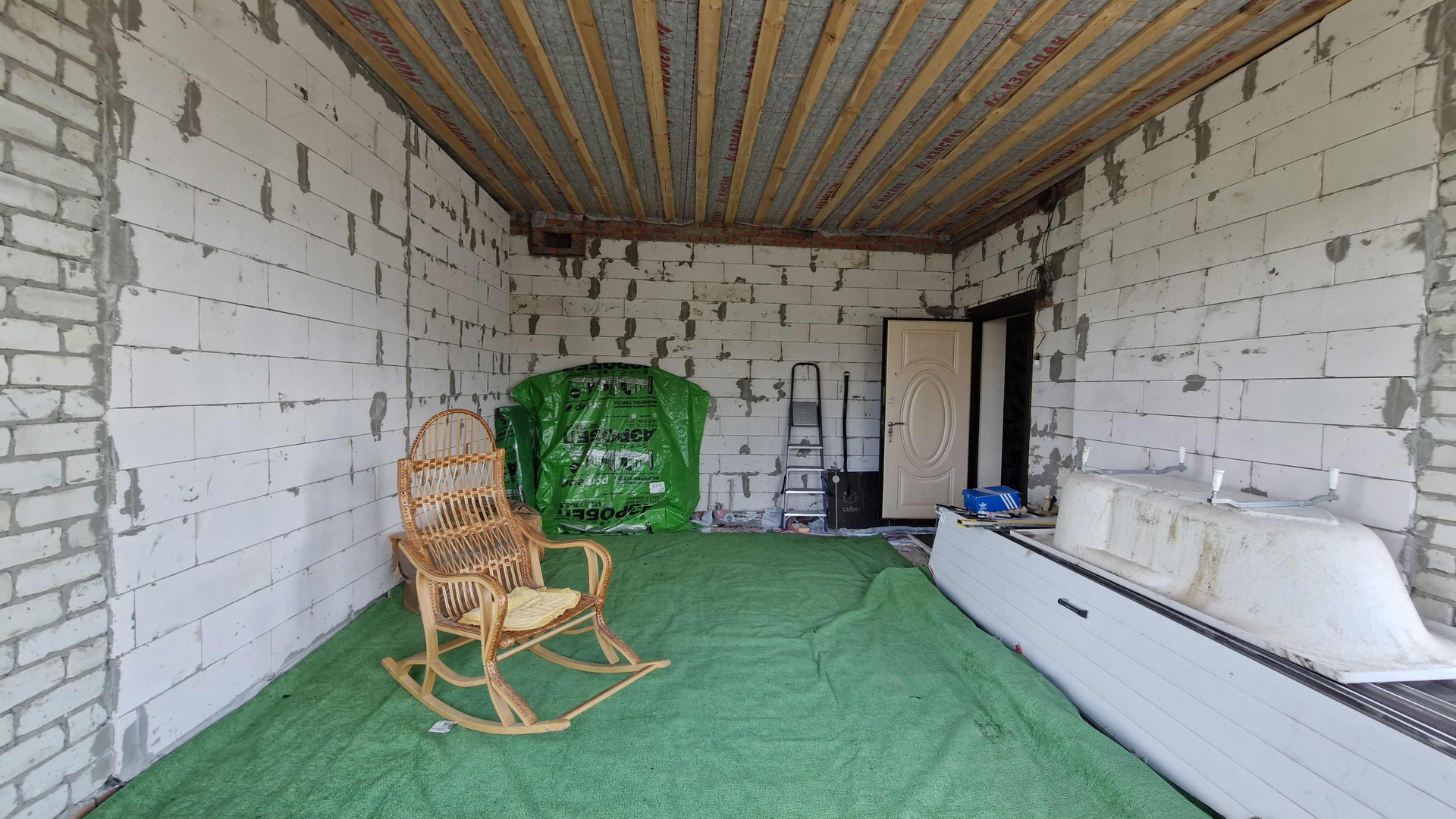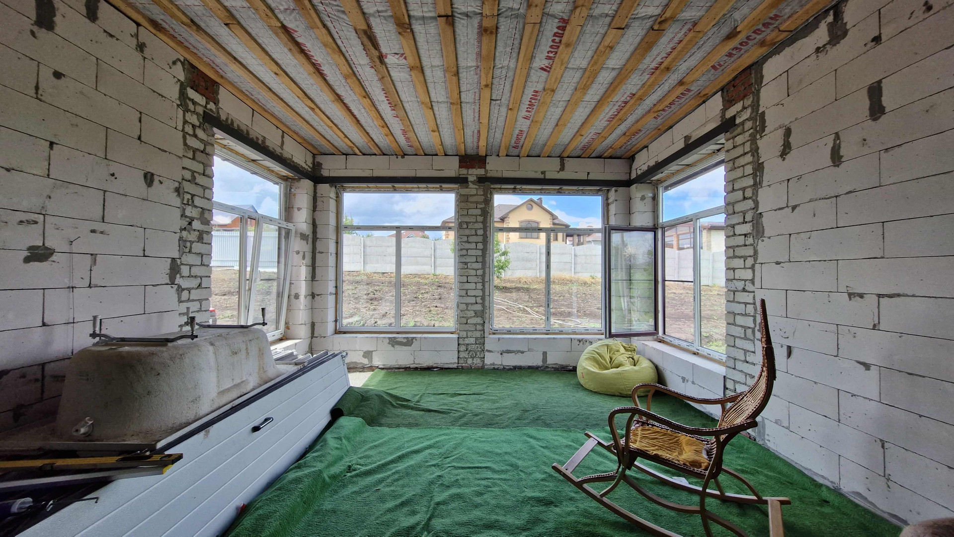 дом построен из пеноблока (аэробел), крыша металлочерепица (венге), утеплена в 3 слоя по 5 см изоволом (миниральная базальтовая вата) в шахматном порядке итого -