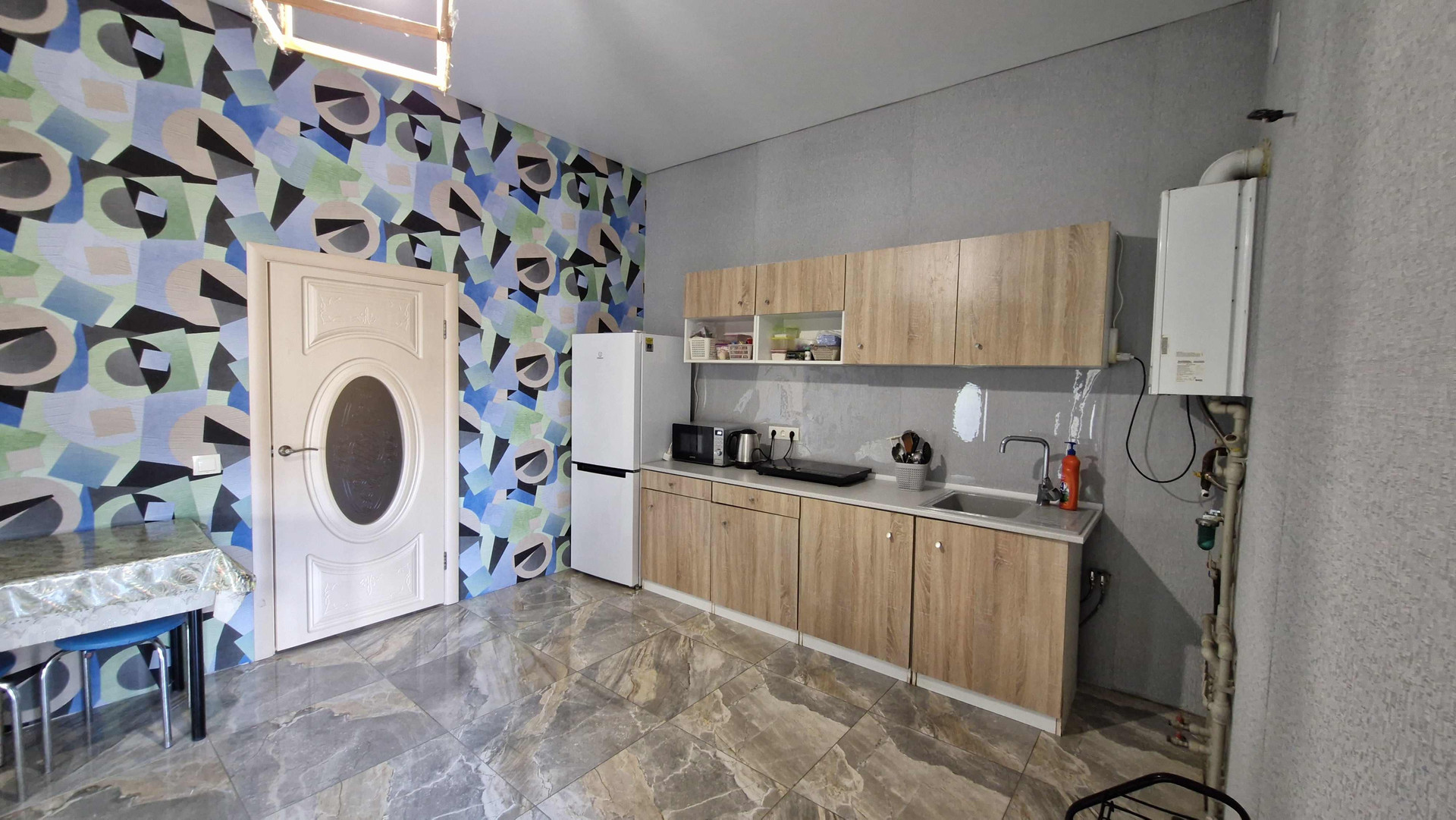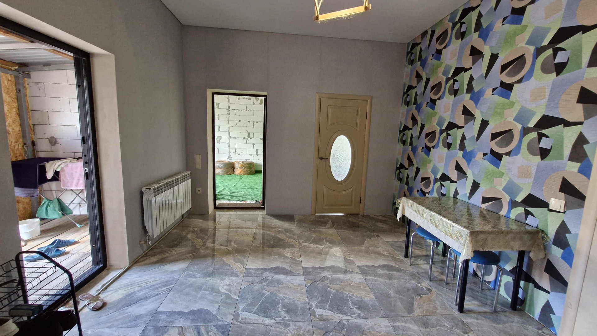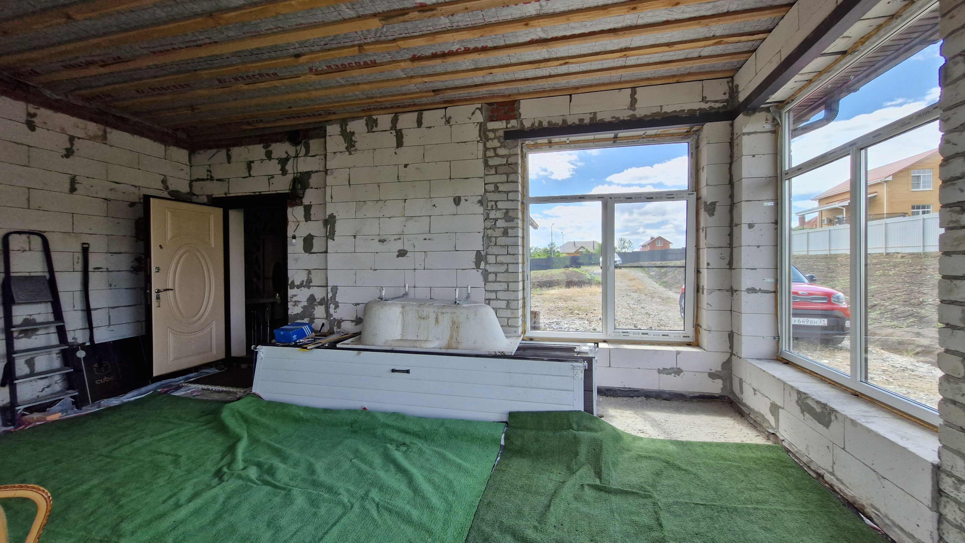 Кухня - гостинная площадью 30,6 кв.м. остеклена, без отделки, все коммуникации (вода, канализация, вентиляционная труба -сделаны), остальное нужно сделать, по своему вкусу и желанию.