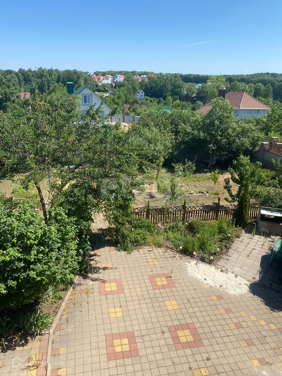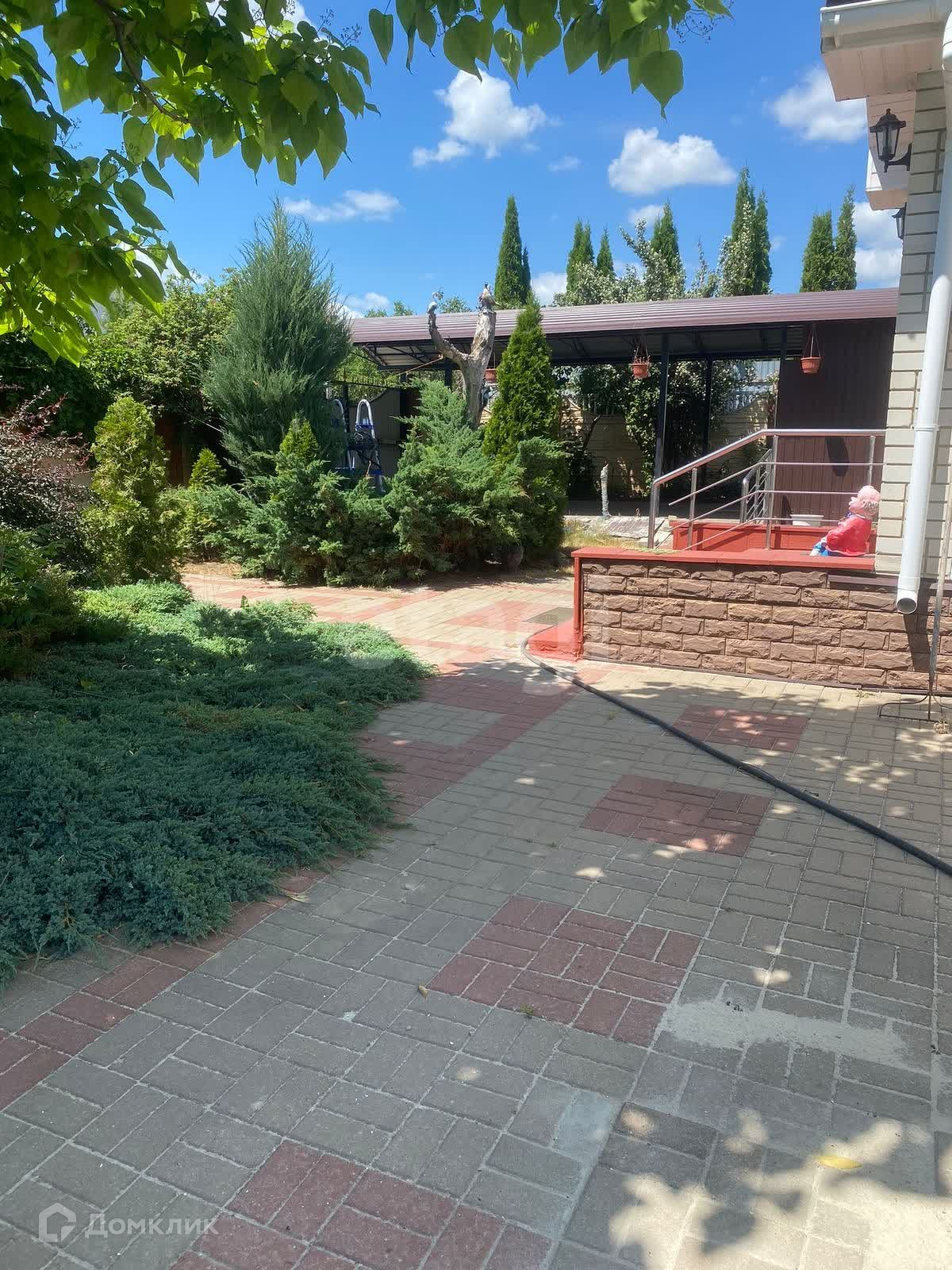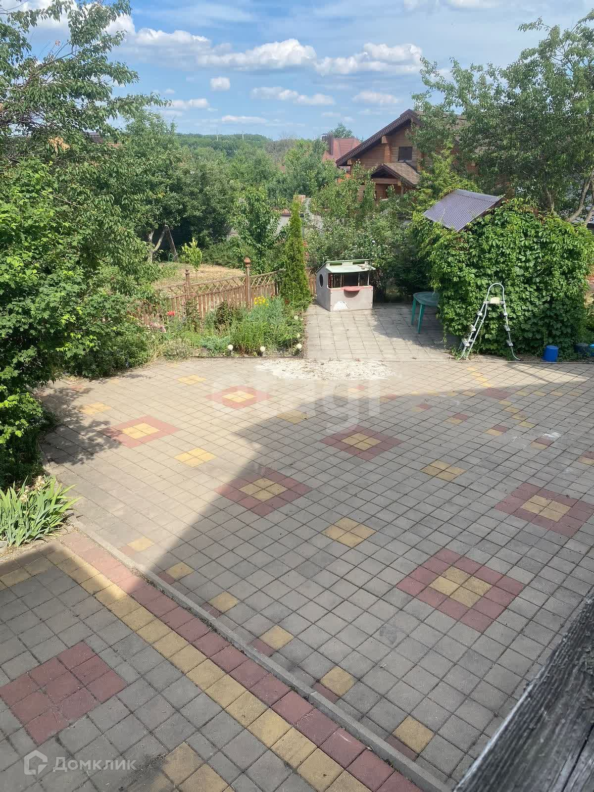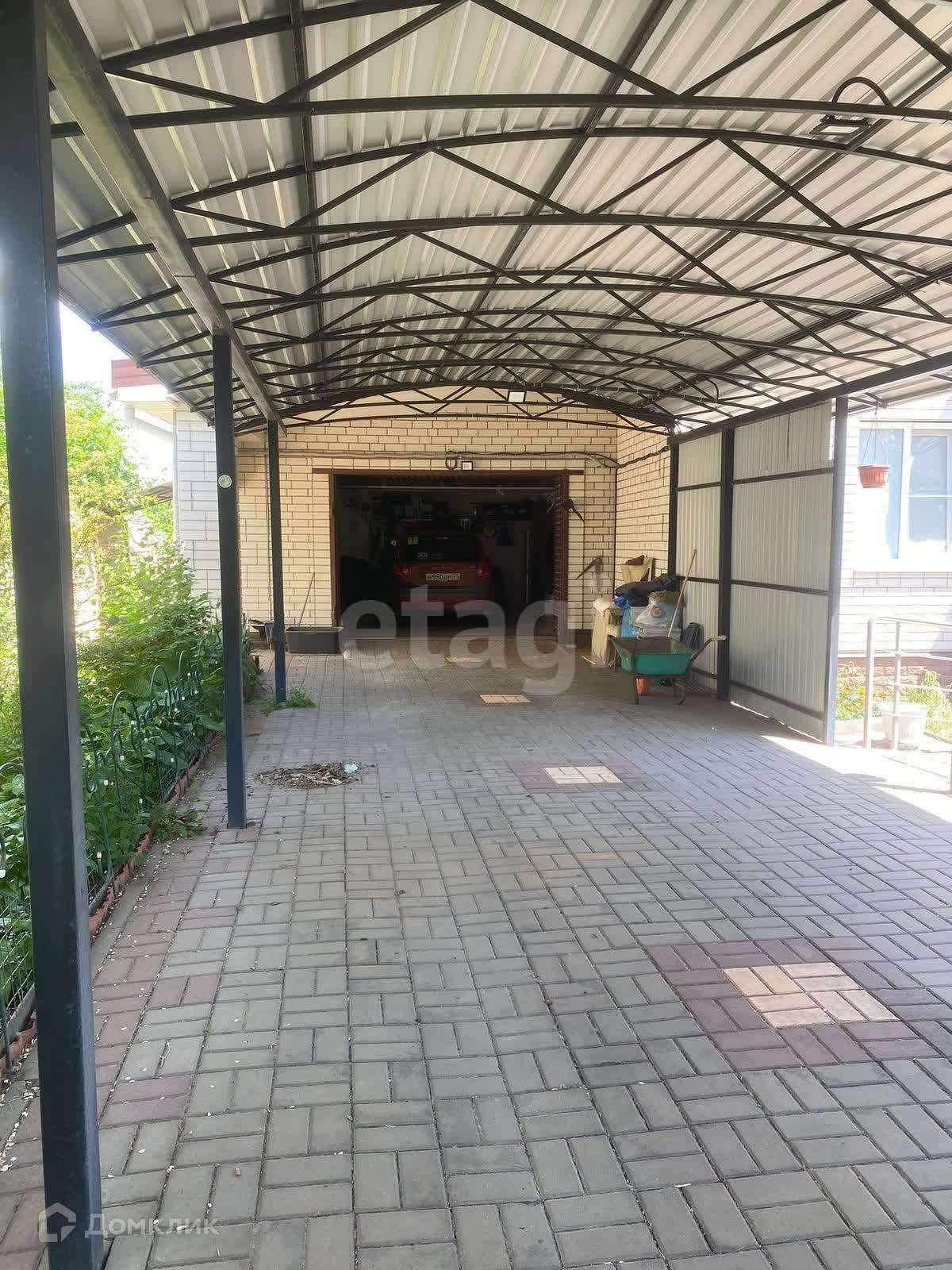 цветы. Двор выложен плиткой. Для машины есть навес и гараж.