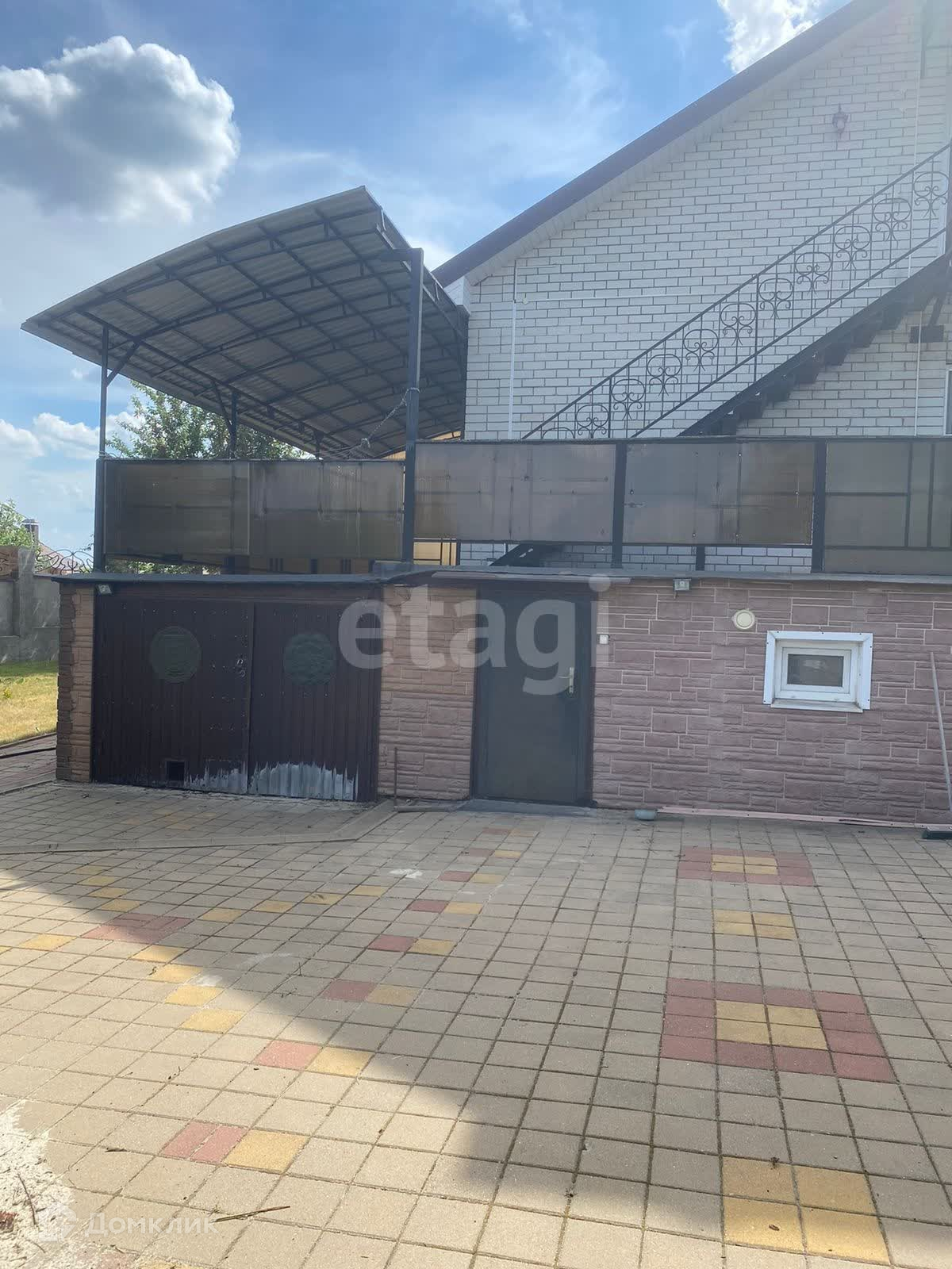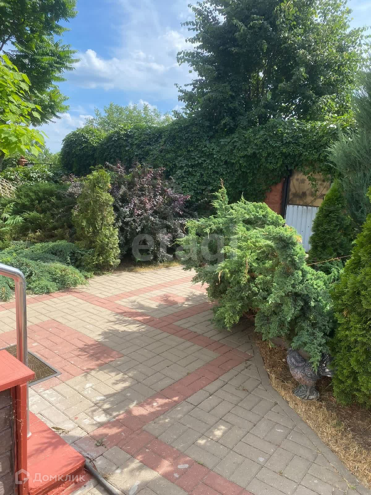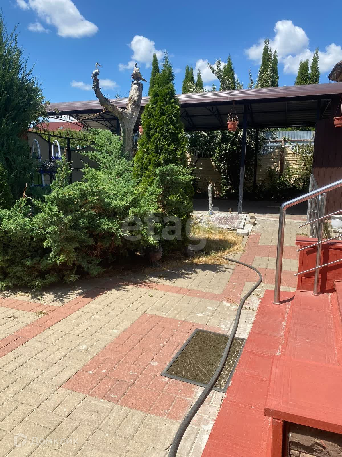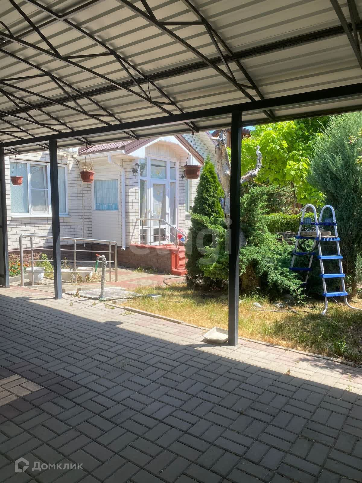 цветы. Двор выложен плиткой. Для машины есть навес и гараж.