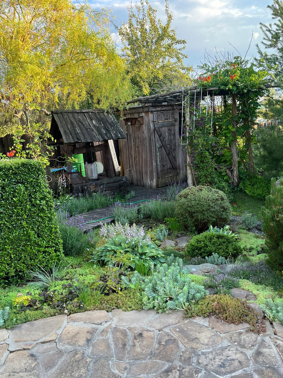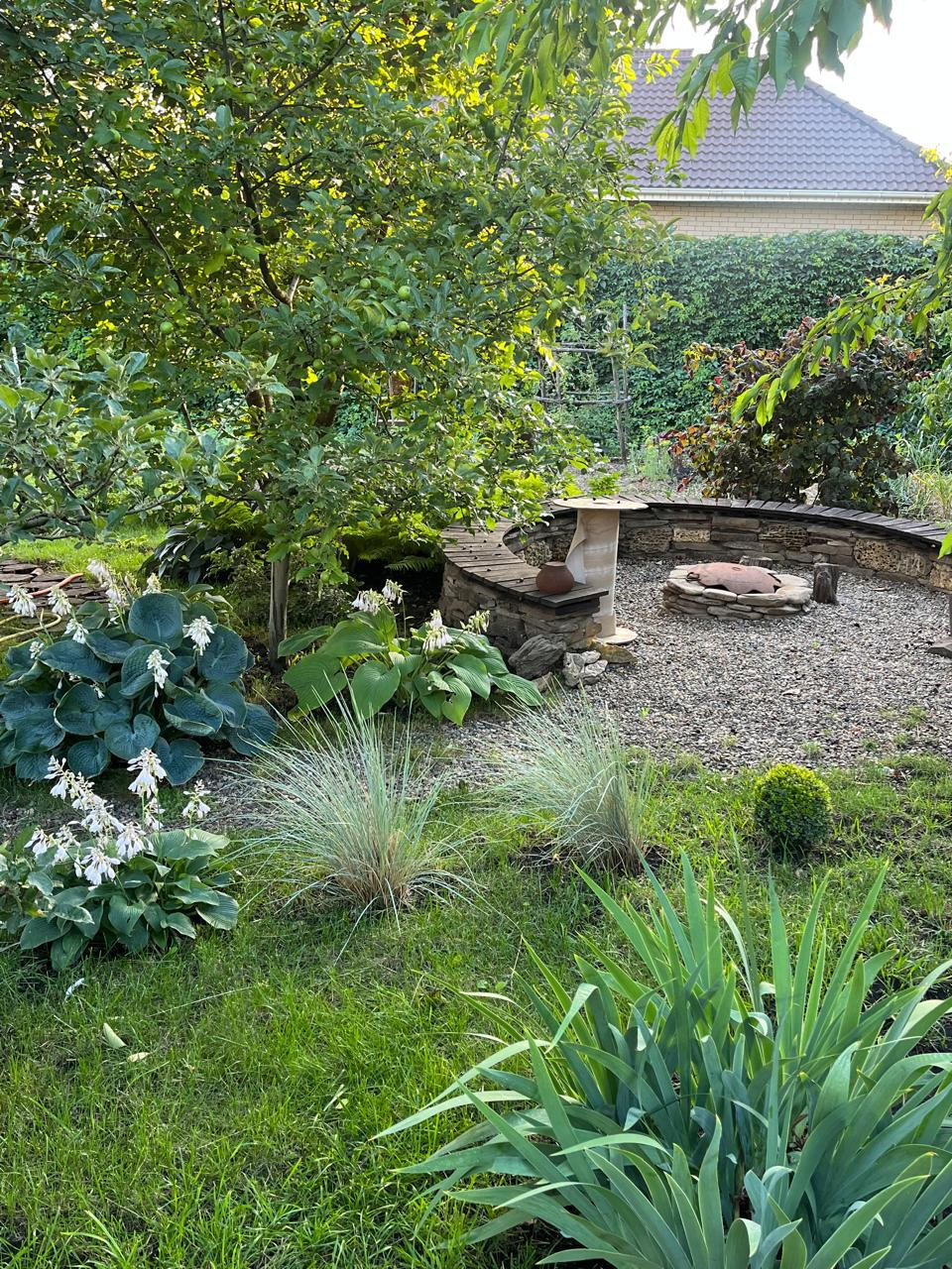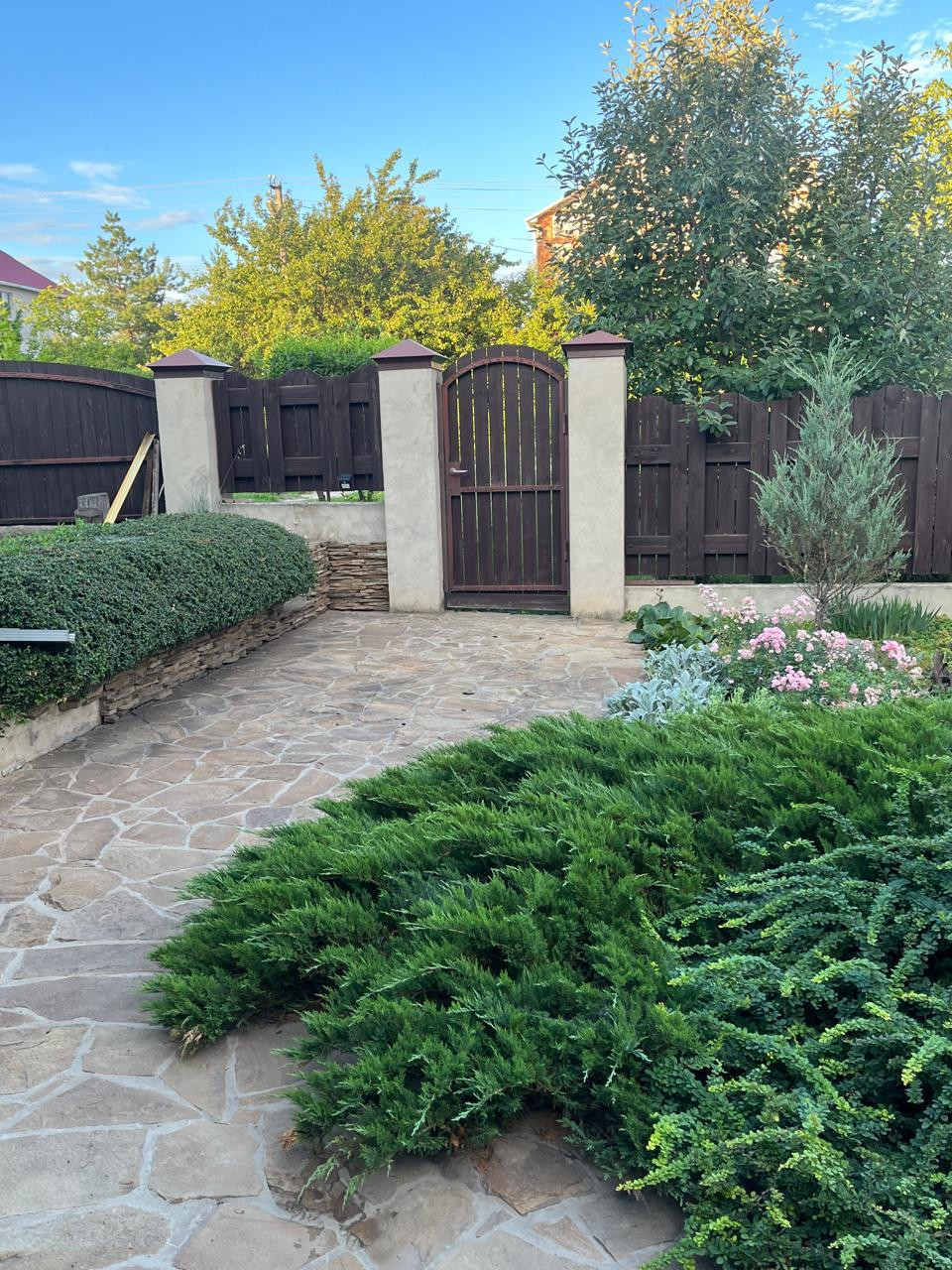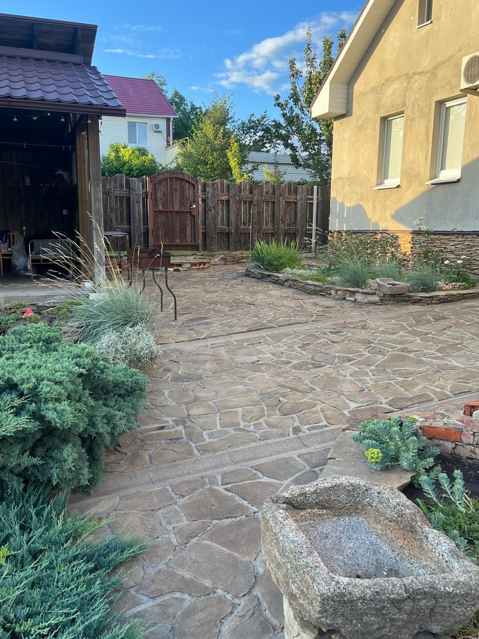За живой изгородью (расположенной за забором) находится плодовый сад .Забор по всему периметру участка ,выполнен из дерева.Уютная  деревянная беседка и очаг созданы для отдыха.Большая теплица.Летний душ.Отдельно стоящий гараж -30 кВ.м. и хозяйственное помещение 30 кВ.. с отделкой.В шаговой доступности остановка.